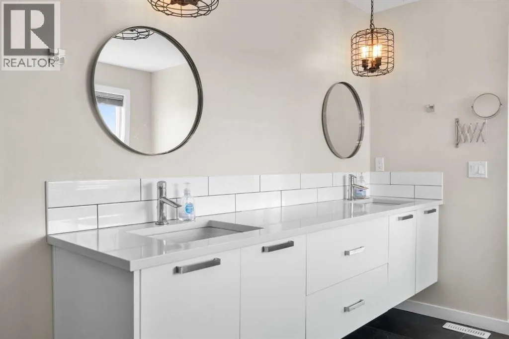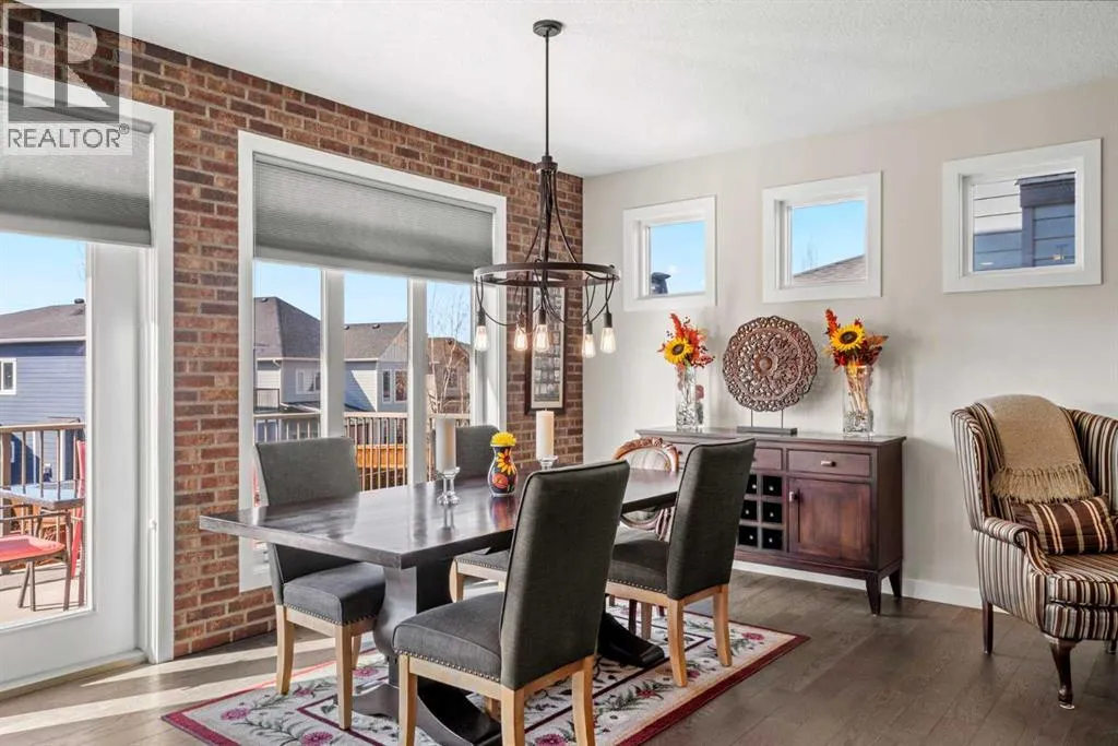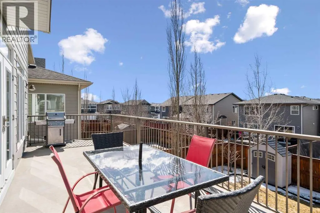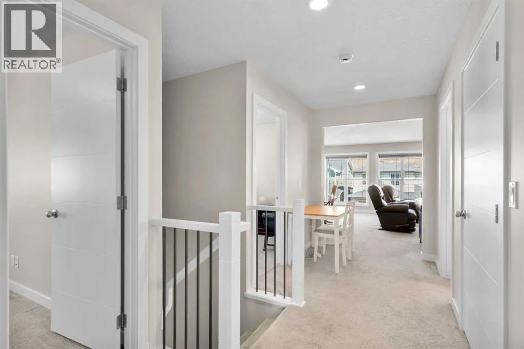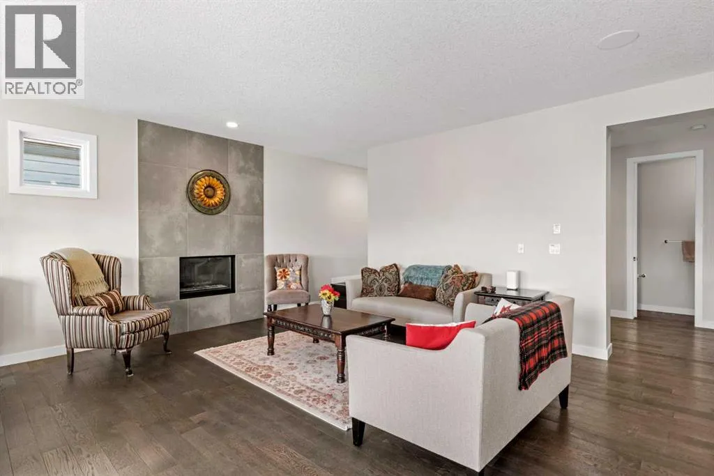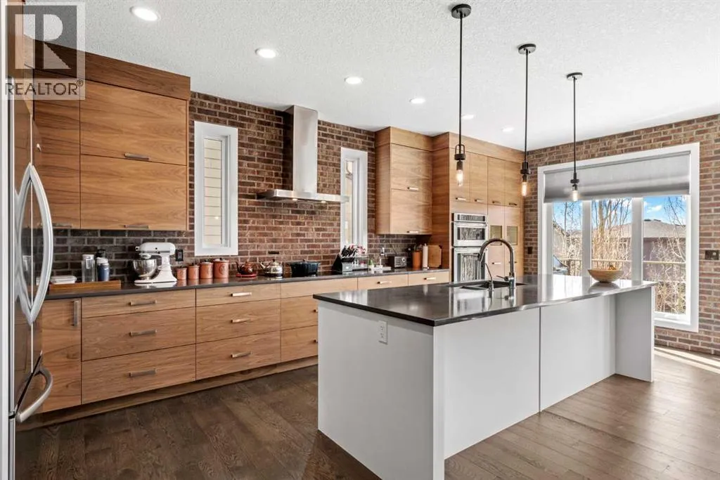 This exceptional contemporary estate residence in Riverstone by Cedarglen Homes offers 3,134 square feet of upgraded living space, perfectly suited for families & multi-generational living. Curb appeal is evident with extra wide exposed aggregate driveway, a spacious landing & a luxurious modern glass-paneled front door with sidelight panels. The expansive main level offers 9 foot knockdown ceilings, a seamless open concept layout, featuring a spacious living room with a sleek linear gas fireplace & full-height, large-scale tile. The bright dining area features a brick facade & premium, full-height west facing casement windows that bathe the space in natural light. The gourmet kitchen is both functional & refined, showcasing full height, book matched flat panel walnut cabinetry, a distinctive brick façade backsplash, quartz countertops, a massive island complete with an undermount sink, beverage fridge, dishwasher, inviting breakfast bar seating & a premium appliance package. Upstairs, the primary bedroom offers a spa-inspired 5 piece ensuite complete with dual sinks set in a floating cabinet, a soaker tub, an oversized double shower with a seating bench & full height subway tile, built-in linen storage & direct access to an expansive walk-in closet. The large bonus room, featuring a vaulted style ceiling, built-in speakers & abundant windows creates a warm & versatile gathering space. Two great sized bedrooms share a thoughtfully designed five piece bathroom with an extra wide double sink vanity, a raised cabinet, a subway tile backsplash, tiled flooring, plus a separate water closet, tub & shower room. The spacious laundry room has upper cabinets, a hanging rod & tile flooring. The fully developed walkout basement presents a self-contained living space ideal for extended family or guests, featuring a complete kitchen with high gloss flat panel cabinetry, subway tile backsplash, full sized appliances & a stylish 3 piece bathroom with a full width, tiled shower. The spacious bedroom features a massive egress window & white brick feature wall. The large living area has its own feature wall & luxury vinyl plank flooring, separate heating control, a dedicated stackable laundry set, dual French doors open onto a full width wood plank covered balcony overlooking the expansive, west facing, fully fenced backyard, landscaped with mature columnar aspen trees. The oversized 24â x 22â garage is fully insulated & drywalled. It is equipped with a gas heater, an 8 foot high door & a convenient mezzanine style storage area. Outdoor living is equally impressive, with a full-width, extra deep west facing Duradeck balcony designed for relaxation & entertaining. Highlights include engineered hardwood flooring, built-in speakers, elegant brick wall treatments, metal spindles, triple glazed casement windows with premium blinds, a Kinetico water system, soundproofed lower level insulation, gas lines to both the BBQ & kitchen plus a professionally landscaped yard. (id:27476)