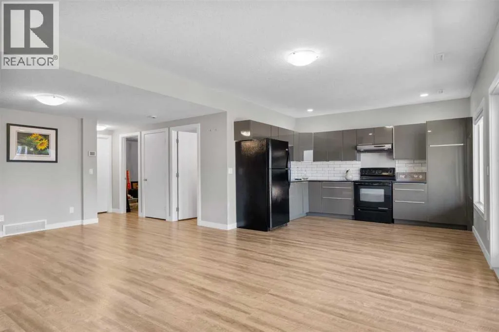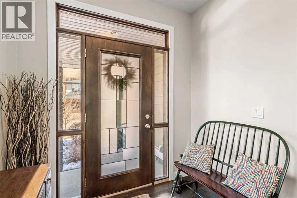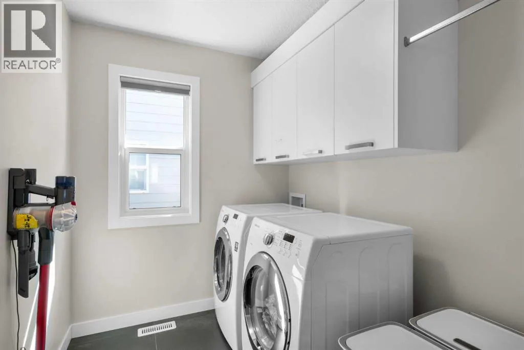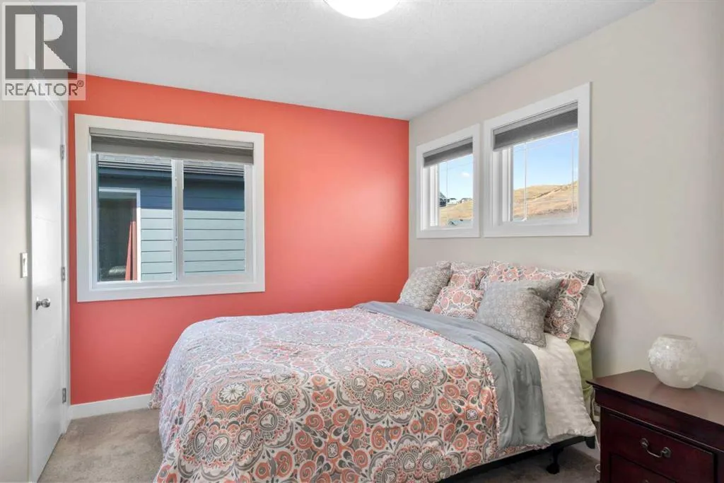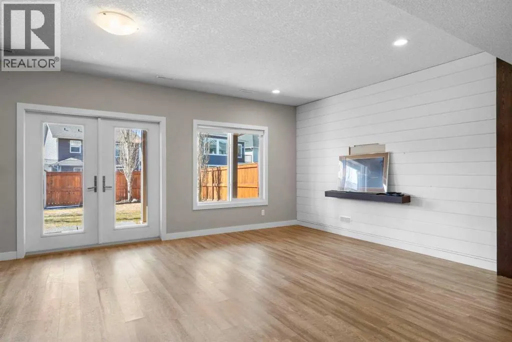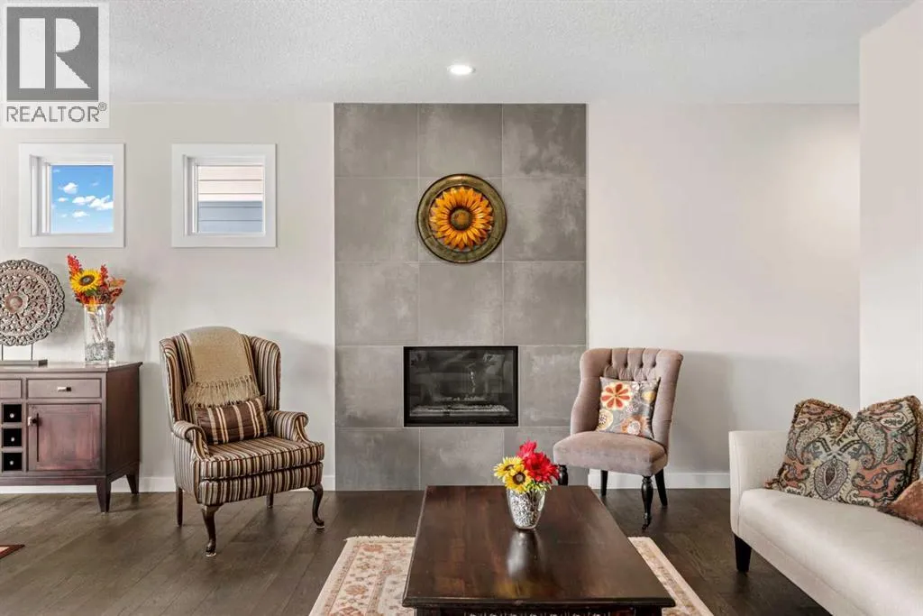 This exceptional contemporary estate residence in Riverstone by Cedarglen Homes offers 3,134 square feet of upgraded living space, perfectly suited for families & multi-generational living. Curb appeal is evident with extra wide exposed aggregate driveway, a spacious landing & a luxurious modern glass-paneled front door with sidelight panels. The expansive main level offers 9 foot knockdown ceilings, a seamless open concept layout, featuring a spacious living room with a sleek linear gas fireplace & full-height, large-scale tile. The bright dining area features a brick facade & premium, full-height west facing casement windows that bathe the space in natural light. The gourmet kitchen is both functional & refined, showcasing full height, book matched flat panel walnut cabinetry, a distinctive brick façade backsplash, quartz countertops, a massive island complete with an undermount sink, beverage fridge, dishwasher, inviting breakfast bar seating & a premium appliance package. Upstairs, the primary bedroom offers a spa-inspired 5 piece ensuite complete with dual sinks set in a floating cabinet, a soaker tub, an oversized double shower with a seating bench & full height subway tile, built-in linen storage & direct access to an expansive walk-in closet. The large bonus room, featuring a vaulted style ceiling, built-in speakers & abundant windows creates a warm & versatile gathering space. Two great sized bedrooms share a thoughtfully designed five piece bathroom with an extra wide double sink vanity, a raised cabinet, a subway tile backsplash, tiled flooring, plus a separate water closet, tub & shower room. The spacious laundry room has upper cabinets, a hanging rod & tile flooring. The fully developed walkout basement presents a self-contained living space ideal for extended family or guests, featuring a complete kitchen with high gloss flat panel cabinetry, subway tile backsplash, full sized appliances & a stylish 3 piece bathroom with a full width, tiled shower. The spacious bedroom features a massive egress window & white brick feature wall. The large living area has its own feature wall & luxury vinyl plank flooring, separate heating control, a dedicated stackable laundry set, dual French doors open onto a full width wood plank covered balcony overlooking the expansive, west facing, fully fenced backyard, landscaped with mature columnar aspen trees. The oversized 24â x 22â garage is fully insulated & drywalled. It is equipped with a gas heater, an 8 foot high door & a convenient mezzanine style storage area. Outdoor living is equally impressive, with a full-width, extra deep west facing Duradeck balcony designed for relaxation & entertaining. Highlights include engineered hardwood flooring, built-in speakers, elegant brick wall treatments, metal spindles, triple glazed casement windows with premium blinds, a Kinetico water system, soundproofed lower level insulation, gas lines to both the BBQ & kitchen plus a professionally landscaped yard. (id:27476)