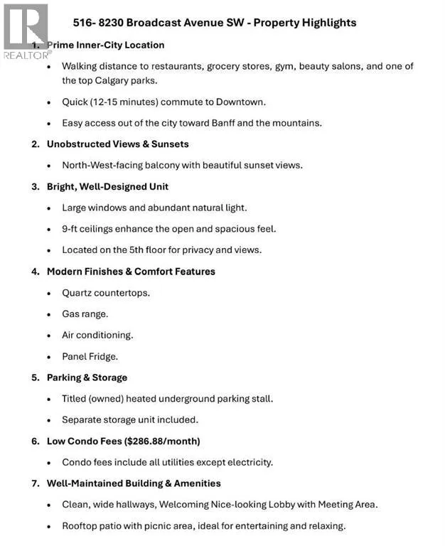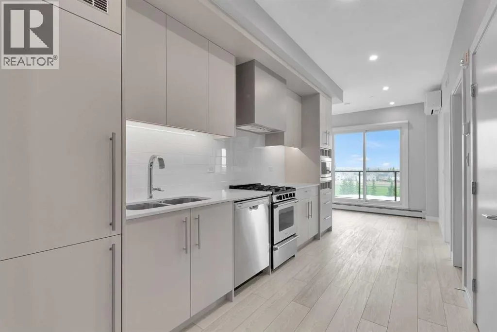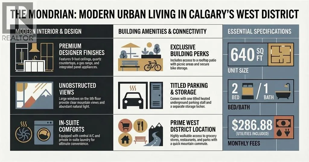 BRAND NEW, NEVER OCCUPIED 2-BEDROOM unit on the 5TH FLOOR with SUNSET AND MOUNTAIN VIEWS and WINDOWS NOT FACING OTHER BUILDINGS, offering added privacy and natural light. Bright and open layout with LARGE WINDOWS, 9-FT CEILINGS, and MODERN WINDOW COVERINGS throughout.Contemporary kitchen with QUARTZ COUNTERTOPS, GAS RANGE, and PANEL FRIDGE. Includes CENTRAL A/C, IN-SUITE LAUNDRY, TITLED HEATED UNDERGROUND PARKING, SEPARATE STORAGE UNIT, and BIKE STORAGE.Enjoy LOW CONDO FEES (UTILITIES INCLUDED EXCEPT ELECTRICITY), CLEAN WIDE HALLWAYS, and a ROOFTOP PATIO WITH PICNIC AREA. Located in WEST DISTRICT with WALKING DISTANCE TO RESTAURANTS, GROCERY STORES, AND PARKS, QUICK COMMUTE TO DOWNTOWN, and EASY ACCESS TO BANFF, BRAGG CREEK, AND THE MOUNTAINS. (id:27476)