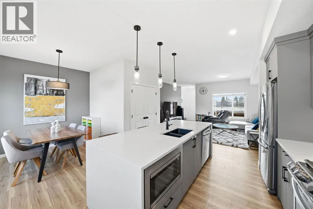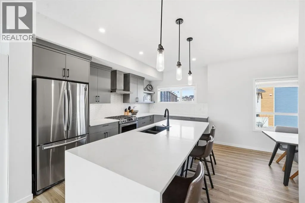 Welcome to this beautifully designed townhome in the highly sought-after community of Harvest Hills. Offering thoughtful layout, elegant finishes, and an exceptional location with serene pond views.Built with premium features from the builder, this home showcases quality and style from the moment you walk in. Youâre greeted by a spacious office/denâperfect for working from home or creating a quiet retreat. The second level features a bright, south-facing living room overlooking the pond, filled with natural light and designed for both relaxation and entertaining. From the living room, step out onto your spacious patio, perfectly positioned to take in the tranquil pond views. Complete with a gas line for your BBQ, this outdoor space is ideal for summer entertaining, morning coffee, or simply unwinding in natureâs backdrop.The gourmet kitchen flows seamlessly from the living area, complete with stainless steel appliances, a gas range, a stunning waterfall island, and a spacious dining area ideal for hosting family and friends. A convenient 2-piece powder room completes this level.Upstairs, youâll find a gorgeous primary bedroom retreat with a beautifully appointed 4-piece ensuite, featuring a double vanity at an accessible height and a large walk-in closet. Two additional generously sized bedrooms, a second well-appointed 4-piece bathroom, and a convenient upper-floor laundry room provide excellent functionality for families or guests.Additional highlights include a double attached garage with an electric heater, panel LED lighting in the garage, central air conditioning, and a Culligan water softener, enhancing comfort and convenience throughout the home.Located close to Harvest Hills Crossing and Country Hills Town Centre, you have shopping, groceries, restaurants, services, and everyday conveniences just minutes away. Quality schools are nearby including Ascension of Our Lord School, Northern Lights School, and Notre Dame High School, making this communit y ideal for families. With easy access to major routes like Stoney Trail and Deerfoot Trail, commuting across Calgary is quick and convenient.Enjoy a scenic walking path that wraps around the pond, right outside your front door, perfect for morning strolls, evening walks, or jogging.Harvest Hills is known for its family-friendly atmosphere, peaceful lakes, and abundant green space. Offering lifestyle, location, and convenience all in one.A rare opportunity to own a pond-facing townhome with seamless indoor-outdoor flow in one of Calgaryâs most desirable north communities, book your showing today! (id:27476)