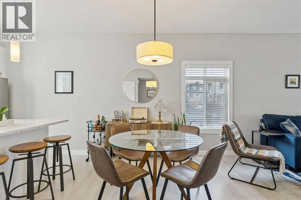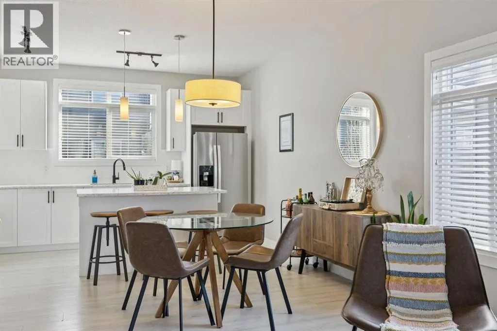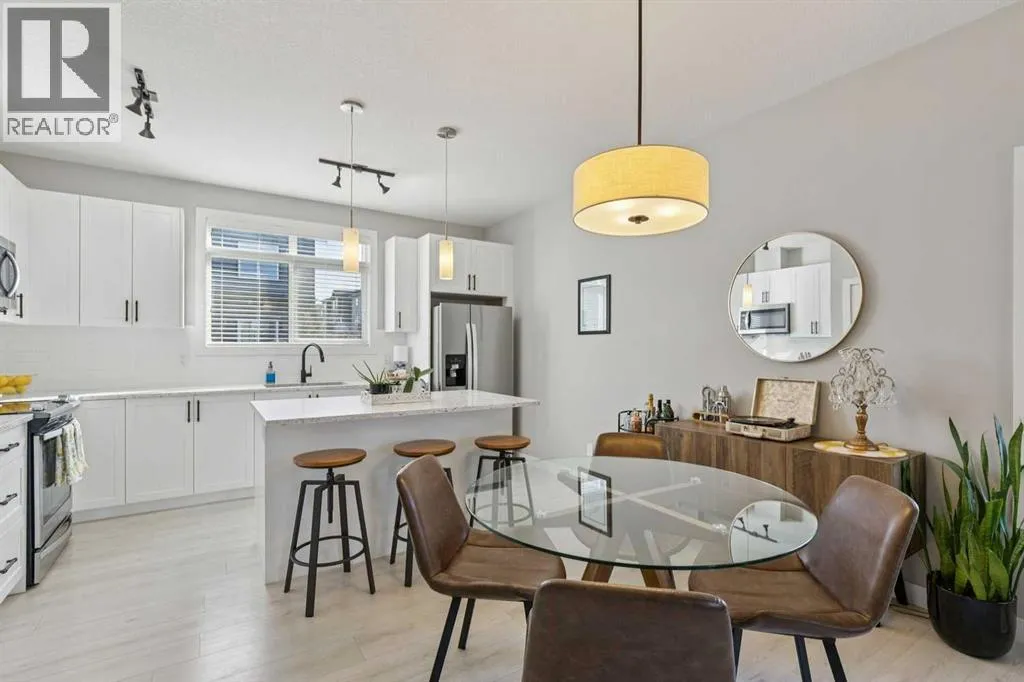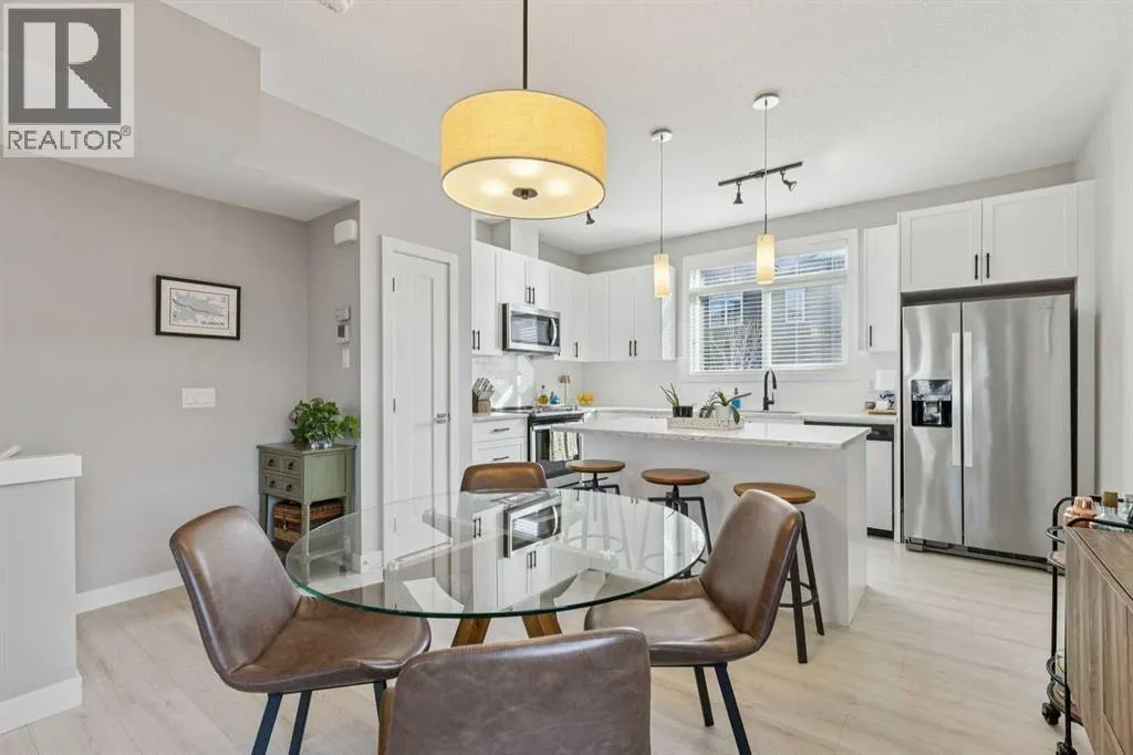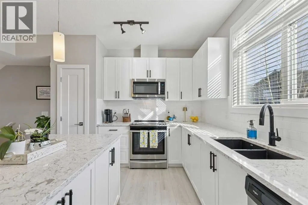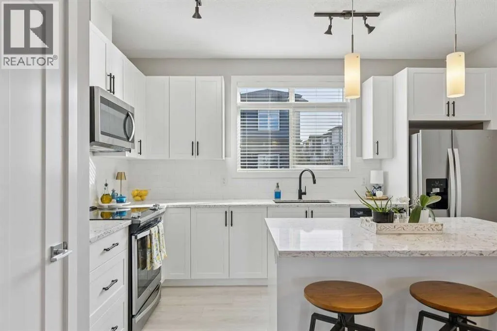 Welcome to this beautifully appointed end-unit townhome in the sought-after community of Sage Hill. As a former show home, this property showcases upgraded finishes, thoughtful design, and exceptional pride of ownership throughout. Sage Hill is one of northwest Calgaryâs most desirable and rapidly growing communities, known for its scenic pathways, rolling green spaces, and convenient access to major routes like Stoney Trail and Shaganappi Trail. With an ever-expanding selection of nearby shopping, dining, and amenities, this location offers convenience and a connected outdoor lifestyle. This end-unit townhome benefits from added privacy, with only one shared wall, extra natural light, and a functional layout designed for everyday living. The open-concept main floor features durable luxury vinyl plank flooring and a beautifully designed kitchen complete with quartz countertops, timeless shaker-style cabinetry, an upgraded appliance package, and elegant pendant lighting over the island. A large adjacent dining area provides space to host family and friends, making this space ideal for both entertaining and daily living. Upstairs, youâll find a double primary bedroom layout, with two bedrooms, each offering its own private ensuite. Convenient upper-level laundry adds to the thoughtful design, making day-to-day living that much easier for homeowners. The oversized single-attached garage is a standout feature, providing ample space for a vehicle plus a motorbike, recreational gear, or even a workshop area. A full driveway offers parking for an additional vehicle. With low condo fees and a pet-friendly complex, this home delivers incredible value in a thriving community. Whether youâre a first-time buyer, investor, or downsizer, this turnkey property is ready to impress. (id:27476)