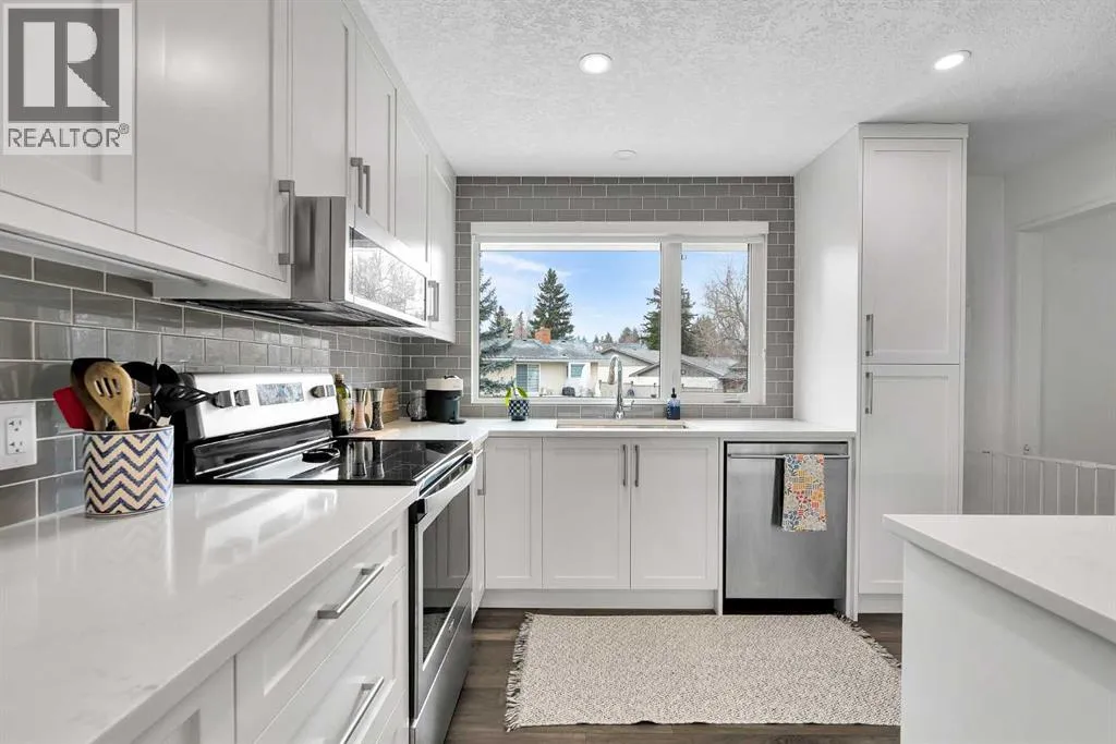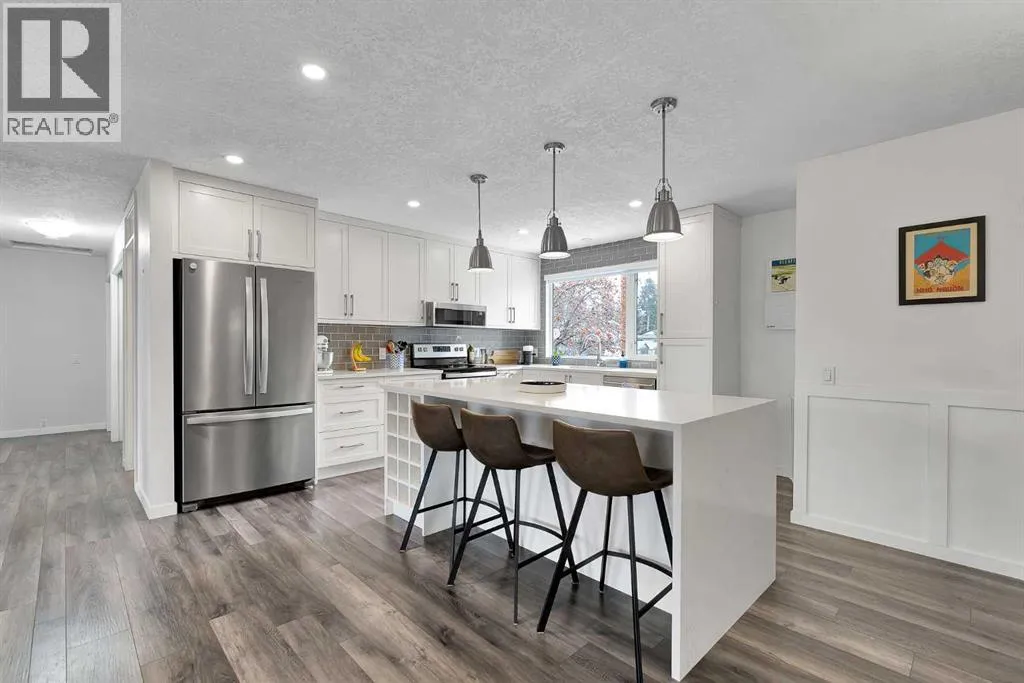 Beautifully updated and move-in ready, this impressive Dalhousie bi-level is ideally located on a quiet street surrounded by upgraded high-end homes and the bike path outside the backyard gate. Set on a huge lot, this home offers the perfect blend of comfort, style, and location in one of NW Calgary's most established old school neighbourhoods. The bright open concept main floor features a fully renovated kitchen with large functional quartz island, upgraded appliances , plenty of space for dining, living and a wood burning fireplace which is a rarity today. Three spacious bedrooms upstairs include a primary with full ensuite ensures space and flexible living. The third bedroom opens up onto a sunny brand new 21ft x 10ft composite deck to enjoy the days of sunshine and for outdoor living. The lower level offers a large family area with additional wood burning fireplace, 4th bedroom and 2pc bathroom. The oversized double attached garage is surprisingly spacious and easily holds 2 vehicles with enough room for a workshop, additional storage and easy access to the home. Outside you will be delighted with a huge yard so rare in new builds. The bike path behind the home is cleared in the winter ideal for walks and for kids to safely play off the street. Everything you could possibly need like C-train, shopping, parks and schools are all here. This turnkey home is an excellent opportunity to get into this desirable neighbourhood in a prime location. (id:27476)