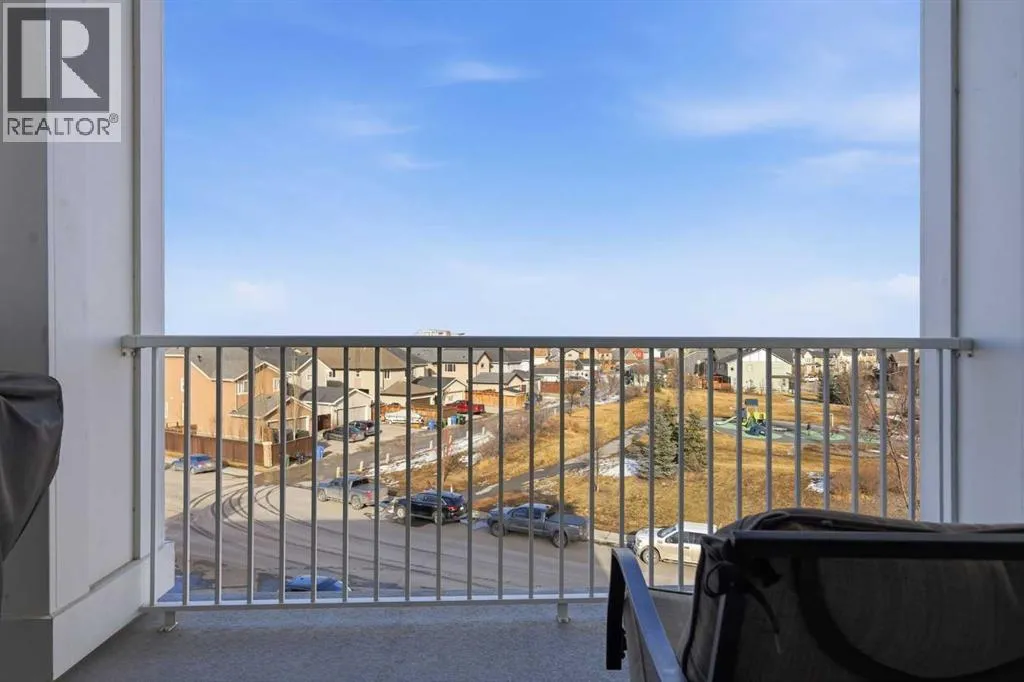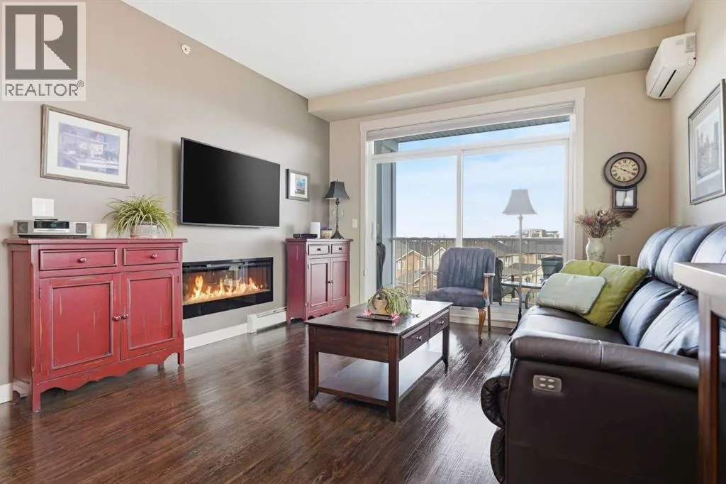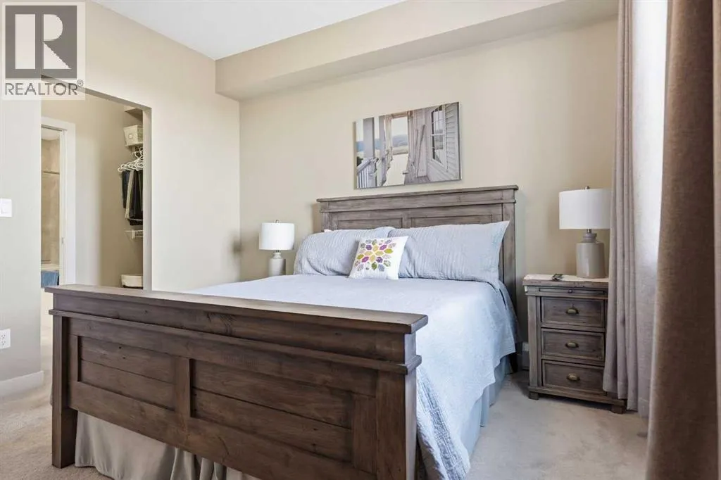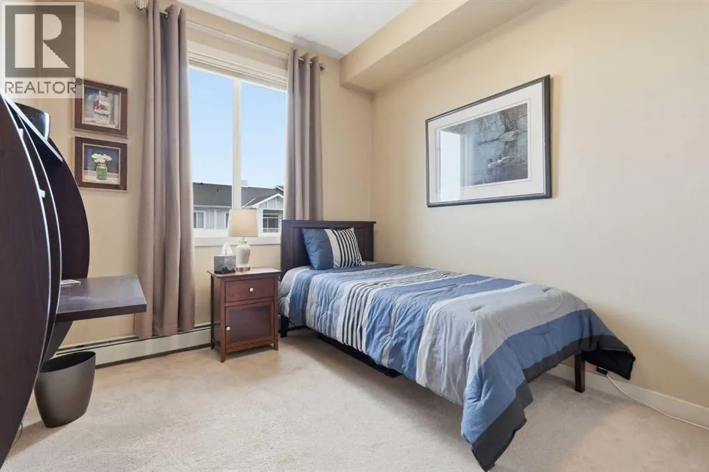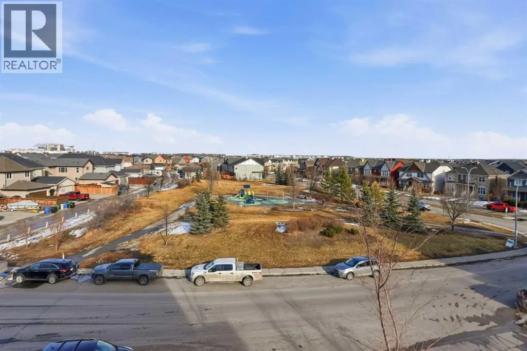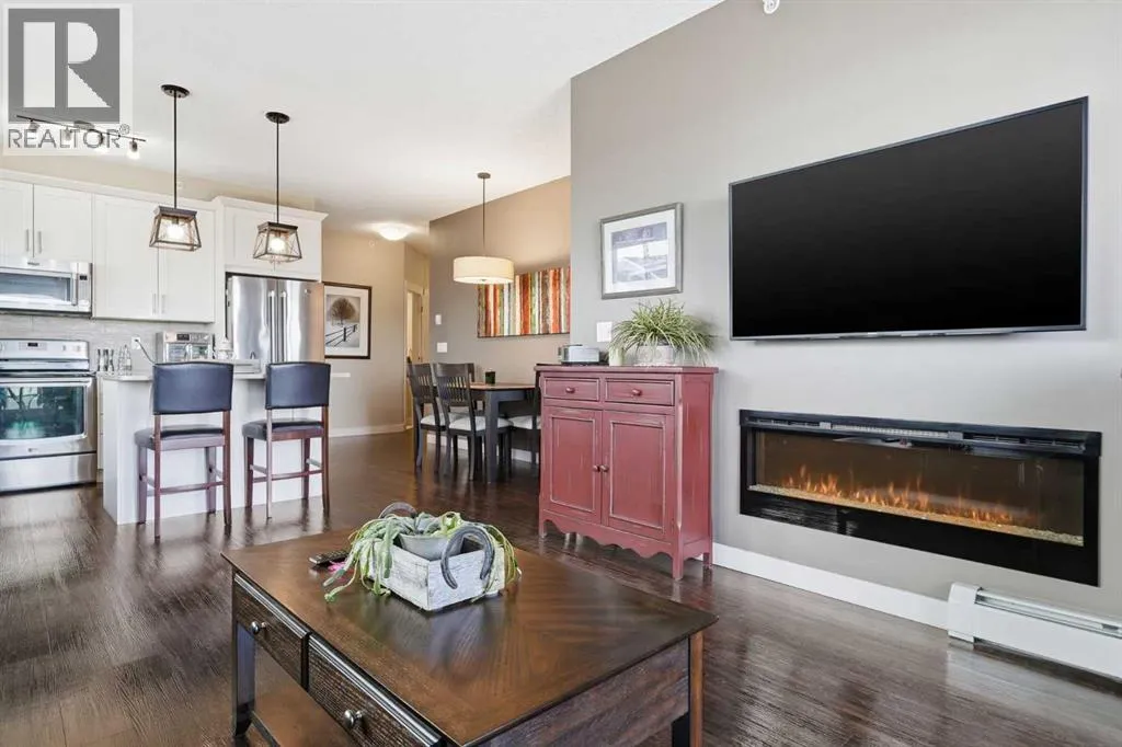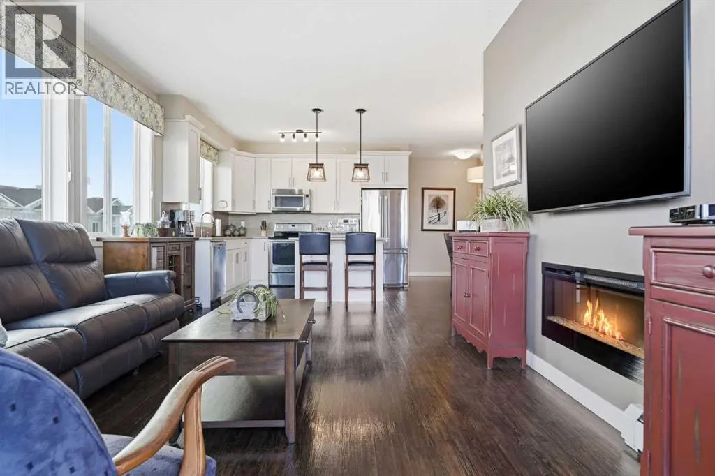 Welcome to this beautifully maintained top-floor corner unit located in the desirable community of Cranston, directly across from a park and surrounded by walking paths along the ridge. This original-owner home offers a quiet setting in a very well-maintained building and shows true pride of ownership.The bright and functional layout features 2 bedrooms, 2 bathrooms and 9' ceilings, creating an open and airy feel throughout the open, interior living space. The kitchen is thoughtfully designed with caesar stone countertops, upgraded backsplash, pull-out shelving in the island, and four additional drawers for added storage, making it both practical and stylish.The primary bedroom includes a walk-through closet and a spacious ensuite complete with a double vanity, deep soaker tub, and separate stand-up shower. The second bathroom features a convenient tub/shower combination.Additional highlights include upgraded lighting, custom top-down bottom-up window blinds, air conditioning, and a cozy electric fireplace. Step outside to the SE-facing patio, perfect for enjoying morning sun.This move-in ready home has been meticulously cared for with no pets and no smoking, was fully repainted in 2025, and offers a fantastic location in a family-friendly neighbourhood with parks at both ends of the street and scenic pathways nearby. (id:27476)