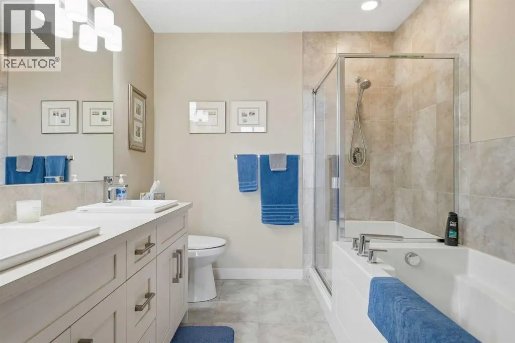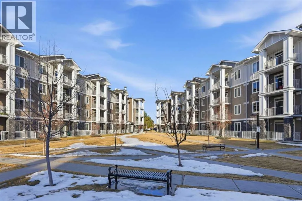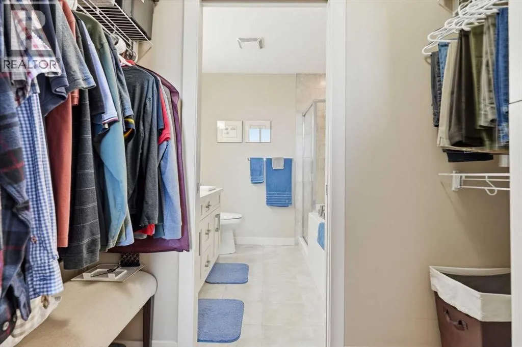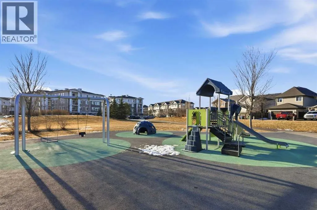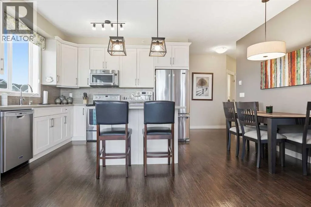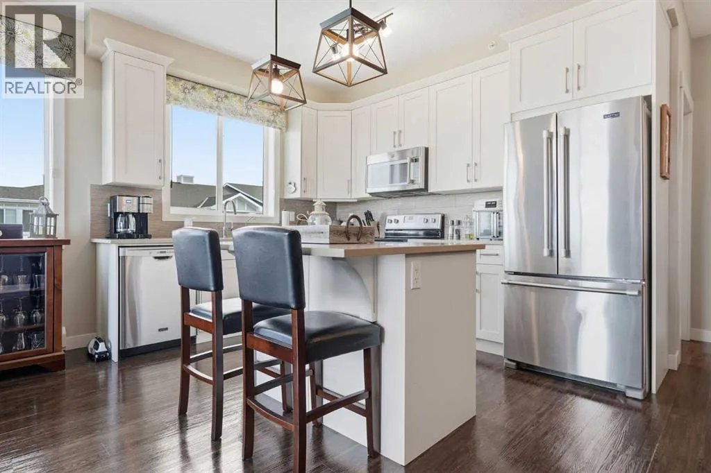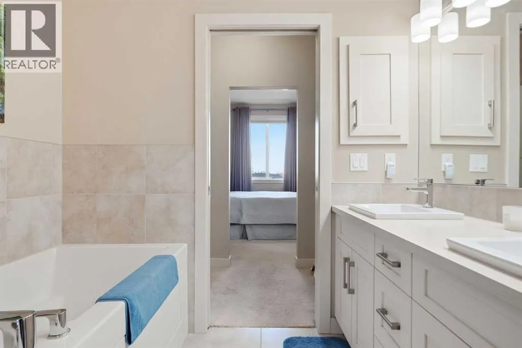 Welcome to this beautifully maintained top-floor corner unit located in the desirable community of Cranston, directly across from a park and surrounded by walking paths along the ridge. This original-owner home offers a quiet setting in a very well-maintained building and shows true pride of ownership.The bright and functional layout features 2 bedrooms, 2 bathrooms and 9' ceilings, creating an open and airy feel throughout the open, interior living space. The kitchen is thoughtfully designed with caesar stone countertops, upgraded backsplash, pull-out shelving in the island, and four additional drawers for added storage, making it both practical and stylish.The primary bedroom includes a walk-through closet and a spacious ensuite complete with a double vanity, deep soaker tub, and separate stand-up shower. The second bathroom features a convenient tub/shower combination.Additional highlights include upgraded lighting, custom top-down bottom-up window blinds, air conditioning, and a cozy electric fireplace. Step outside to the SE-facing patio, perfect for enjoying morning sun.This move-in ready home has been meticulously cared for with no pets and no smoking, was fully repainted in 2025, and offers a fantastic location in a family-friendly neighbourhood with parks at both ends of the street and scenic pathways nearby. (id:27476)