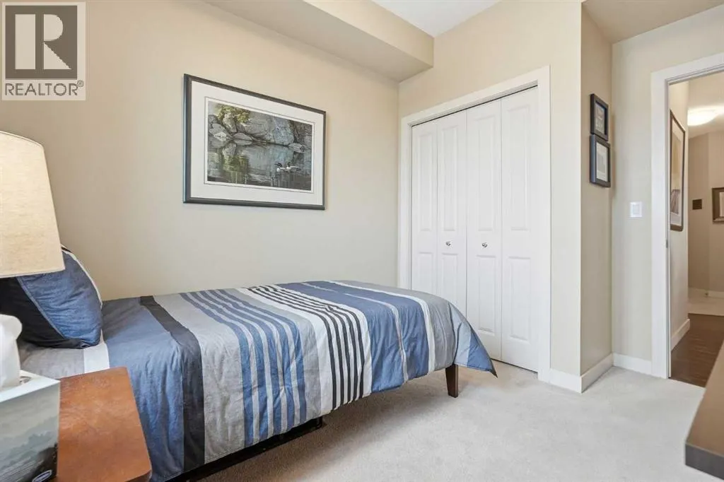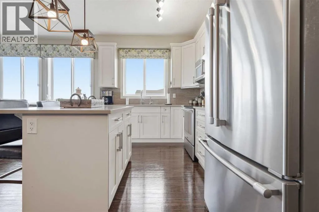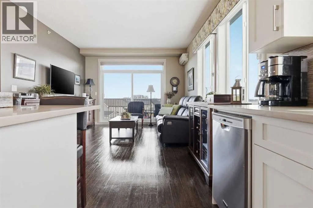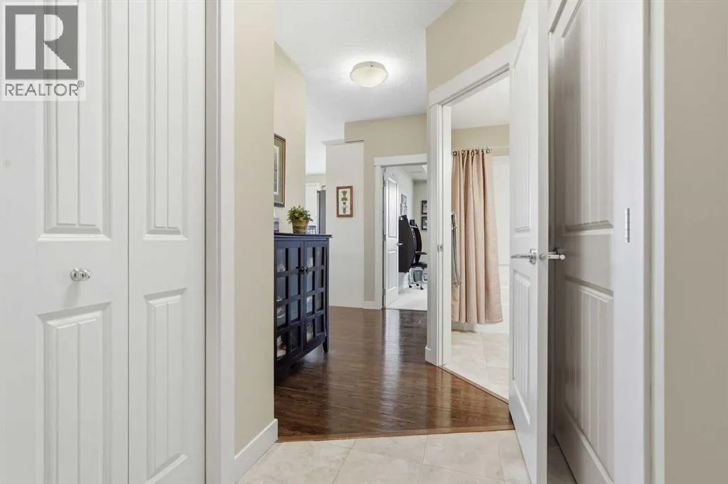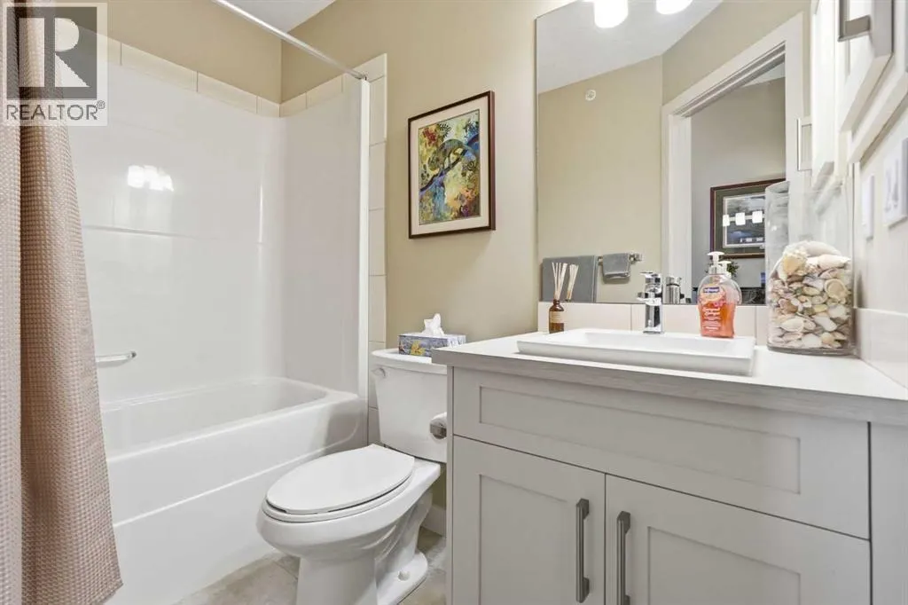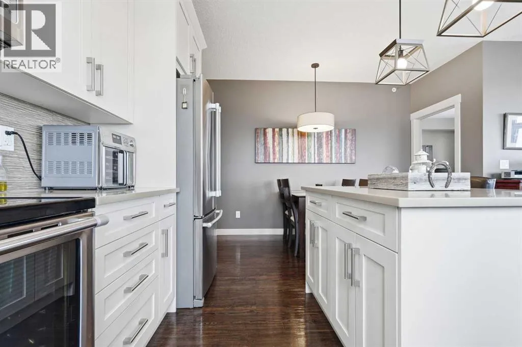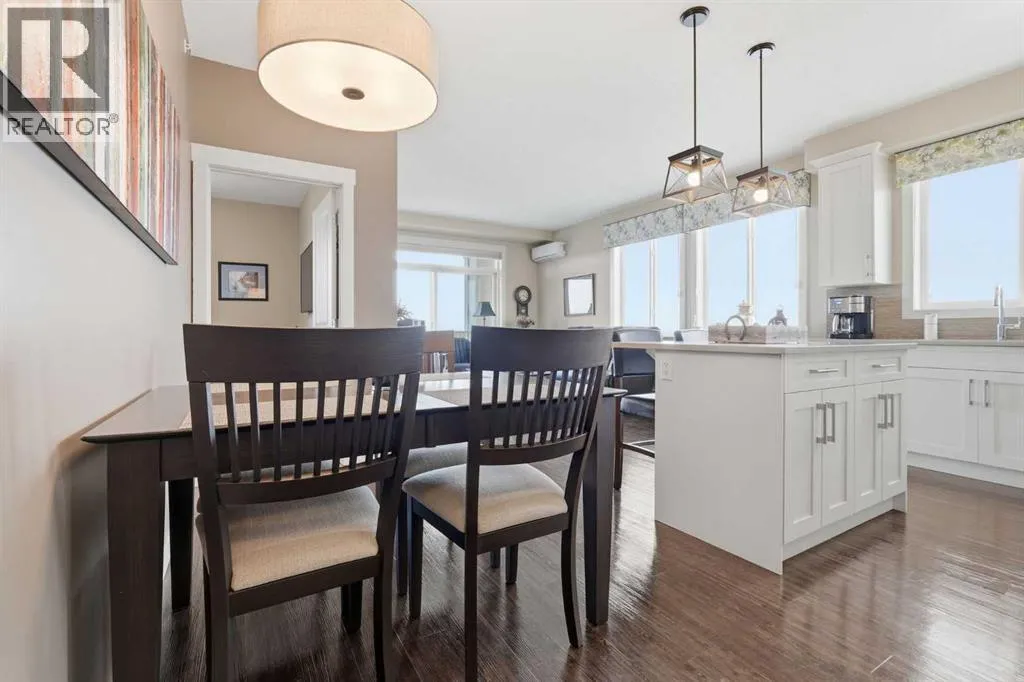 Welcome to this beautifully maintained top-floor corner unit located in the desirable community of Cranston, directly across from a park and surrounded by walking paths along the ridge. This original-owner home offers a quiet setting in a very well-maintained building and shows true pride of ownership.The bright and functional layout features 2 bedrooms, 2 bathrooms and 9' ceilings, creating an open and airy feel throughout the open, interior living space. The kitchen is thoughtfully designed with caesar stone countertops, upgraded backsplash, pull-out shelving in the island, and four additional drawers for added storage, making it both practical and stylish.The primary bedroom includes a walk-through closet and a spacious ensuite complete with a double vanity, deep soaker tub, and separate stand-up shower. The second bathroom features a convenient tub/shower combination.Additional highlights include upgraded lighting, custom top-down bottom-up window blinds, air conditioning, and a cozy electric fireplace. Step outside to the SE-facing patio, perfect for enjoying morning sun.This move-in ready home has been meticulously cared for with no pets and no smoking, was fully repainted in 2025, and offers a fantastic location in a family-friendly neighbourhood with parks at both ends of the street and scenic pathways nearby. (id:27476)
