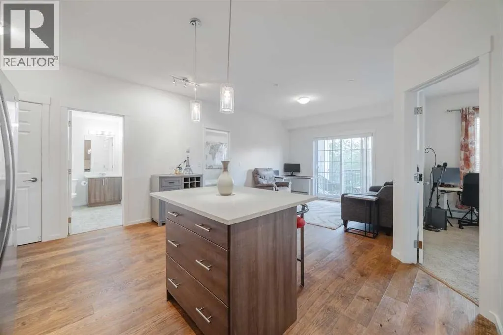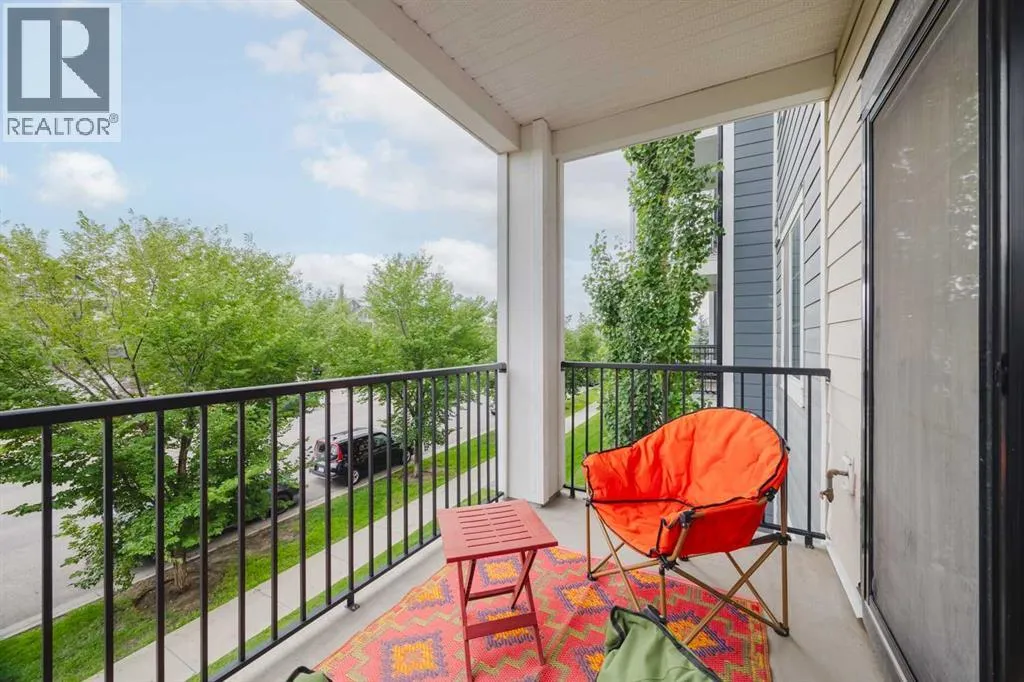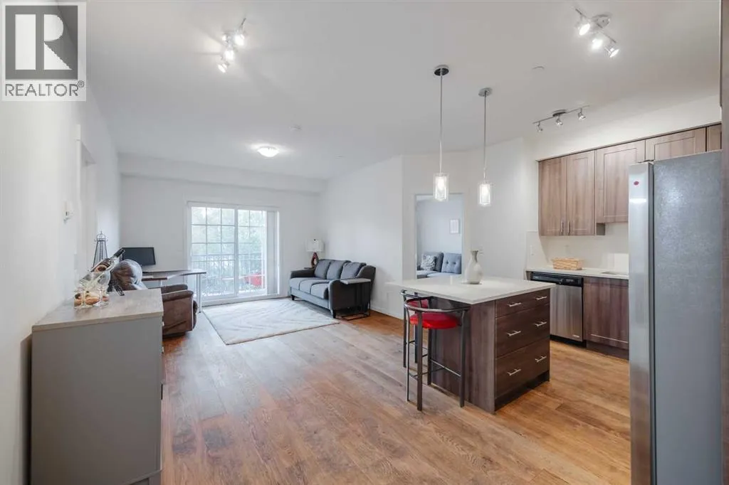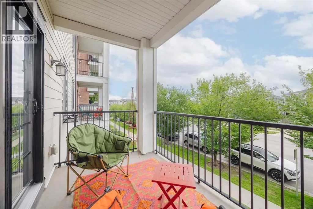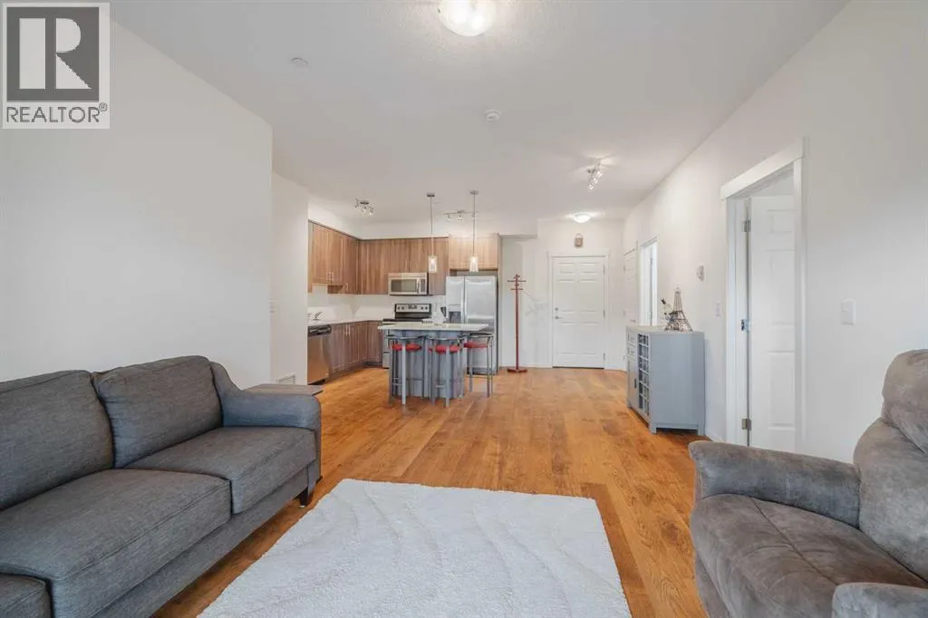 Spacious 2-bedroom, 2-bathroom condo with windows in both bedrooms â a rare find. This large unit offers 825 sq.ft. (builder size) of open-concept living space, complete with hardwood flooring throughout the main areas, upgraded stainless steel appliances, quartz countertops, and full-height kitchen cabinets for added storage and style.The kitchen flows seamlessly into the bright living and dining area, perfect for entertaining or relaxing at home. The primary bedroom features a walk-through closet and 4-piece ensuite, while the second bedroom is ideally located near the main bath and in-suite laundry. Enjoy your own private balcony, plus the convenience of underground parking and a secure storage locker.Stylish, functional, and move-in ready â this is one of the best layouts available in the complex. And donât forget, you'll be living in Legacy, near Ponds, All Saints High School, Living Spirit K-9 School, Township Shopping Centre, playgrounds, and with easy access to McLeod Trail. Enjoy walking paths and nature views at the nearby environmental reserve, and a future elementary school. (id:27476)