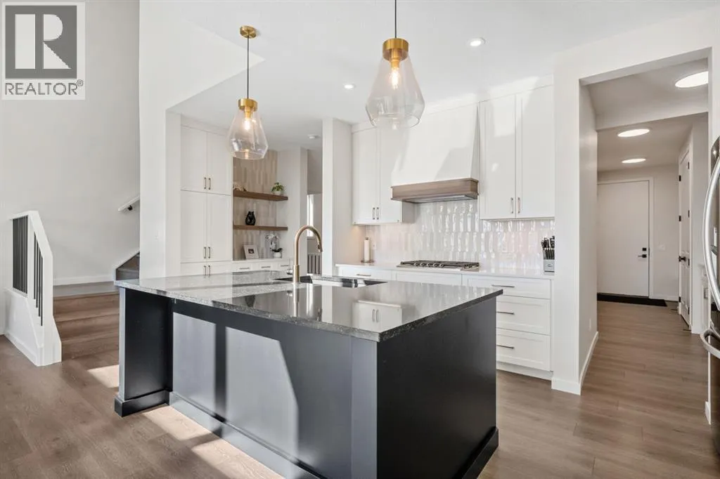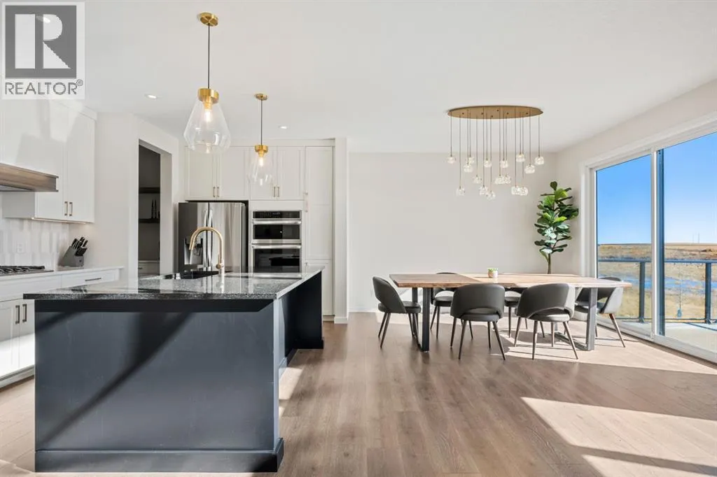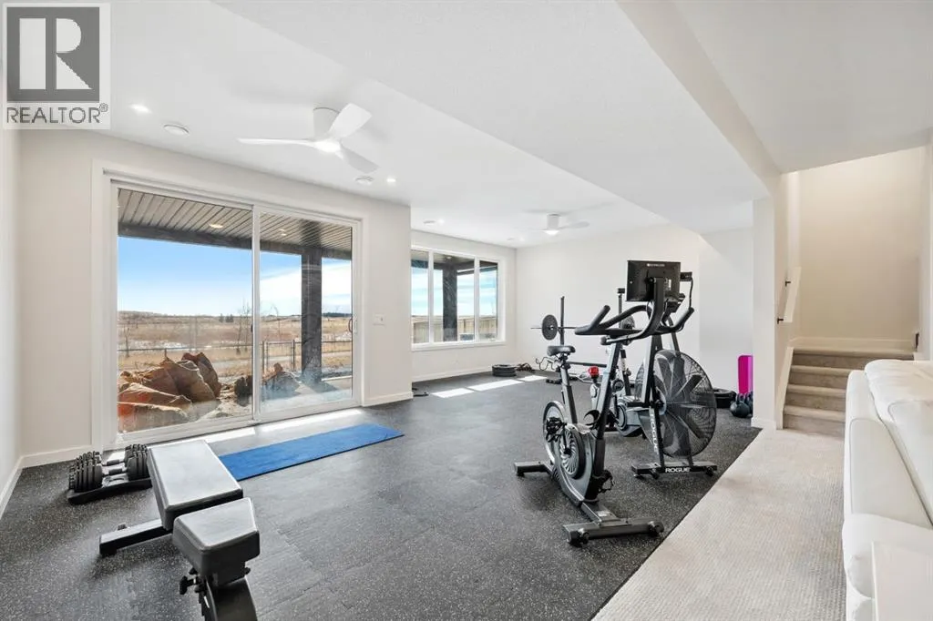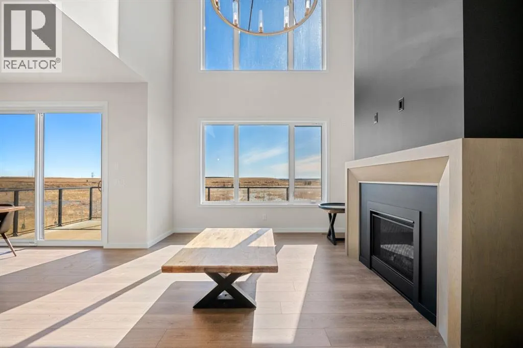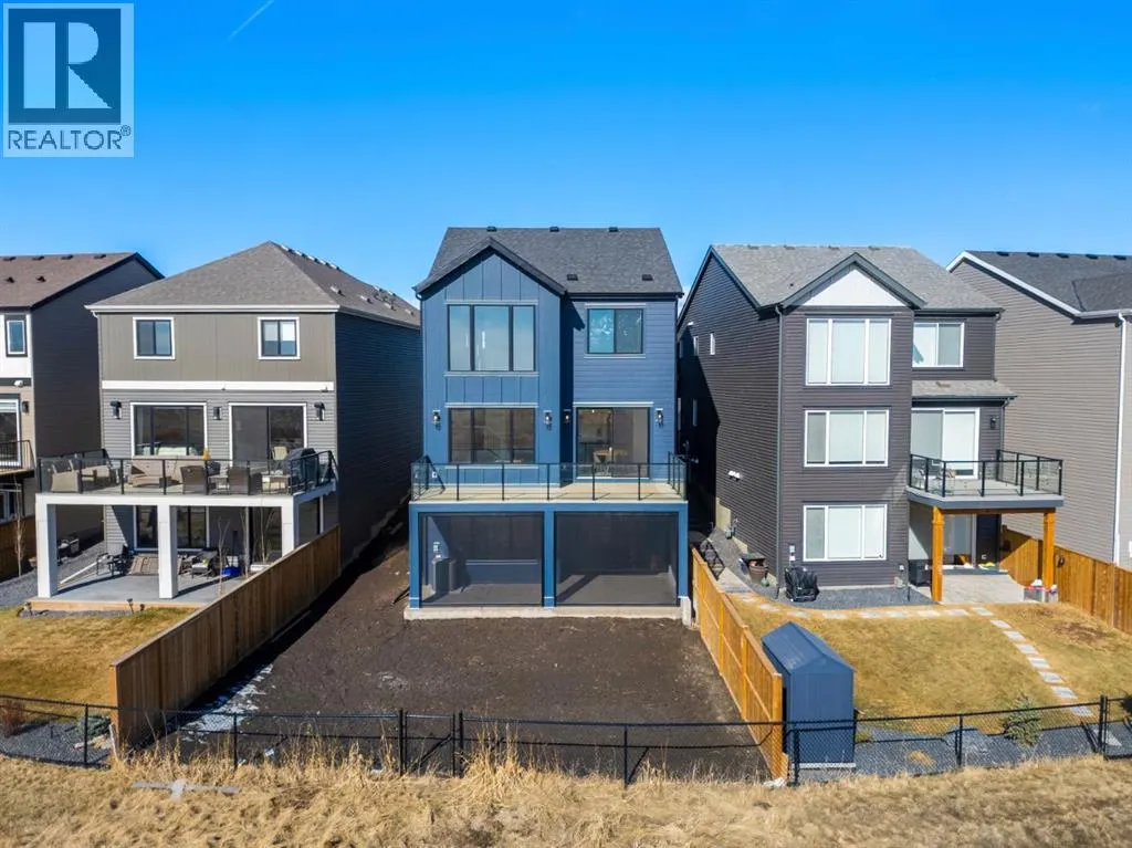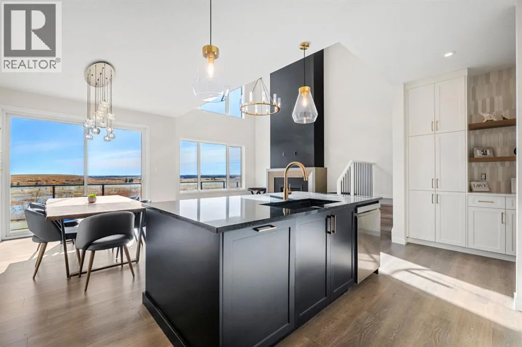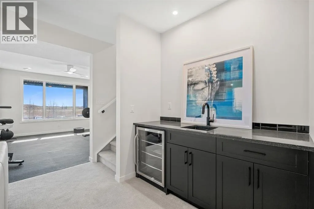 Thoughtfully upgraded far beyond builder spec, this exceptional Baywest walkout in Rangeview offers elevated design, premium finishes, and an outstanding rear setting with open views. Built with long-term living in mind, this home showcases a bright open-concept layout with a dramatic open-to-above great room, oversized windows, and a striking floor-to-ceiling fireplace feature wall. The chef-inspired kitchen was extensively upgraded with full-height cabinetry with crown to ceiling, quartz surfaces, farmhouse sink, upgraded hood fan, under-cabinet lighting, pot drawers, built-in waste and recycling pullouts, a reconfigured island, butlerâs pantry, and custom built-in storage. Upstairs, the upgrades continue with luxury vinyl plank on the staircase and second level, 8-foot interior doors, upgraded railings, built-in bench seating, and a beautifully appointed primary retreat featuring a freestanding soaker tub, curbless glass shower extended to the ceiling, makeup counter, and enhanced walk-in closet shelving. The fully finished walkout basement adds valuable living space with a large rec room, bedroom, full bath, bar area, and zoned comfort. Outside, the home is equally impressive with cement board/Hardie exterior details, black exterior windows, Gemstone lighting, a screened-in upper deck with motorized screen, clear glass railing, vinyl decking, covered lower patio, BBQ gas line, and a heated garage with floor drain. A rare opportunity to own a highly upgraded, move-in-ready walkout home in one of Calgaryâs most distinctive emerging communities. (id:27476)