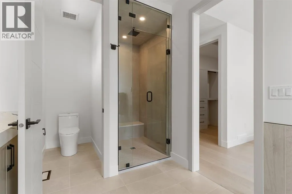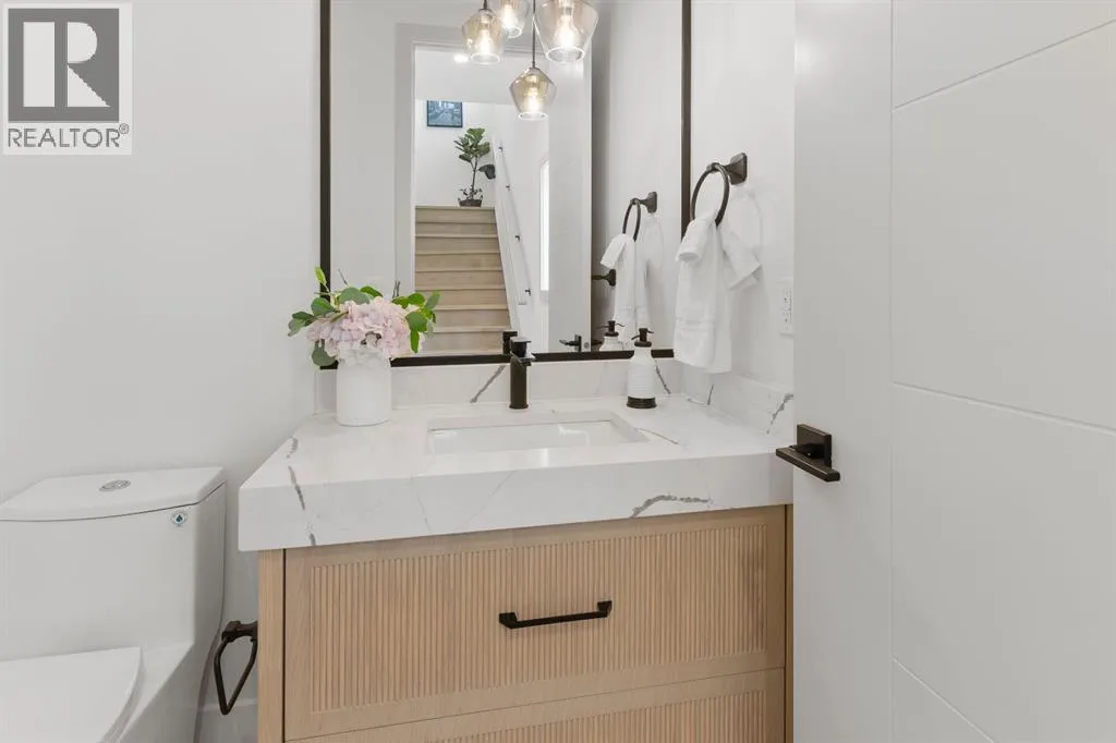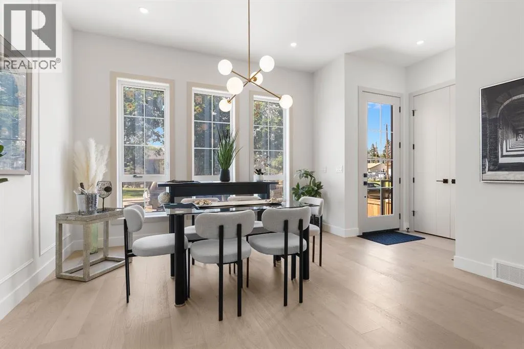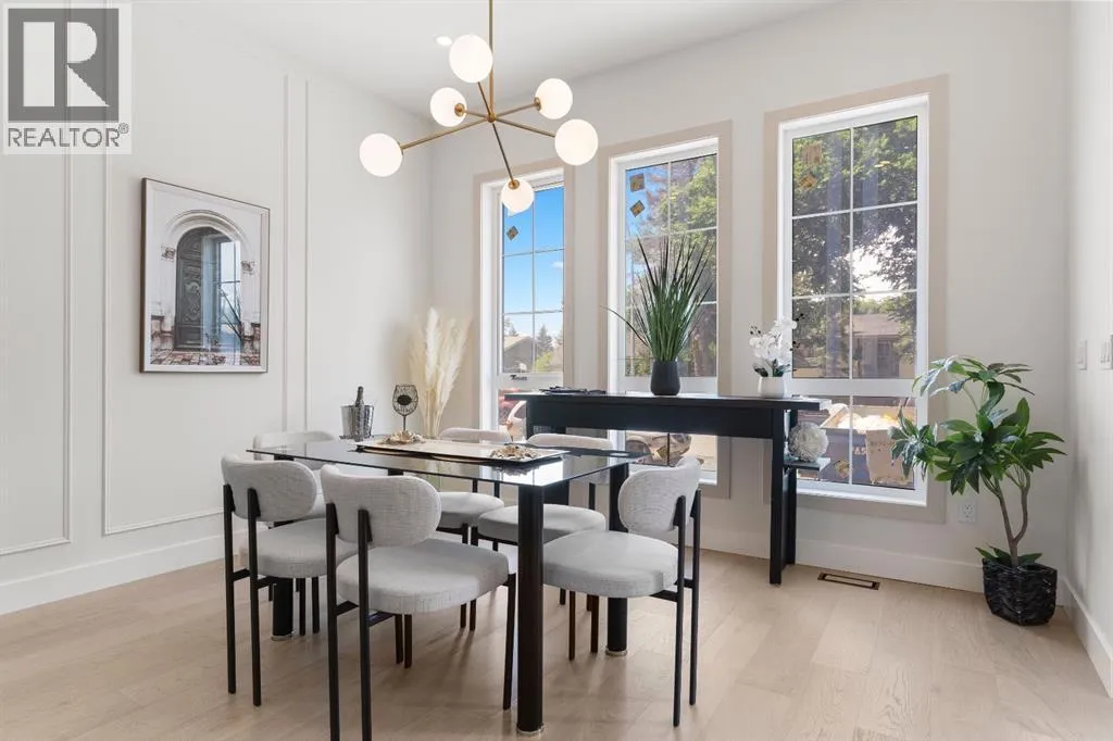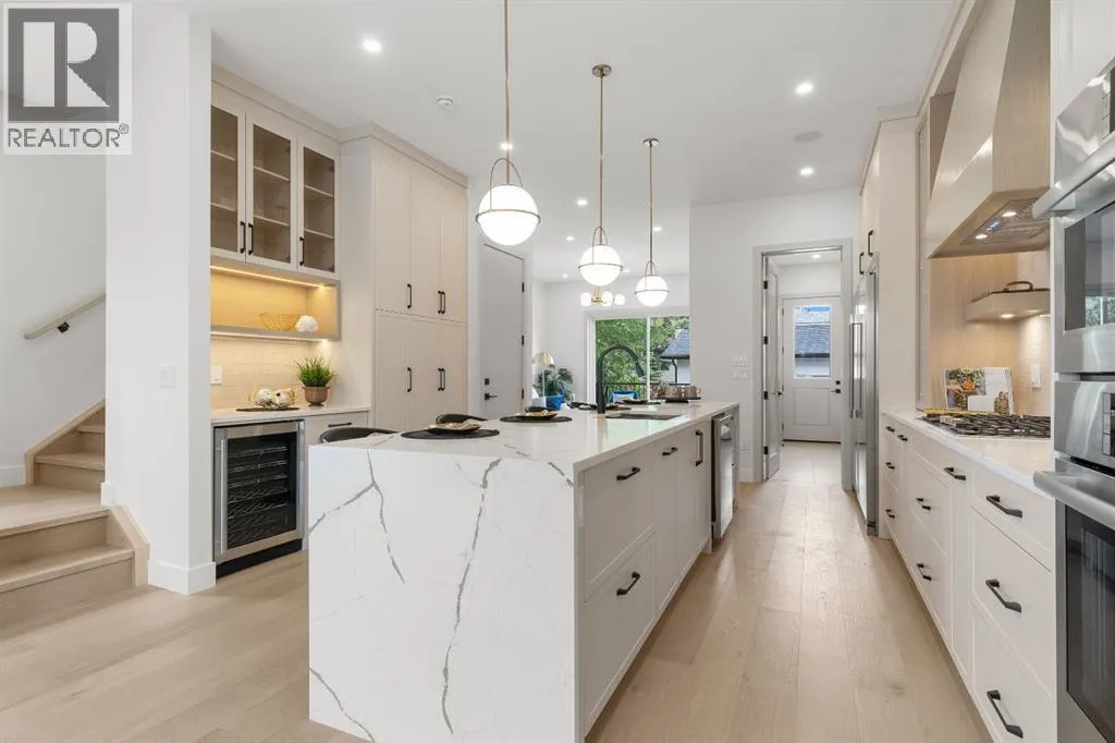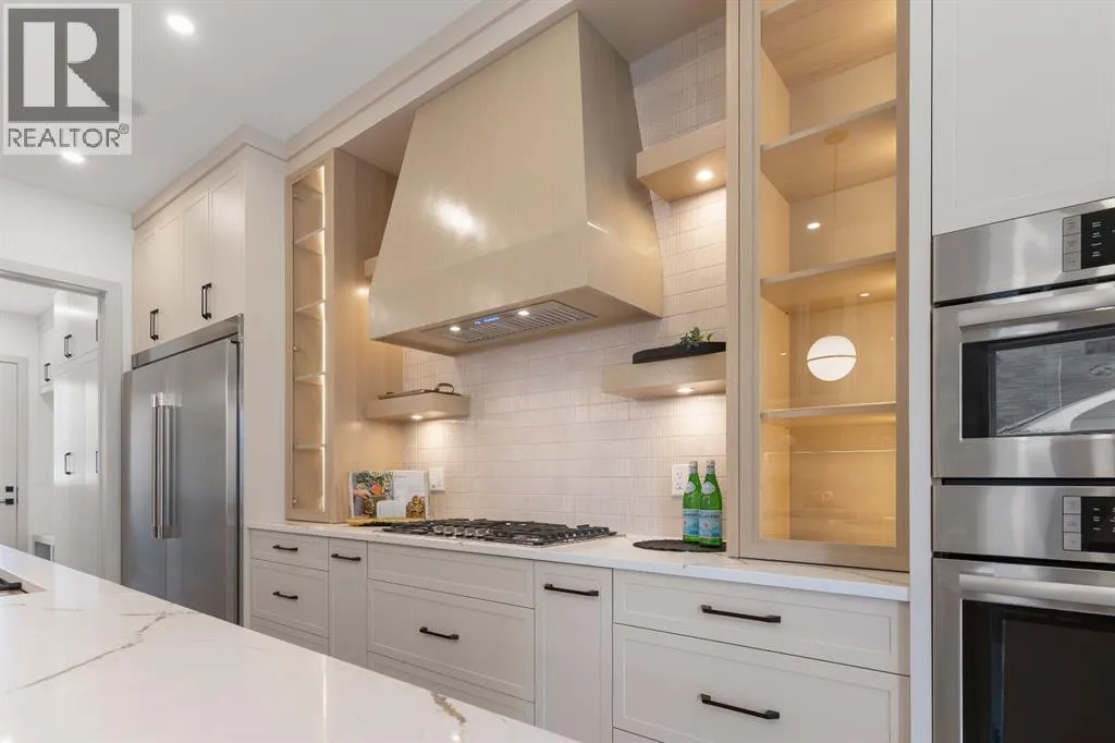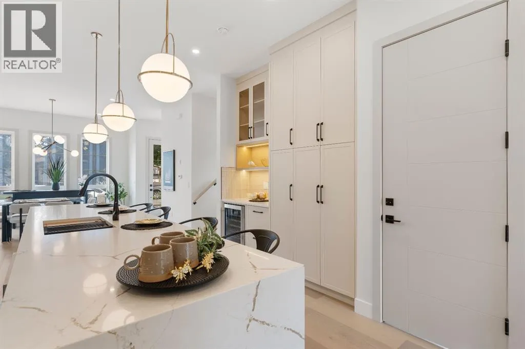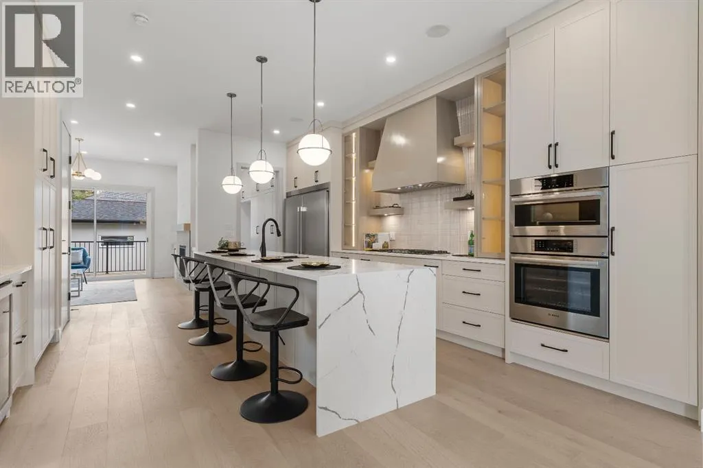 Glenbrookâs Finest! Step into a bright and inviting open-concept main floor where function meets elevated design. At the front of the home, a beautiful formal dining area sets the stage for stylish gatherings and elegant dinner parties. Just beyond, the chef-inspired kitchen boasts a massive waterfall quartz island, double-wide fridge, Bosch cooktop, wall oven, and dishwasher. Adjacent to the island, a thoughtful prep and storage area includes a built-in bar fridge and extended cabinets with convenient pull-out drawersâkeeping everything organized and within easy reach for seamless entertaining. Warm neutral tones, built-in ceiling speakers, and timeless finishes create the perfect backdrop for both daily living and hosting with ease. At the rear of the home, a cozy fireplace lounge flows effortlessly onto a sprawling east-facing deckâideal for enjoying quiet sunny summer mornings or relaxed evenings. Just off the kitchen, a spacious mudroom offers even more custom cabinetry to store your familyâs essentials. Upstairs, a versatile loft area offers the perfect spot for a home office or reading nook. The massive primary retreat features heated floors in the spa-inspired ensuite, and a deep soaker tub. Two additional generously sized bedrooms and a stylish four-piece bath complete the upper level. Downstairs, the home offers even more flexibility with a bright and spacious legal basement suite (pending final City of Calgary approval). Featuring two private bedrooms and a large open living area, this level is ideal for extended family, guests, or future rental income. This home isnât just beautifully finishedâitâs a thoughtful investment in style, space, and long-term potential. (id:27476)