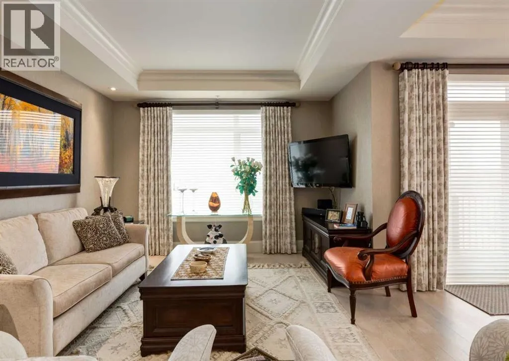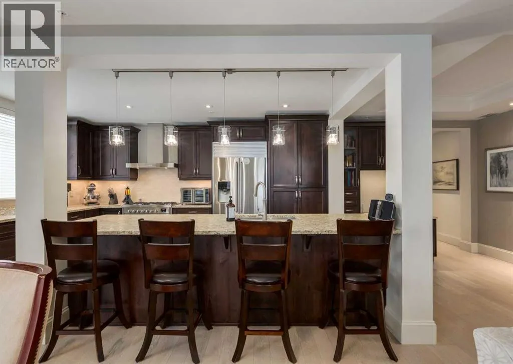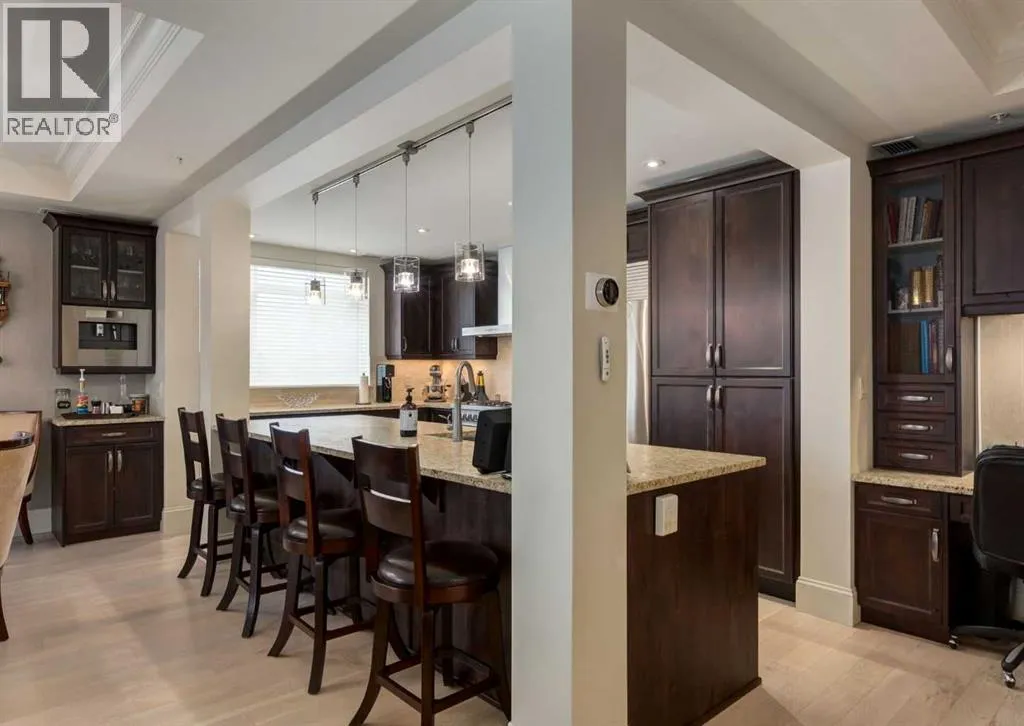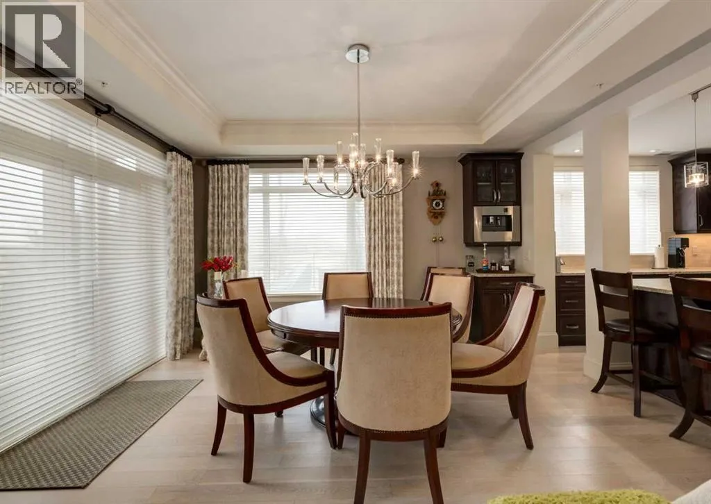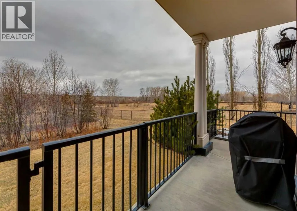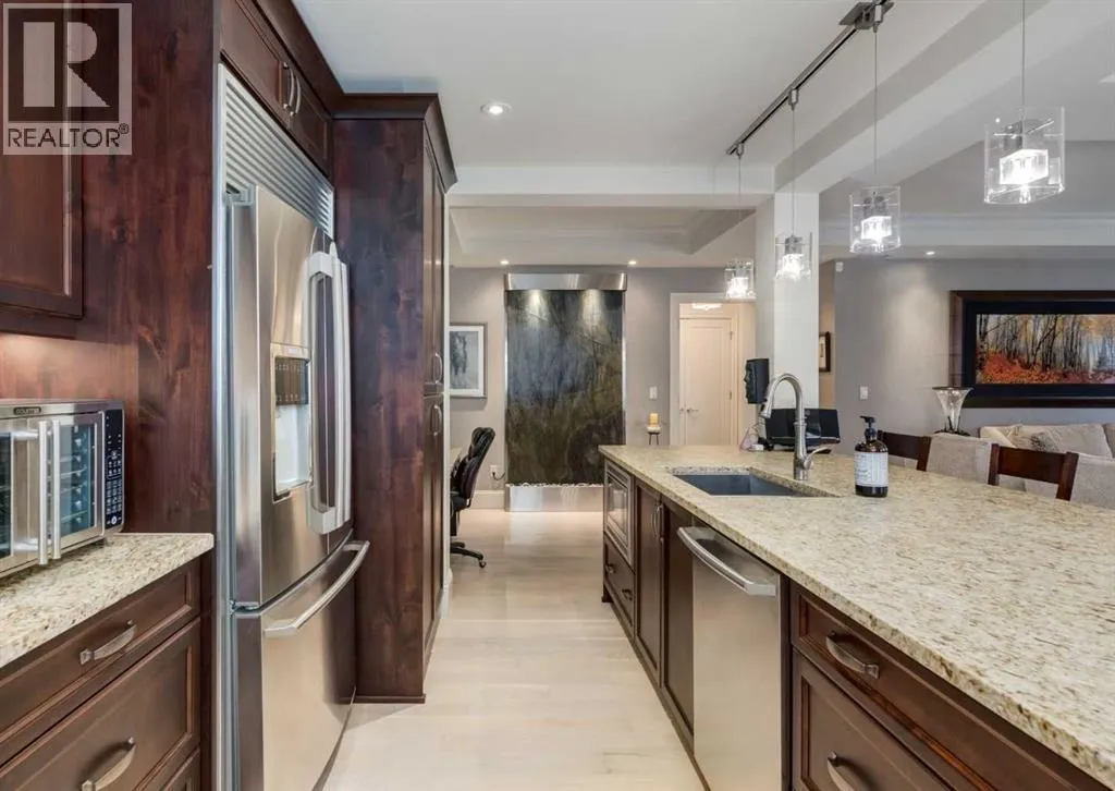 Coveted, Spectacular Corner Unit location on the main floor offering a harmonious blend of luxurious decor and natural beauty right outside your door. Unobstructed views of the Bow River and parkland, with lots of opportunity to ride your bike, walk and enjoy the outdoors and wildlife that wander close by for your enjoyment. Kitchen with plumbed-in coffee maker, gas stove, dishwasher, fridge, hood fan, microwave. Espresso color cabinetry and leathered granite countertops. Beautiful island overlooking dining and living rooms with an amazing view of the extensive yard & beyond the walking paths to the river. Breakfast bar seating for 4 with stools included. Lovely built-in desk with ample shelving. Engineered flooring (Arctic Oak). Water Feature! Custom draperies. All window blinds are motorized throughout. Bedrooms have black out drapes. (Custom window coverings) Primary bedroom with 5-piece bath and heated towel bar is very spacious with 2 sinks, tub/separate shower. Walk-in closet with ample, well designed shelving. 3-piece bathroom is shared with second bedroom for complete privacy or easy for visitors as well. Lots of built-in storage. Stacking washer/dryer. Gas outlet on patio. 2 Titled Parking Stalls/P2 included. 1 Titled Storage included. (A 3rd Parking Stall may be purchased from the seller but is Not Included). Bicycle storage included. Car wash. Pet friendly with board approval. Walk to Carburn Park. Easy access to major transportation routes, shopping, restaurants, YMCA and a lot more! Champagne is a wonderful, amazing condo complex. You are going to love it!! (id:27476)