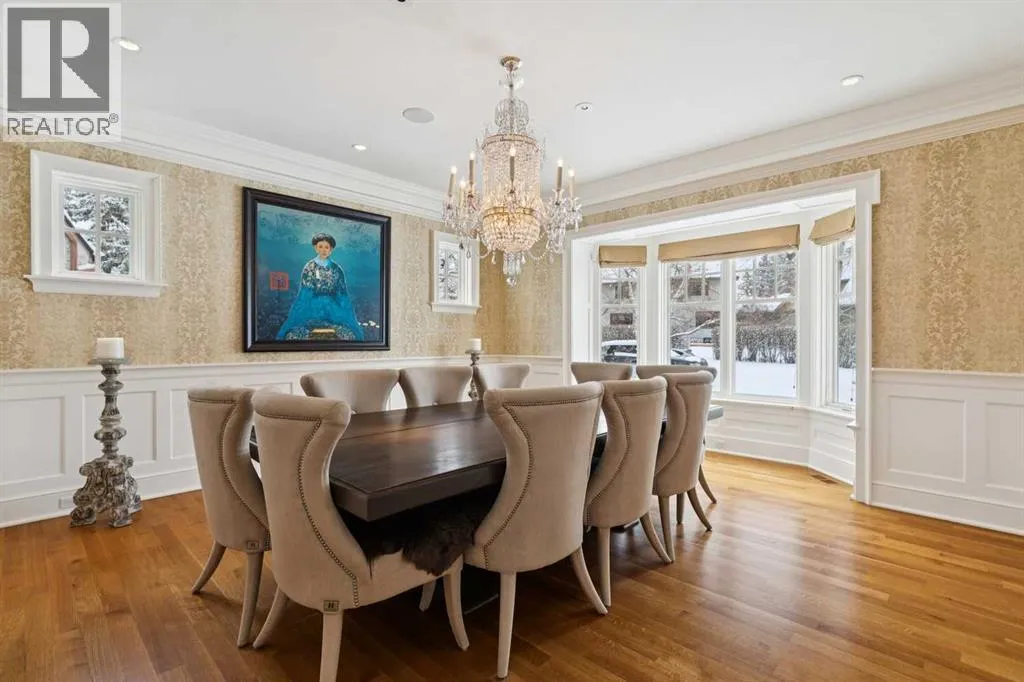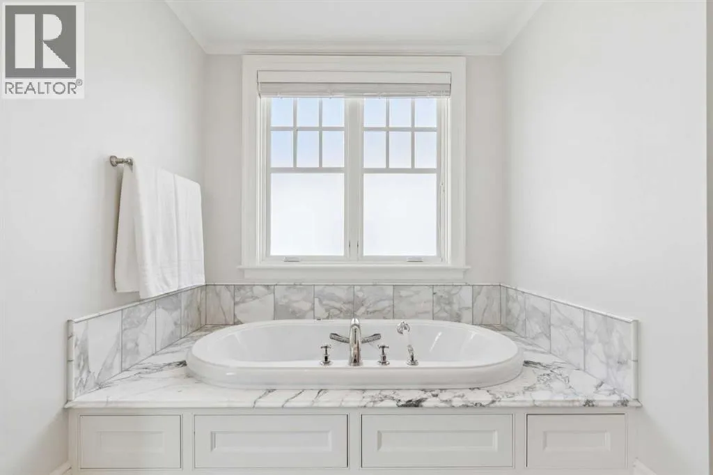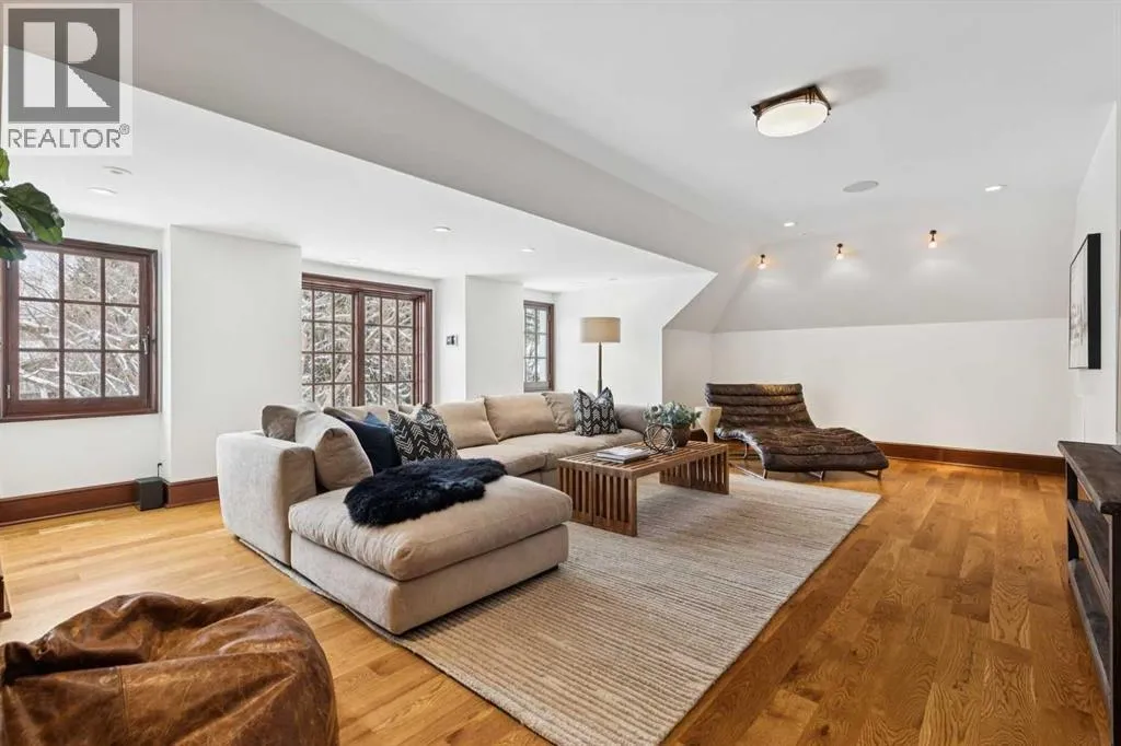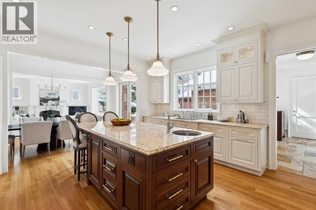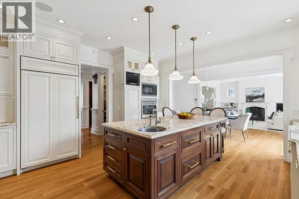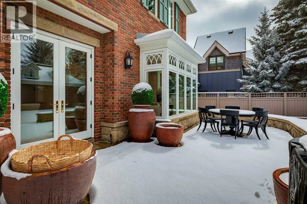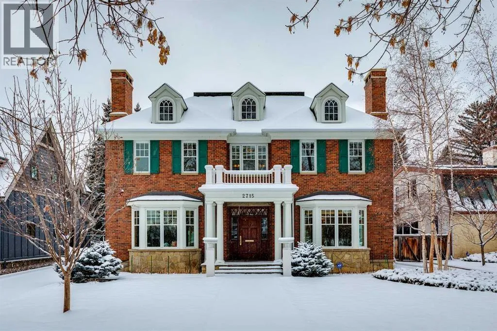 Georgian architecture meets uncompromising five-star luxury in this masterfully custom-built Mission residence (2013), offering nearly 7,000 square feet of impeccably curated living with six bedrooms, seven bathrooms, and hardwood flooring throughout. Ideally situated on an oversized lot in prestigious Upper Mount Royal, directly overlooking Talon Park, this residence represents a rare convergence of architectural integrity, craftsmanship, and location. Its stately presence is defined by a hand-cut brick and stone exterior, dual chimneys, and bespoke shutters, an enduring expression of timeless design. A central hall introduces interiors of exceptional refinement. The formal dining room is exquisitely appointed with hand-cut wainscoting, custom millwork, and tailored doors, creating a distinguished setting for entertainment. Opposite, a richly paneled walnut library offers a sense of quiet sophistication, complete with custom cabinetry, a Rumford masonry fireplace, and bespoke lighting, both intimate and impressive in equal measure. The chefâs kitchen is designed without compromise, featuring top-tier integrated appliances, an expansive island, a generous pantry, and finely crafted custom cabinetry. It transitions seamlessly into the informal dining area and an inviting family room, where French doors open to the outdoor living spaces. Here, a thoughtfully designed patio with BBQ area, built-in fireplace, and beautifully landscaped gardens extends the homeâs living experience outdoors, perfectly suited for both elegant entertaining and relaxed daily living. The main floor is further complemented by a private office and a substantial mudroom with direct access to one of the two heated coach house garages. Upstairs, the primary suite is a private sanctuary, appointed with custom closets, silk drapery, and a spa-inspired ensuite featuring heated marble floors and an oversized thermomasseur tub. Generously scaled secondary bedrooms include a Jack-and-Jill bathroom, an additional private bedroom, and bathroom. A versatile upper lounge provides an expansive, secluded retreat for family or guests, complete with bedroom and bathroom, ideal for movies, study, or quiet relaxation. The fully developed lower level continues the homeâs commitment to elevated living, offering a custom bar, dedicated movie area, games area, fitness space, steam room, and a laundry & arts room with ample storage, all meticulously designed to balance leisure, wellness, and practicality. Completing this exceptional offering are two heated coach house garages with capacity for four large vehicles, along with integrated sound and security systems. Properties of this calibre, defined by bespoke construction, architectural pedigree, and an irreplaceable setting are seldom available. This is a rare opportunity to acquire a truly distinguished residence in one of Calgaryâs most coveted enclaves. (id:27476)