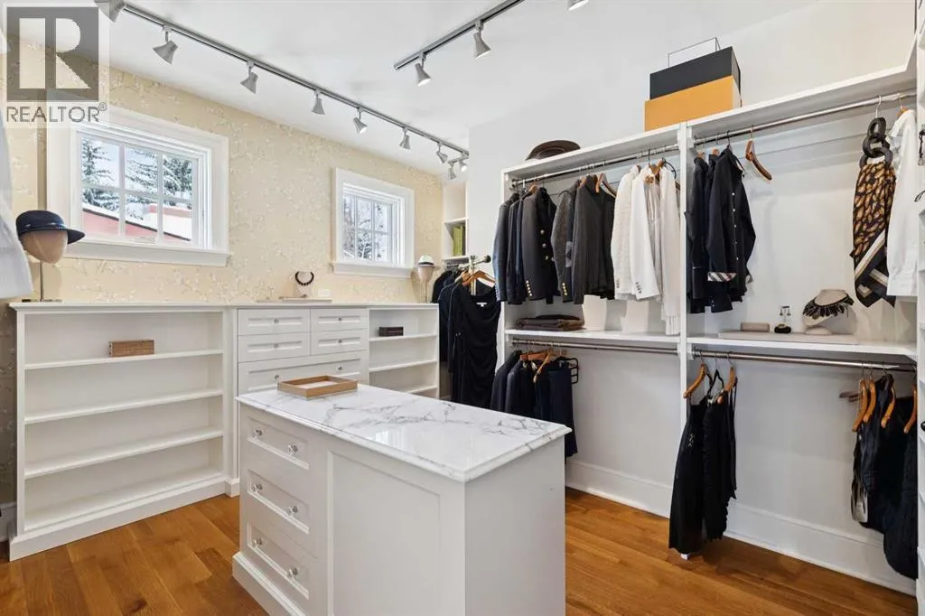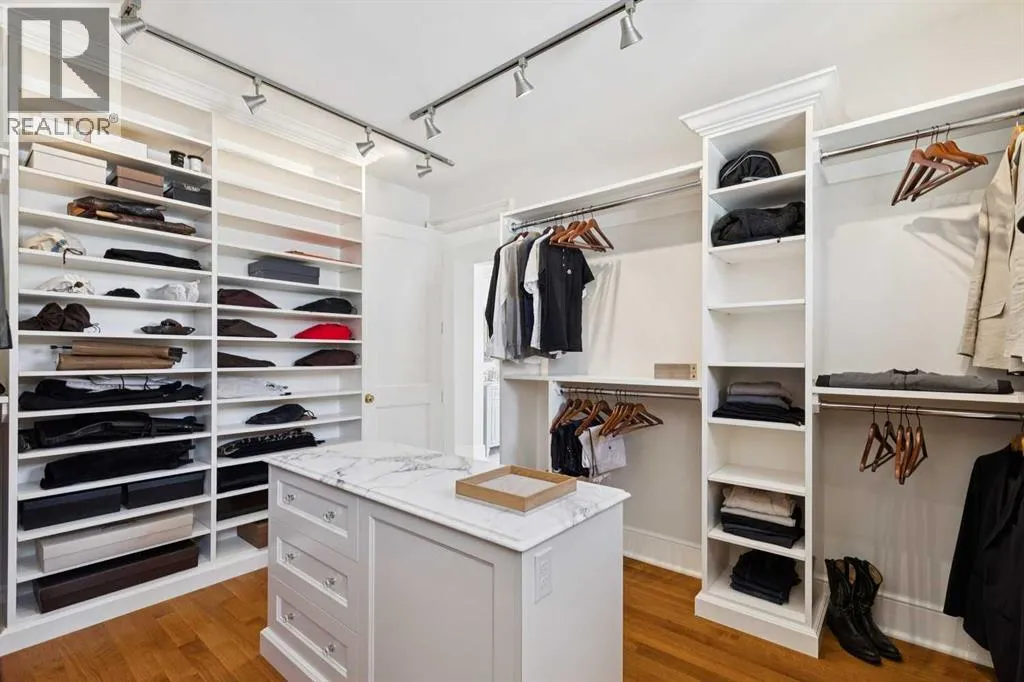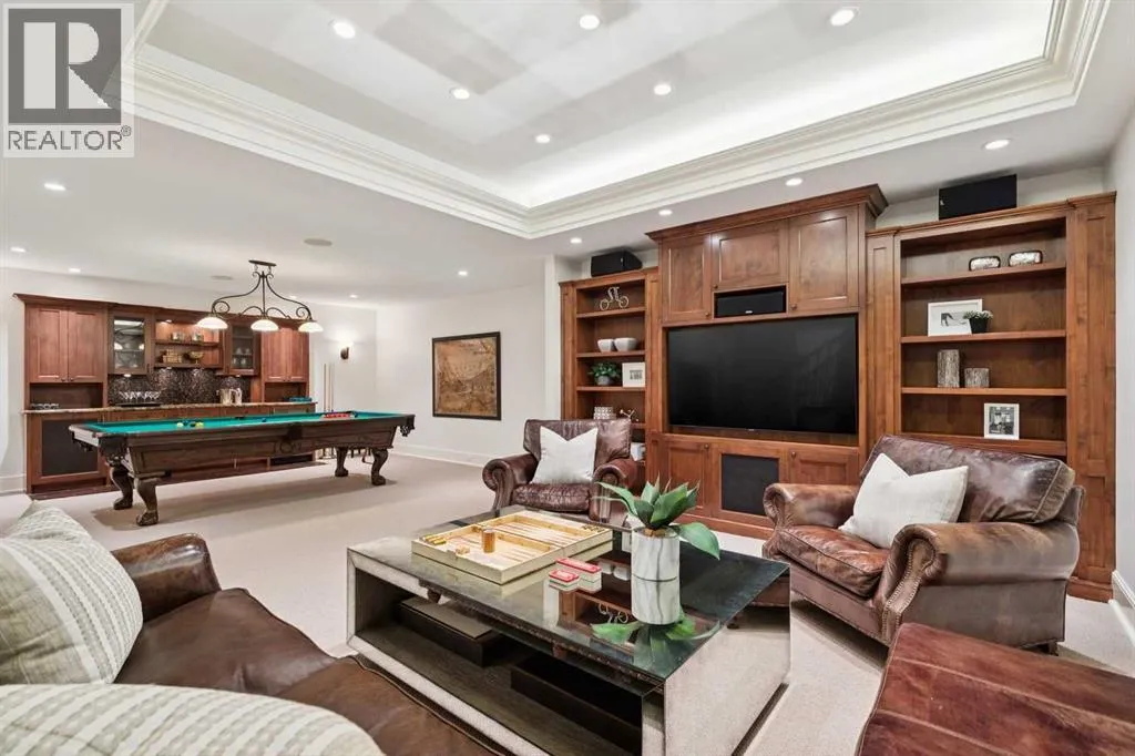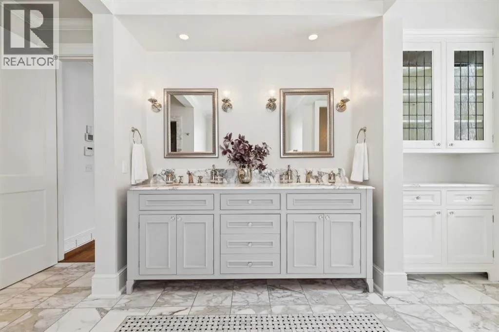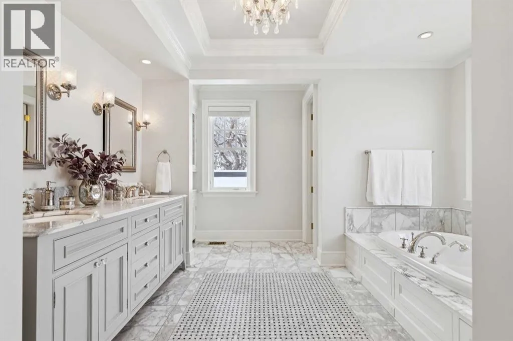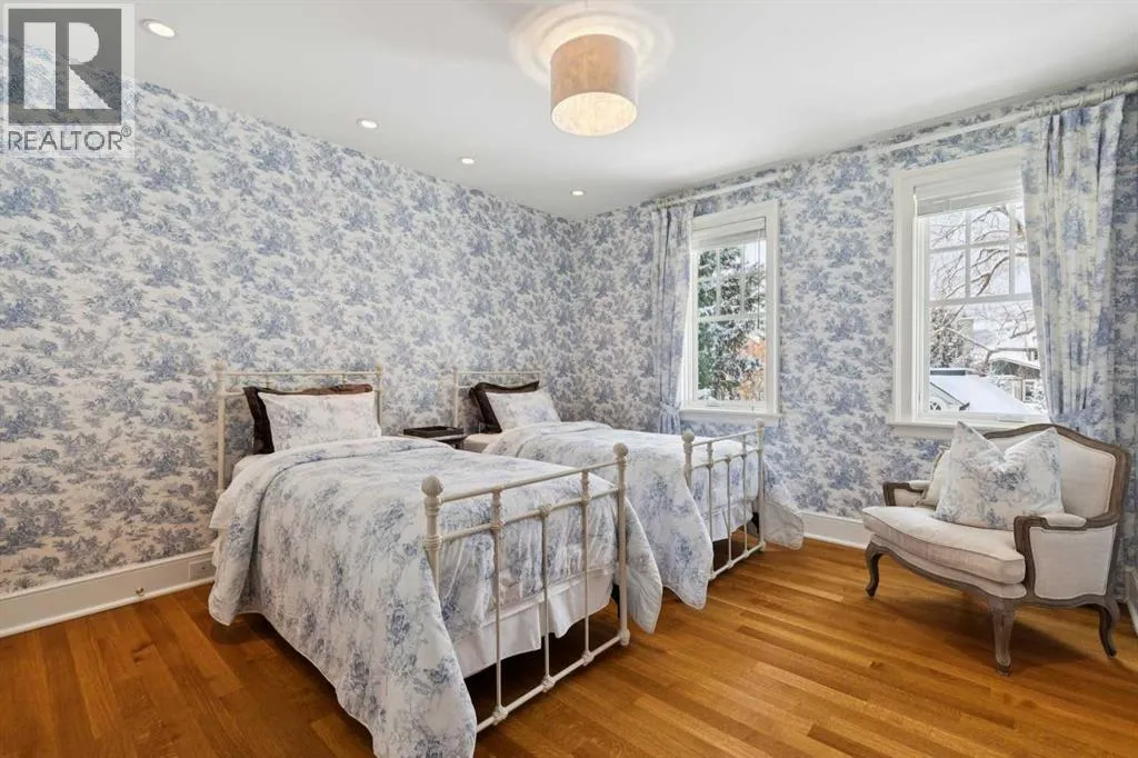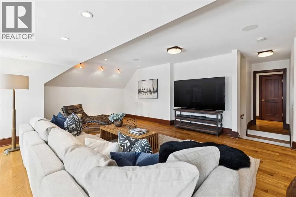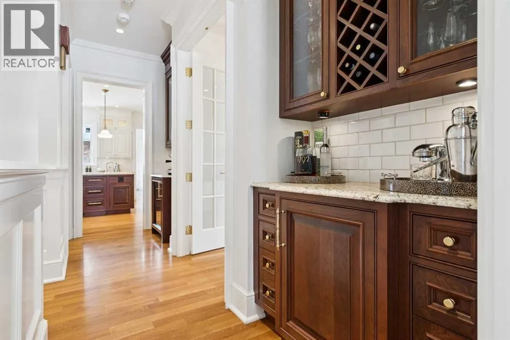 Georgian architecture meets uncompromising five-star luxury in this masterfully custom-built Mission residence (2013), offering nearly 7,000 square feet of impeccably curated living with six bedrooms, seven bathrooms, and hardwood flooring throughout. Ideally situated on an oversized lot in prestigious Upper Mount Royal, directly overlooking Talon Park, this residence represents a rare convergence of architectural integrity, craftsmanship, and location. Its stately presence is defined by a hand-cut brick and stone exterior, dual chimneys, and bespoke shutters, an enduring expression of timeless design. A central hall introduces interiors of exceptional refinement. The formal dining room is exquisitely appointed with hand-cut wainscoting, custom millwork, and tailored doors, creating a distinguished setting for entertainment. Opposite, a richly paneled walnut library offers a sense of quiet sophistication, complete with custom cabinetry, a Rumford masonry fireplace, and bespoke lighting, both intimate and impressive in equal measure. The chefâs kitchen is designed without compromise, featuring top-tier integrated appliances, an expansive island, a generous pantry, and finely crafted custom cabinetry. It transitions seamlessly into the informal dining area and an inviting family room, where French doors open to the outdoor living spaces. Here, a thoughtfully designed patio with BBQ area, built-in fireplace, and beautifully landscaped gardens extends the homeâs living experience outdoors, perfectly suited for both elegant entertaining and relaxed daily living. The main floor is further complemented by a private office and a substantial mudroom with direct access to one of the two heated coach house garages. Upstairs, the primary suite is a private sanctuary, appointed with custom closets, silk drapery, and a spa-inspired ensuite featuring heated marble floors and an oversized thermomasseur tub. Generously scaled secondary bedrooms include a Jack-and-Jill bathroom, an additional private bedroom, and bathroom. A versatile upper lounge provides an expansive, secluded retreat for family or guests, complete with bedroom and bathroom, ideal for movies, study, or quiet relaxation. The fully developed lower level continues the homeâs commitment to elevated living, offering a custom bar, dedicated movie area, games area, fitness space, steam room, and a laundry & arts room with ample storage, all meticulously designed to balance leisure, wellness, and practicality. Completing this exceptional offering are two heated coach house garages with capacity for four large vehicles, along with integrated sound and security systems. Properties of this calibre, defined by bespoke construction, architectural pedigree, and an irreplaceable setting are seldom available. This is a rare opportunity to acquire a truly distinguished residence in one of Calgaryâs most coveted enclaves. (id:27476)