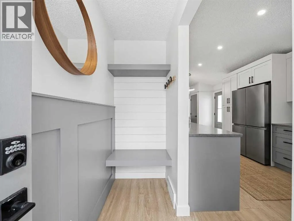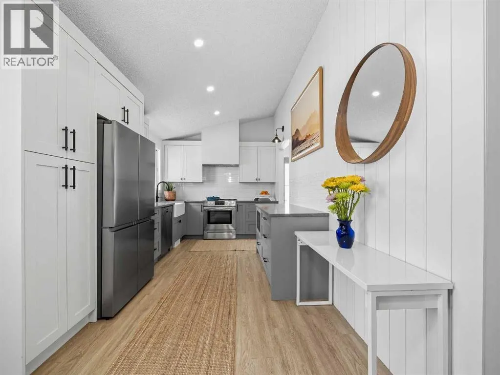 Rare opportunity to own a fully renovated bungalow with an oversized double detached garage in sought-after Huntington Hills NW. Offering 3 bedrooms, this home combines modern upgrades with timeless design, including new solar panels, a new heat pump/furnace combo, and a new roof on both the home and garage.Inside, youâll find an exceptional open-concept layout with vaulted ceilings, large windows, and a bright, airy feel. The designer kitchen features quartz countertops, white & grey shaker cabinetry, matte black hardware, subway tile backsplash, and new stainless steel appliances. The living area is warm and inviting with a wood-burning fireplace, while the main floor is completed by three spacious bedrooms and a beautifully renovated full bathroom with modern finishes.The partially finished basement offers high ceilings and future development potential. Outside, enjoy a fully fenced yard, west-facing backyard with patio and gas line, east-facing front porch, and a rubber-paved driveway with ample parking.Located on a quiet street just minutes to schools, parks, shopping, and the inner city, this home offers the perfect blend of style, efficiency, and convenience.Book your private showing today. (id:27476)