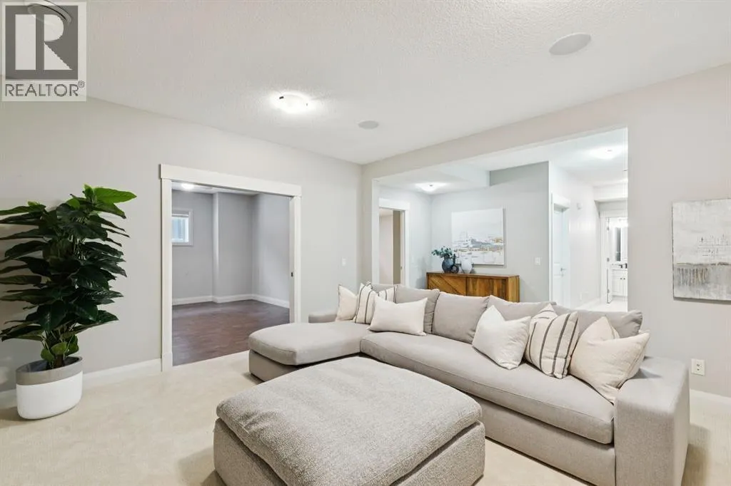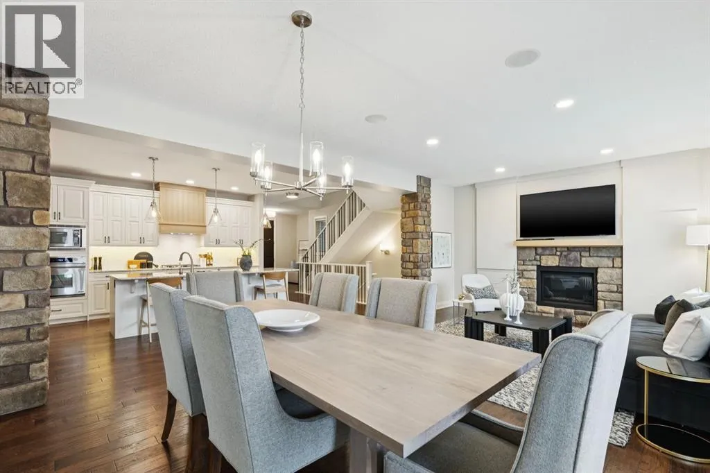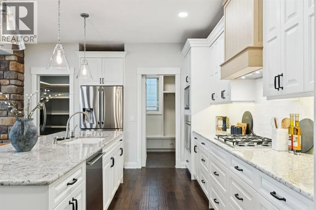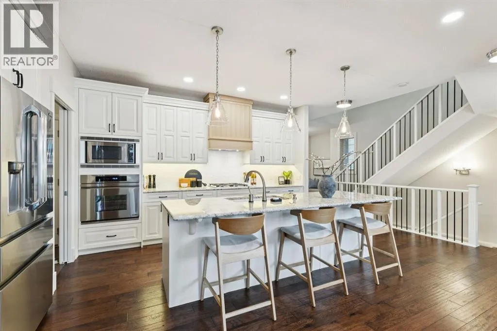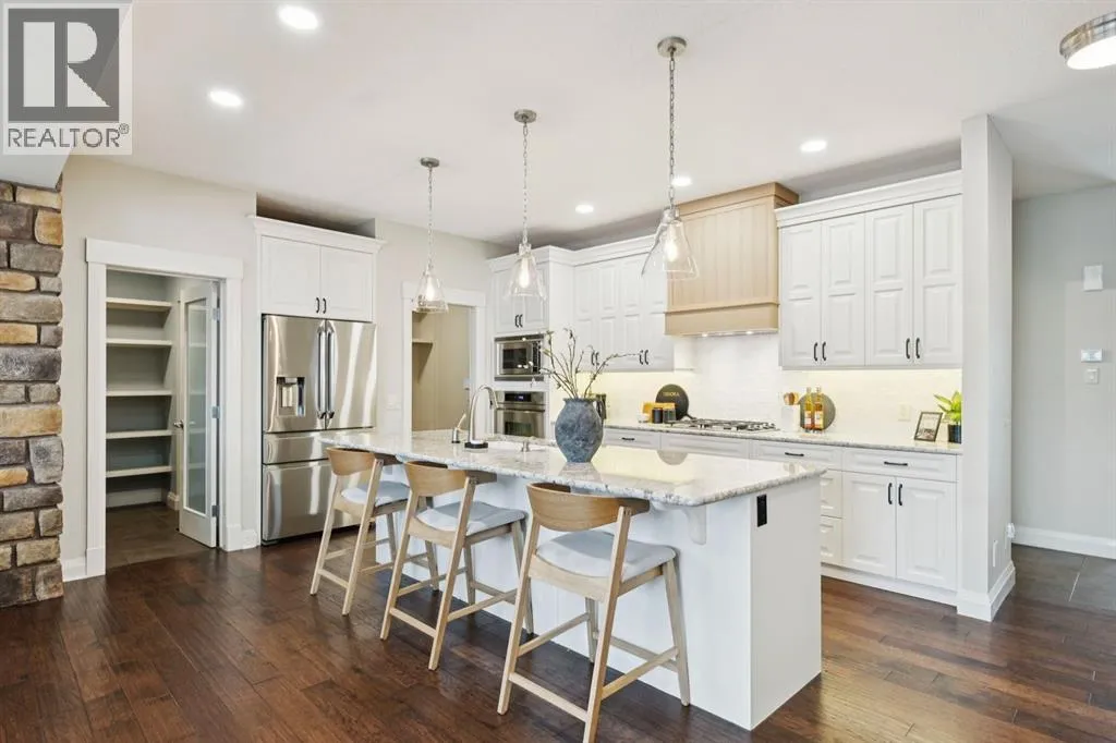 This beautifully updated home in one of Aspenâs most desirable pockets offers the kind of effortless lifestyle todayâs families are looking for with recent renovations, an immaculate turn-key condition, and ready to you to simply move in and enjoy. From the moment you step inside, the home feels warm, inviting, and thoughtfully designed for everyday living. An open-concept main floor seamlessly connects the living, dining, and kitchen spaces, making it ideal for both relaxed family time and entertaining. The living room is anchored by a fireplace and framed by large windows that fill the space with natural light, while the dining area opens onto a generous west-facing deck, perfect for summer evenings and sunset dinners. Just off the dining area, a tucked-away home office sits behind French doors, complete with built-in desks for two, and designer wallpaper. Itâs the perfect place to work from home or keep an eye on homework while staying connected to the heart of the house. The kitchen is timeless and functional, designed with both beauty and practicality in mind. A large central island with seating invites gathering, while a gas cooktop, wall oven, and a well-appointed pantry with additional fridge/freezer make it a dream for home chefs. The pantry conveniently connects to an organized mudroom and out to the triple garage, making daily routines seamless. Upstairs, a cozy loft offers a flexible space for kids to relax or watch TV. Down the hallway, the primary suite is a luxurious retreat, featuring a spacious walk-in closet and a gorgeous, newly renovated ensuite with in-floor heating, a soaker tub, oversized shower, double vanities, water closet, high end finishes and stylish fixtures. Two additional bedrooms each offer their own walk-in closets and ensuites, offering privacy and space for each family member. A well-equipped laundry room with sink, storage, and drying rod adds everyday convenience. The fully developed basement expands your living space with a med ia room, home gym, fourth bedroom, and full bathroom. Outside, the west-facing backyard is beautifully landscaped for privacy, creating a serene setting to unwind at the end of the day. Additional features of note include updated cabinetry, a recent paint refresh, air conditioning, and Gemstone exterior lighting that enhances curb appeal. This home is ideally located just minutes from the shops and restaurants of Aspen Landing, top-tier schools like Rundle College, Calgary Academy, and Webber Academy. As well, Ernest Manning High School, Westside Recreation Centre, the C-Train, and Stoney Trail are only moments away. This is a home that truly balances lifestyle, location, and design. (id:27476)