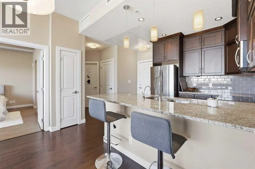 Perched on an upper floor in the highly sought-after community of Varsity Estates, this modern 1 bedroom plus den condo offers an open-concept layout in a CONCRETE BUILDING, providing excellent soundproofing and long-term durability. The space is enhanced by impressive 10-FOOT CEILINGS and FLOOR-TO-CEILING WINDOWS, allowing natural light to fill the home throughout the day. The spacious kitchen is designed for both everyday living and entertaining, featuring QUARTZ COUNTERTOPS, FULL-HEIGHT CABINETRY, STAINLESS STEEL APPLIANCES, and a generous breakfast bar that flows seamlessly into the living and dining areas. A versatile den with a pocket door provides the perfect HOME OFFICE or flex space for todayâs lifestyle. The primary bedroom includes a walk-through closet with custom organizers and access to a spa-inspired bathroom complete with an OVERSIZED GLASS SHOWER and built-in bench. Comfort is elevated with CENTRAL AIR CONDITIONING, IN-SUITE LAUNDRY, TITLED UNDERGROUND PARKING, and an ASSIGNED STORAGE LOCKER. Residents also enjoy access to exceptional rooftop amenities, including a ROOFTOP FITNESS CENTER, STEAM ROOMS, OWNERâS LOUNGE, and an outdoor terrace with BBQs and mountain views. The location is incredibly convenient â just steps to cafes, restaurants, shops, and everyday amenities, with DALHOUSIE LRT, UNIVERSITY OF CALGARY, and MARKET MALL nearby. An excellent opportunity for first-time buyers, professionals, investors, or those looking to downsize without compromise while owning in a well-built concrete building in one of Calgaryâs most desirable communities. (id:27476)