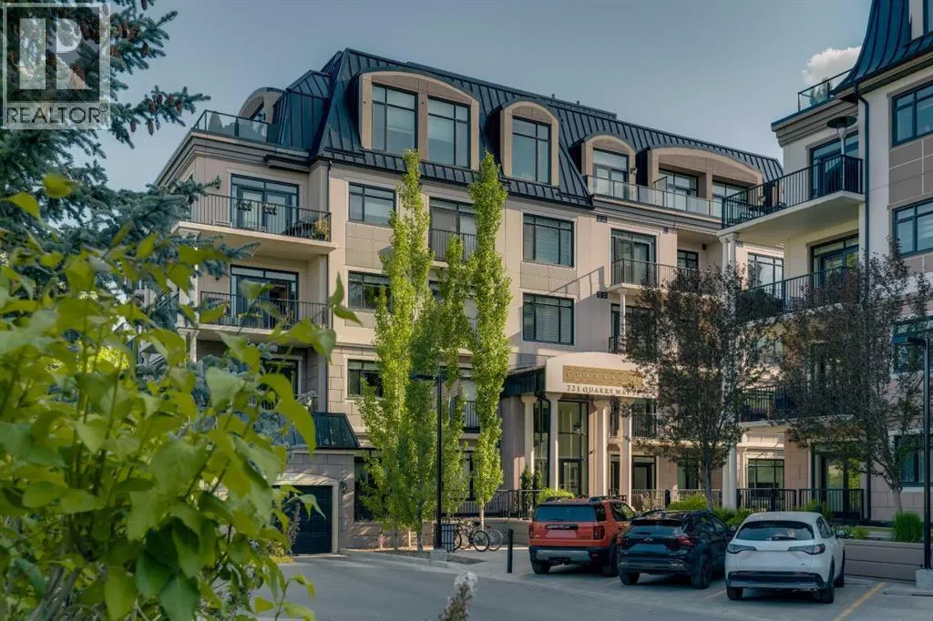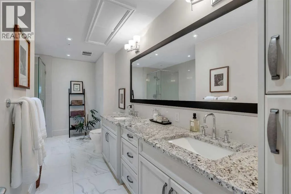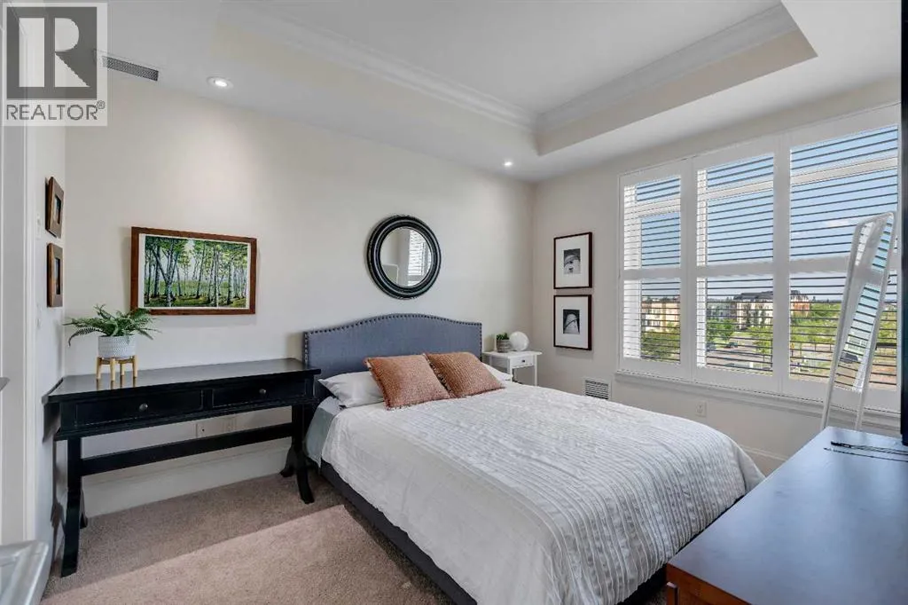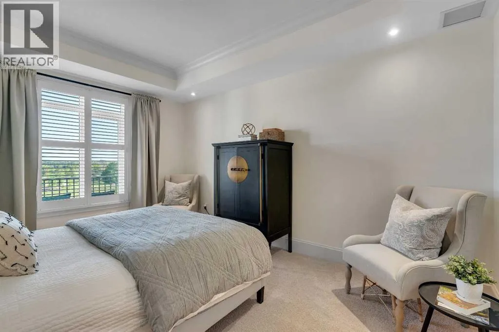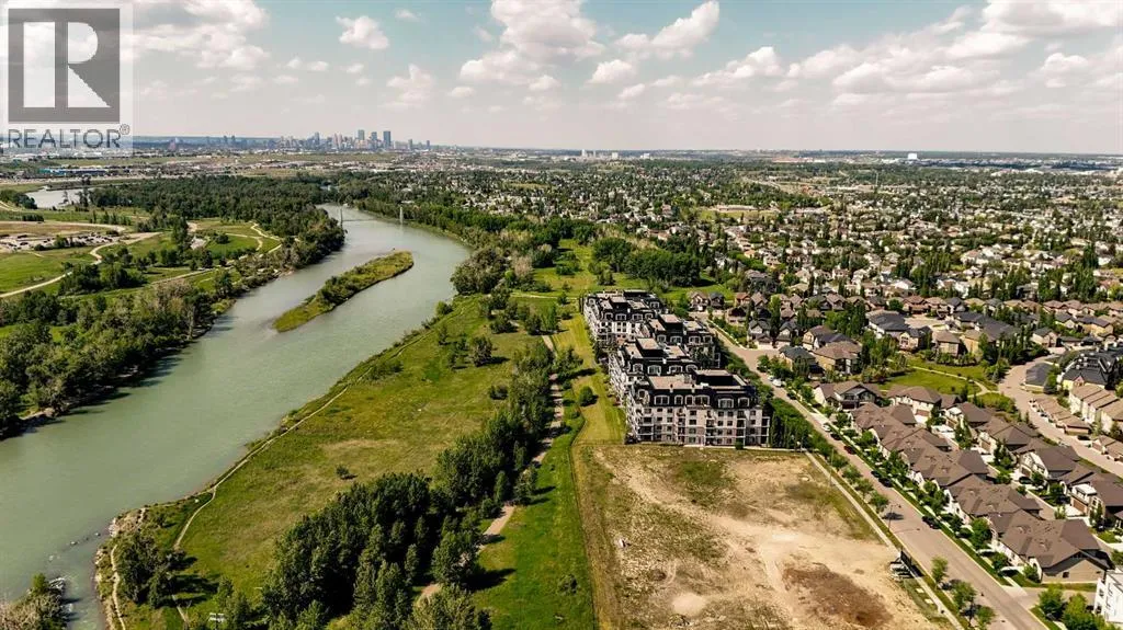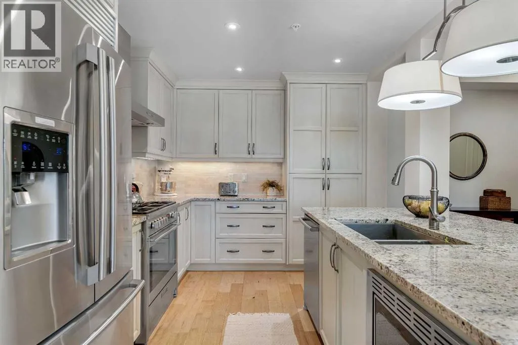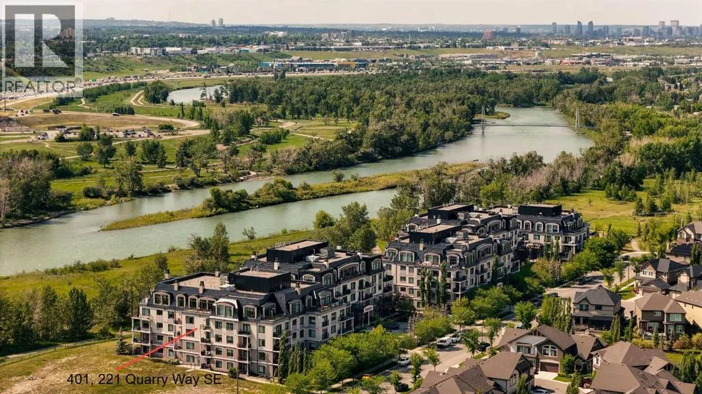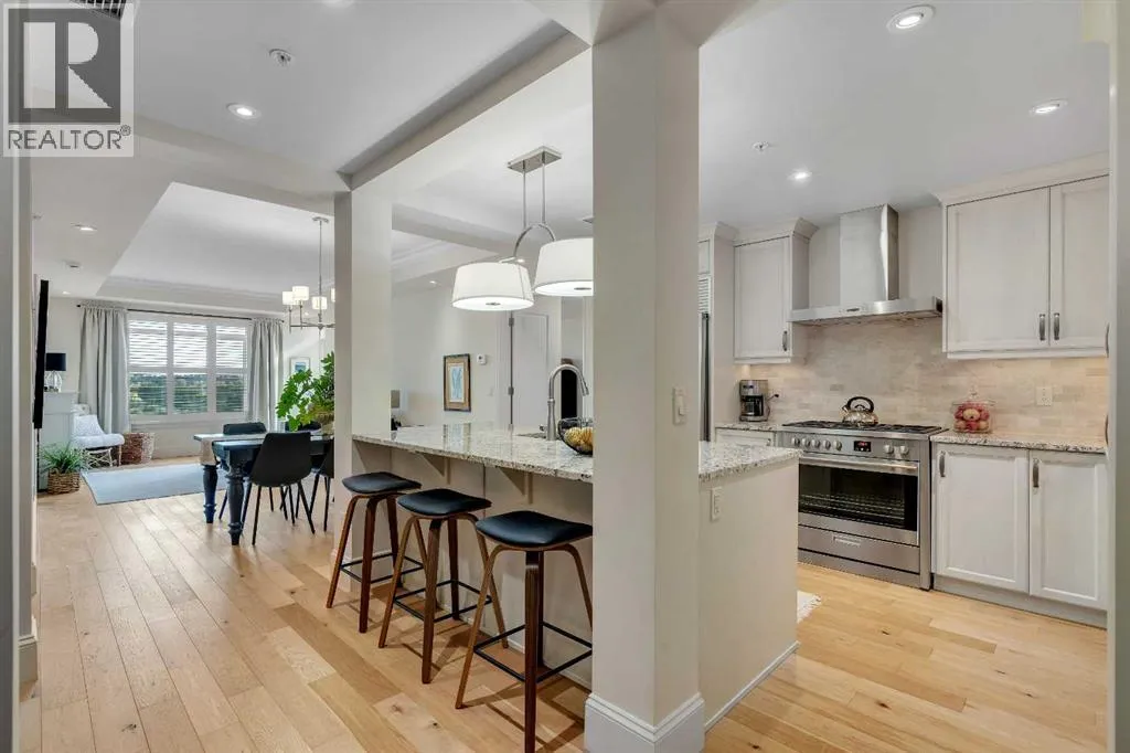 Experience luxury living in this spacious 2-bedroom plus den condo in the prestigious, concrete-built Champagne residence. Located on the fourth floor, this south-facing unit offers views of the Bow River to the west and over 1,250 sq ft of thoughtfully designed living space. The open-concept layout includes a beautiful gourmet kitchen featuring full-height warm white cabinetry, granite countertops, a large island with seating, and high-end stainless steel appliances including a gas range. The kitchen flows effortlessly into the dining area and bright, airy living room, where large windows and a patio door open onto a private balcony with a gas hookup.The expansive primary suite easily accommodates a king-sized bed and additional furniture, and includes a walk-in closet and a luxurious 5-piece ensuite with double sinks, a soaker tub, and a glass-enclosed shower. A second bedroom is positioned on the opposite side of the unit for added privacy and is adjacent to a stylish 4-piece bath. The separate den makes an ideal home office or flex space. Additional features include wide plank hardwood flooring throughout the main living areas, tray ceilings with pot lighting in the dining and living rooms, central A/C, and upgraded window shutters. This unit also includes a titled oversized underground parking stall and a titled storage locker. Champagne is a pet-friendly, exceptionally maintained building offering amenities such as a two-bay car wash, secure bike storage, and ample visitor parking. The location is unbeatableâjust steps from the Bow River pathway system, Carburn Park, Sue Higgins Park, and all the amenities of Quarry Park, including the YMCA, shops, restaurants, and more. With quick access to major routes, commuting is easy and convenient. Donât miss out on this opportunity! (id:27476)
