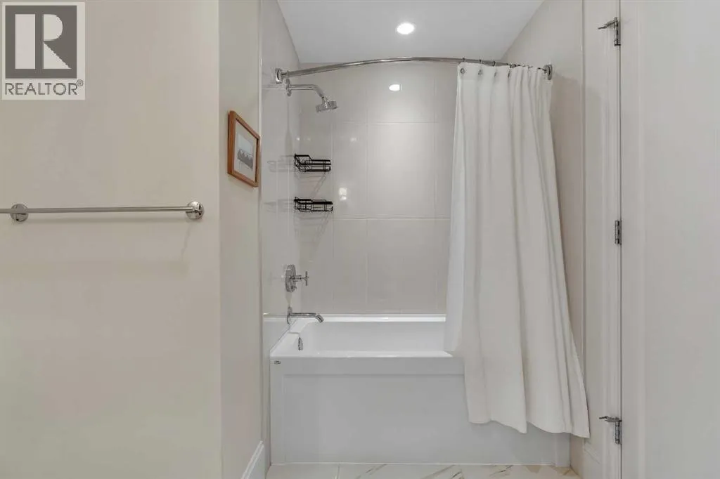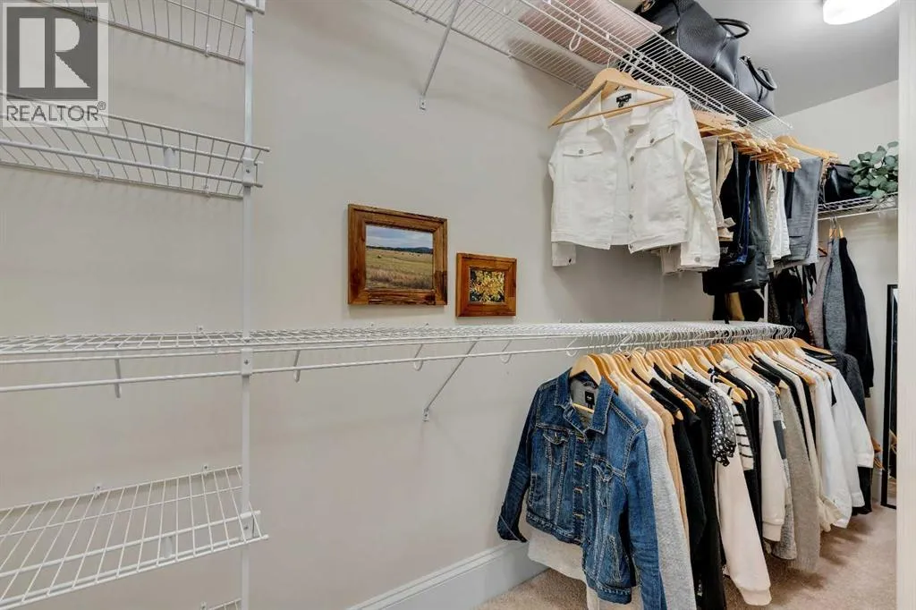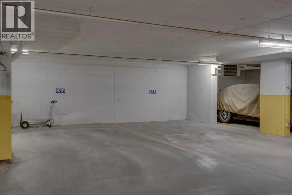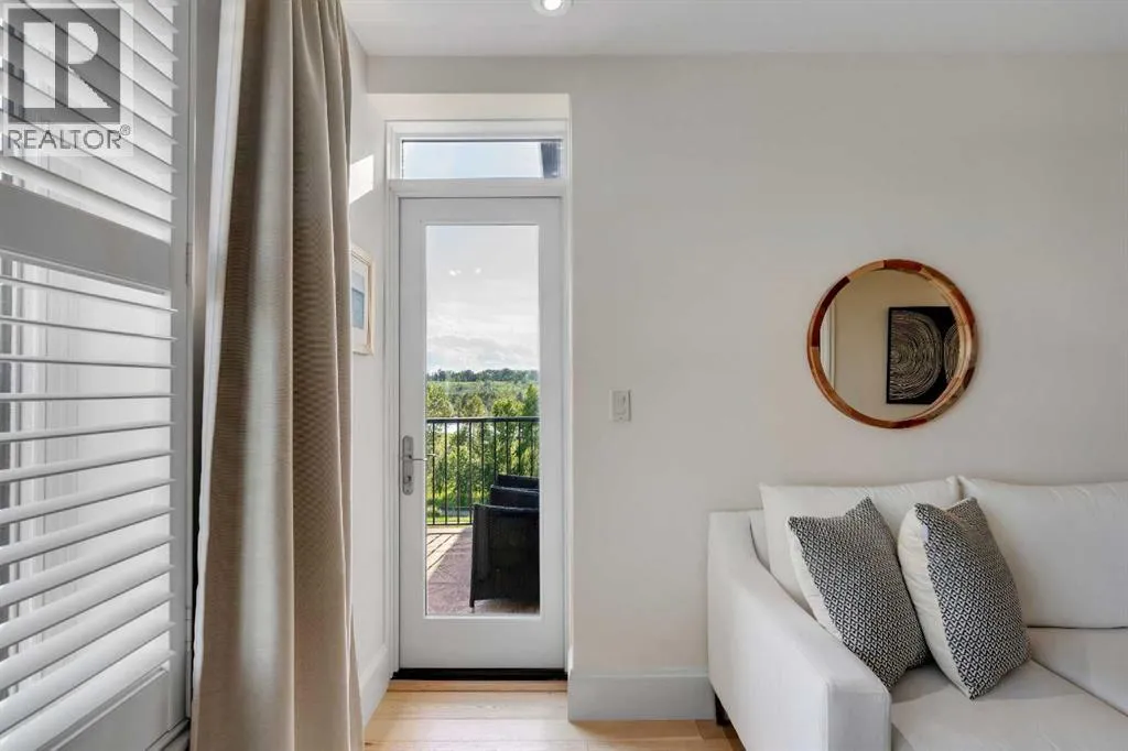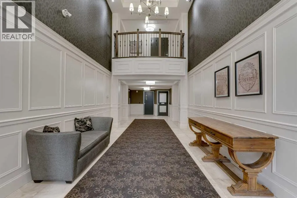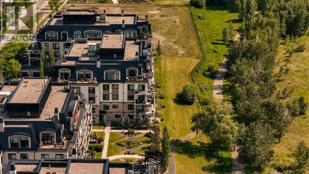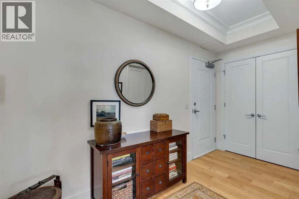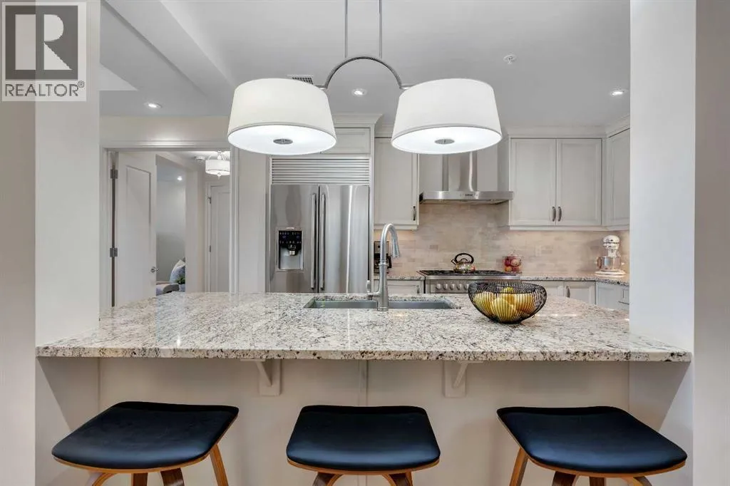 Experience luxury living in this spacious 2-bedroom plus den condo in the prestigious, concrete-built Champagne residence. Located on the fourth floor, this south-facing unit offers views of the Bow River to the west and over 1,250 sq ft of thoughtfully designed living space. The open-concept layout includes a beautiful gourmet kitchen featuring full-height warm white cabinetry, granite countertops, a large island with seating, and high-end stainless steel appliances including a gas range. The kitchen flows effortlessly into the dining area and bright, airy living room, where large windows and a patio door open onto a private balcony with a gas hookup.The expansive primary suite easily accommodates a king-sized bed and additional furniture, and includes a walk-in closet and a luxurious 5-piece ensuite with double sinks, a soaker tub, and a glass-enclosed shower. A second bedroom is positioned on the opposite side of the unit for added privacy and is adjacent to a stylish 4-piece bath. The separate den makes an ideal home office or flex space. Additional features include wide plank hardwood flooring throughout the main living areas, tray ceilings with pot lighting in the dining and living rooms, central A/C, and upgraded window shutters. This unit also includes a titled oversized underground parking stall and a titled storage locker. Champagne is a pet-friendly, exceptionally maintained building offering amenities such as a two-bay car wash, secure bike storage, and ample visitor parking. The location is unbeatableâjust steps from the Bow River pathway system, Carburn Park, Sue Higgins Park, and all the amenities of Quarry Park, including the YMCA, shops, restaurants, and more. With quick access to major routes, commuting is easy and convenient. Donât miss out on this opportunity! (id:27476)