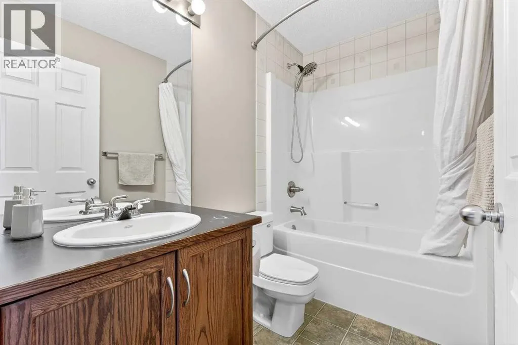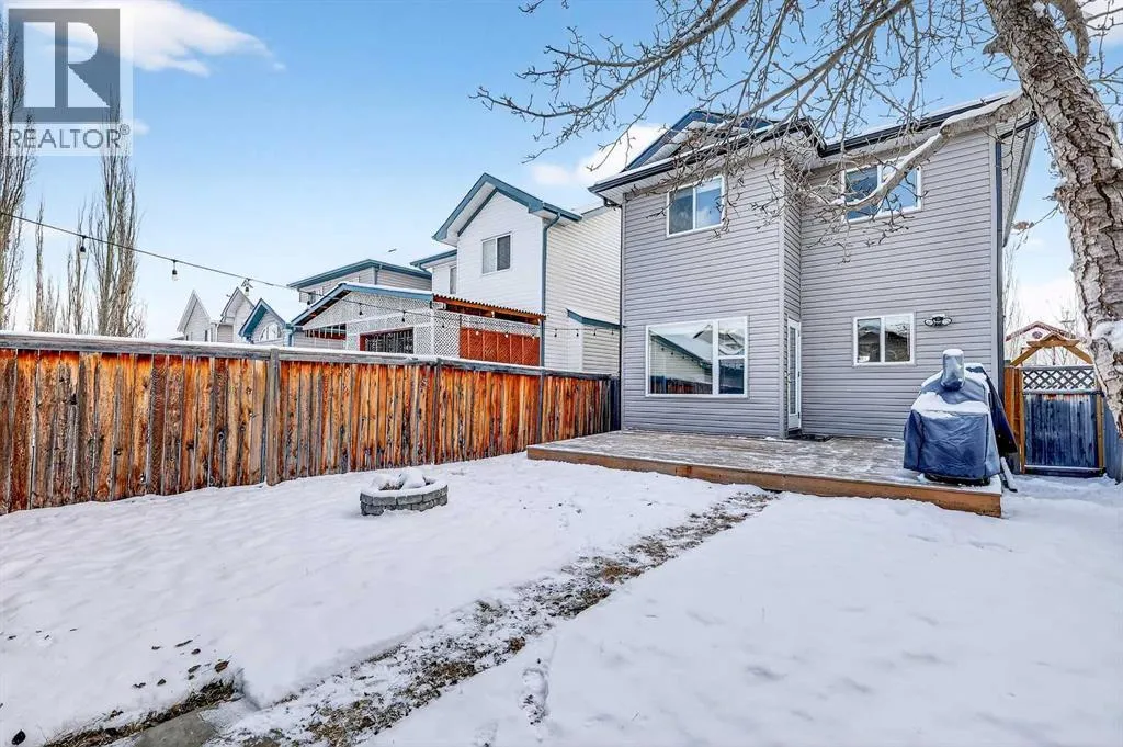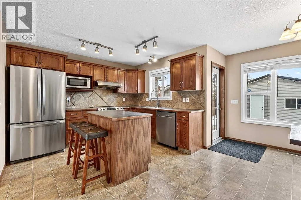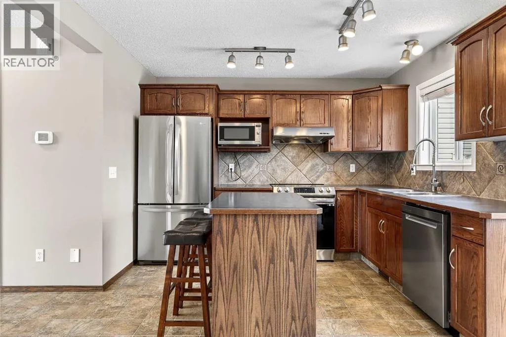 Wow!! Mr. and Mrs. Clean live here!! Welcome to this splendid two-story, three bedroom, 2.5 bath home on quiet street! This well-loved and maintained home is pristine and turn-key ready! Main floor boasts generous entry, cozy living room and functional kitchen with island, pantry and large eating space! Convenient 2pc bathroom has full vanity and custom paint application! Newer carpet and quality lino grace the main floor, the living room features a tiled corner gas fireplace and east facing windows that bathe the room daily with sunshine! The kitchen offers dark oak cabinetry, custom backsplash, new faucet, and stainless steel appliances including a newer gas range and dishwasher, both high-end. The island offers comfortable stool seating for casual meals or visiting while dinner is prepared. Large eating area includes an alcove suitable for a sideboard or cabinet, and provides access to west backyard and newer large platform deck! More windows provide even more sunshine through the day! Other upgrades include arches, wood-finished ledges, tiles to the ceiling in bathing areas and wide staircase to the upper level! The primary bedroom is king-sized and provides private access to the fantastic ensuite with window, full vanity (including drawers) and over-sized shower! The two secondary bedrooms are of generous size and share a four-piece bathroom and full vanity. The undeveloped basement is currently utilized for a work-out space & storage but offers rough-in for a future third bathroom! When imagining this future space, be reminded that the door envelope at the bottom of the staircase can be removed and is only there for fire code reasons (door between upstairs and furnace). The nicely fenced WEST facing backyard is clean and tidy with lots of room for gardening, a fire pit and recently pruned pear tree! Best of all, welcome to your excellent OVER-SIZED double garage with built-in shelving for storage! NEW ROOF (2022) INCLUDING GARAGE! Located only a block from Ma rshall Springs school, a 3 minute drive to Evergreen school, Stoney Trail and all amenities! A short walk or drive to FISHCREEK PARK! This home is perfect for first-time buyers, couples and young families!! (id:27476)
