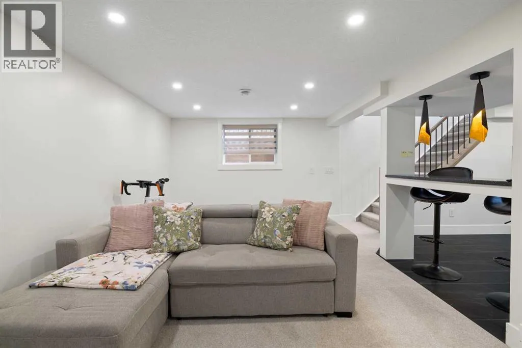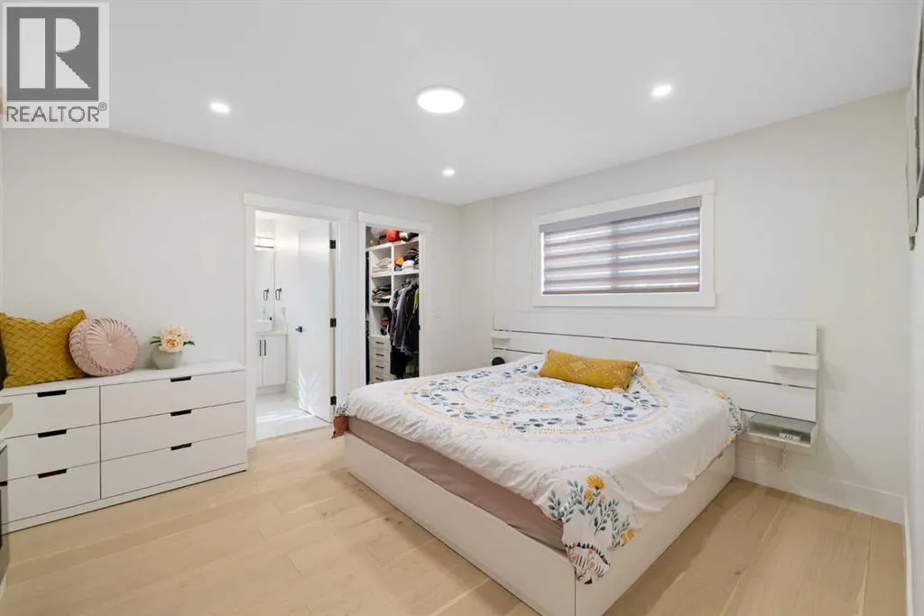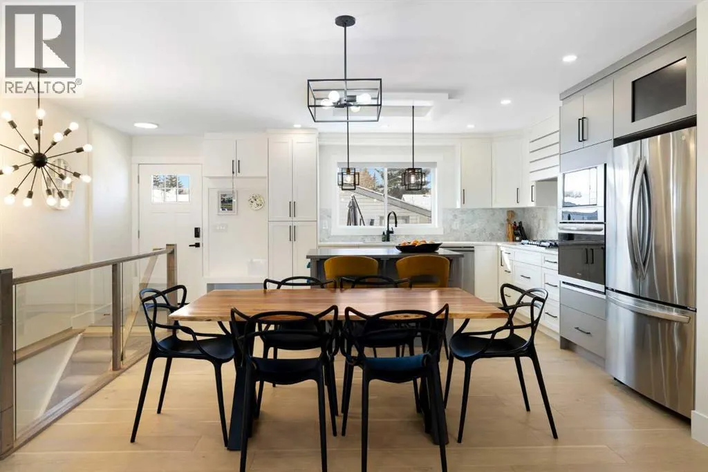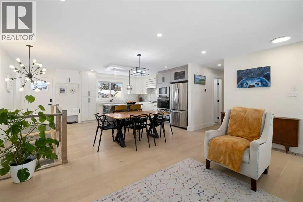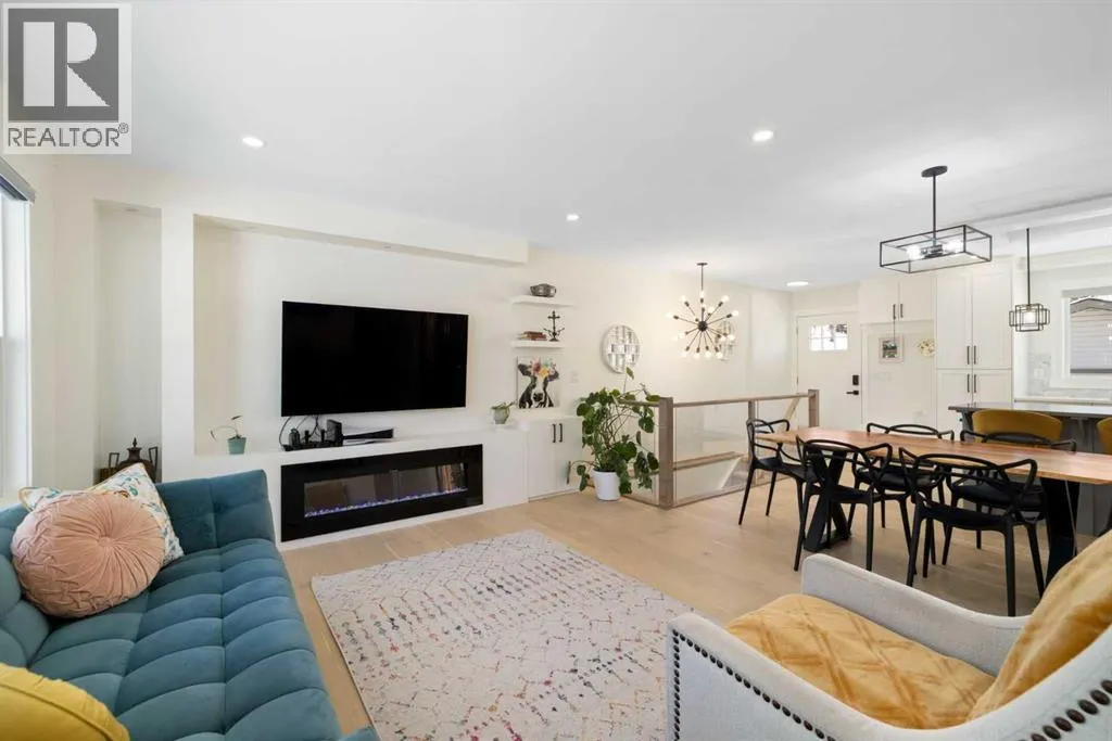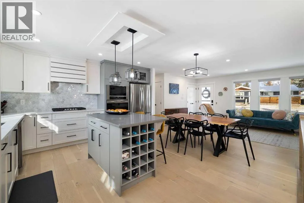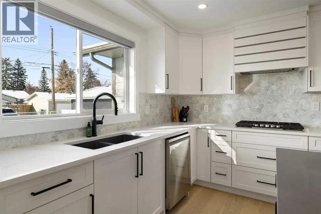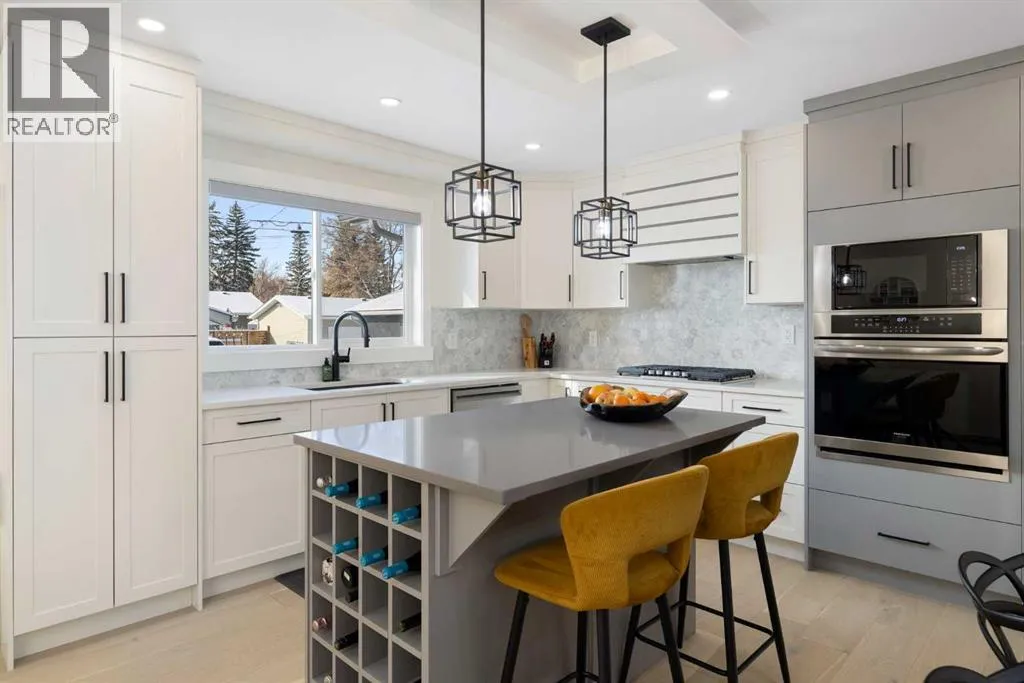 Exquisitely renovated 1,231 sq ft bungalow in the highly sought-after community of Acadia, set on a quiet, tree-lined street. This exceptional 5-bedroom home blends modern design with everyday comfort. Natural light fills the open-concept main floor, where the bright living area is anchored by a sleek built-in fireplace, creating a warm and inviting space for both relaxing and entertaining. The chef-inspired kitchen is a true highlight, featuring full-height custom cabinetry, quartz countertops, gas range, custom hood fan, built-in wall oven, and premium stainless-steel appliances. Engineered hardwood flooring runs throughout the main level. The primary suite offers a private retreat with its own fireplace and a spa-inspired 5-piece ensuite with heated floors, fully tiled shower, deep soaker tub, and dual vanities. Two additional bedrooms and a full bathroom complete the main level. A striking glass and maple staircase leads to the fully developed basement, featuring a spacious family room, stylish bar area, dedicated laundry room, two additional bedrooms, and a 3-piece bathroom. Extensive upgrades include renovated kitchen and bathrooms, custom remote blinds, interior doors, water softener and filtration system, upgraded electrical, furnace, basement system, sump pump, new windows and roof (2021), and a professionally installed home security system with camera coverage. The exterior is finished with Hardie board siding, aluminum accents, new gutters, soffits, fascia, exterior doors, and upgraded insulation.Enjoy outdoor living with a concrete patio, raised garden bed, and plenty of space to relax or entertain. 22' x 22' (exterior msmt) drywalled detached garage and dedicated RV pad add exceptional functionality.Ideally located close to public, Catholic, Charter, Francophone schools, transit, parks, tennis courts, pool and fitness center, shops, cafes & major routes including Deerfoot, Blackfoot, and Macleod Trail. Turn-key, fully upgraded, and move-in ready, th is home offers a rare opportunity to enjoy refined living in one of Calgaryâs most establish communities. (id:27476)