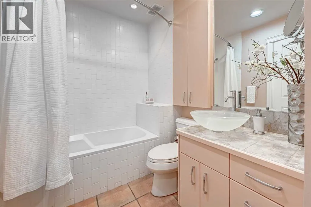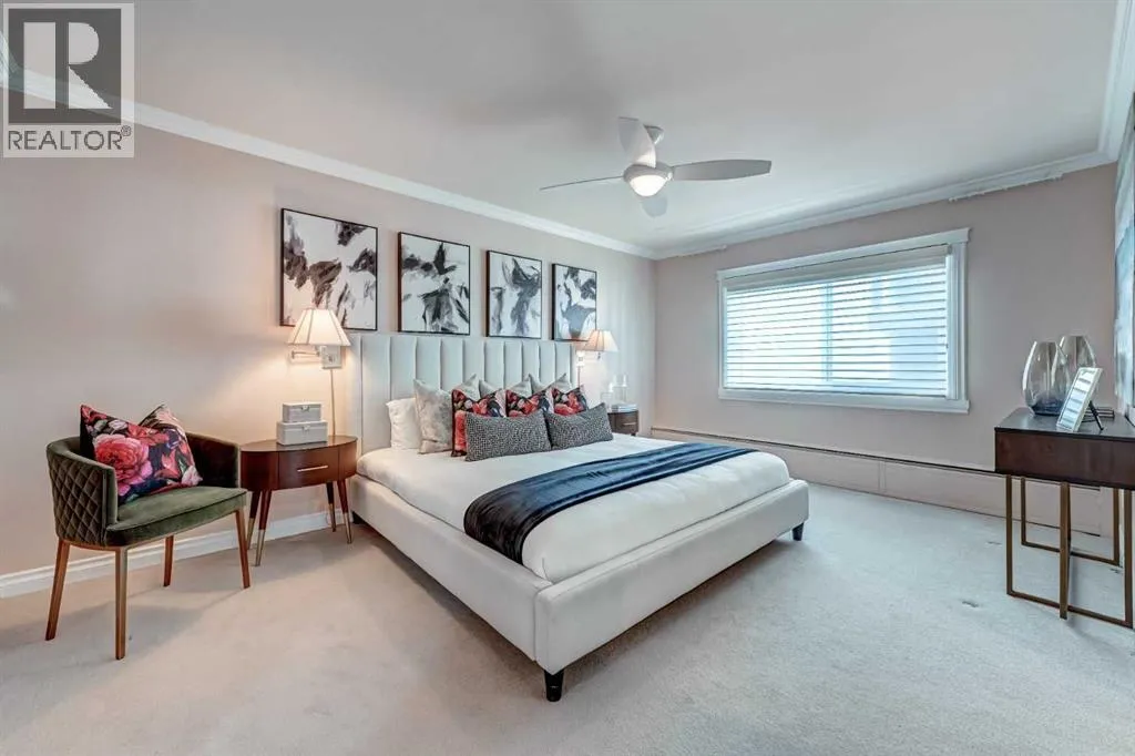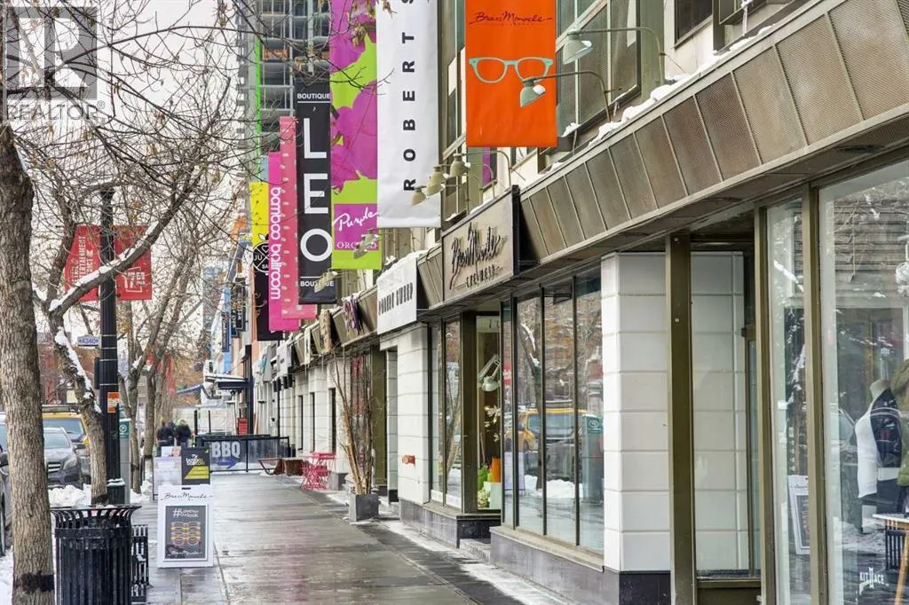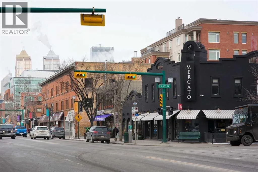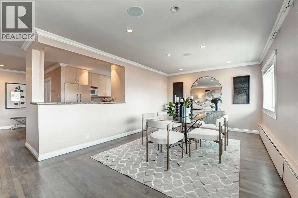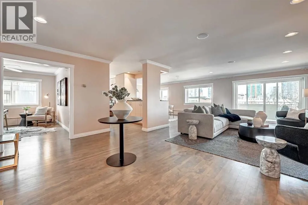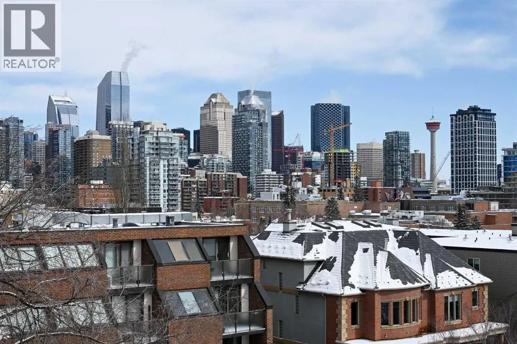 Discover the perfect blend of tranquility and city living in this TOP FLOOR, END UNIT, QUIET, CONCRETE condo offering unobstructed skyline VIEWS! Just steps from the vibrant cafés, boutiques, and restaurants of 4th Street, 17th Avenue, and the scenic Elbow River Pathways, this home places the best of Calgary right at your doorstep while giving you a peaceful retreat above it all.Inside, youâre welcomed by a spacious 1,434 sq ft OPEN CONCEPT layout bathed in natural light. Beautiful SITE FINISHED HARDWOOD, FLAT, painted ceilings, and expansive windows create a warm, sophisticated atmosphere throughout the main living areas. The generous Living, Dining, and Kitchen spaces are perfectly positioned to take in the sweeping cityscapeâan inspiring backdrop day and night. The well-appointed Kitchen offers abundant Granite counter space, excellent storage, and a pull-out pantry, making it as functional as it is stylish. A charming Denâeasily converted back into a bedroomâsits conveniently near a full bath, offering flexibility for guests, work, or hobbies. The Primary Suite is a true standout, comfortably fitting a King Bed and featuring an impressive custom Dressing Room created from a former bedroom. Paired with a private En-Suite and In-suite laundry, it delivers everyday luxury and convenience. Throughout the home, Hunter Douglas window coverings, including bedroom blackouts, add comfort and quality. Upgrades such as TRIPLE PANE Windows and a new Patio Door enhance energy efficiency and quiet enjoyment. Step outside to your LARGE PRIVATE BALCONY, where thereâs ample room for garden pots, lounging, and soaking in those stunning views.This well-managed building offers TITLED underground parking (no post-tension), a Separate Storage unit, bike storage,2 elevators, and access to a charming treed courtyard. Guests will appreciate the plentiful 2-hour free street parking. Pets are welcome with board approval. Move-in ready and offering the best of Inner-City living in a pea ceful, elevated settingâthis is the Mount Royal lifestyle youâve been waiting for. (id:27476)