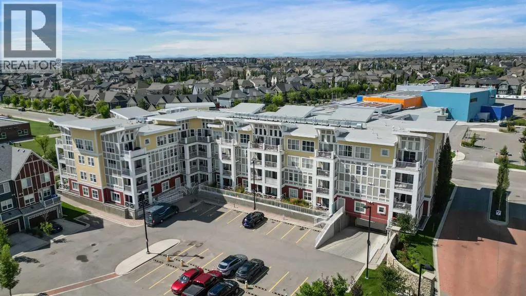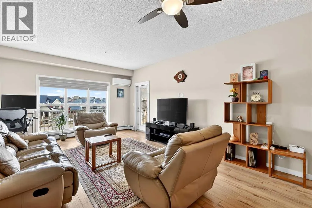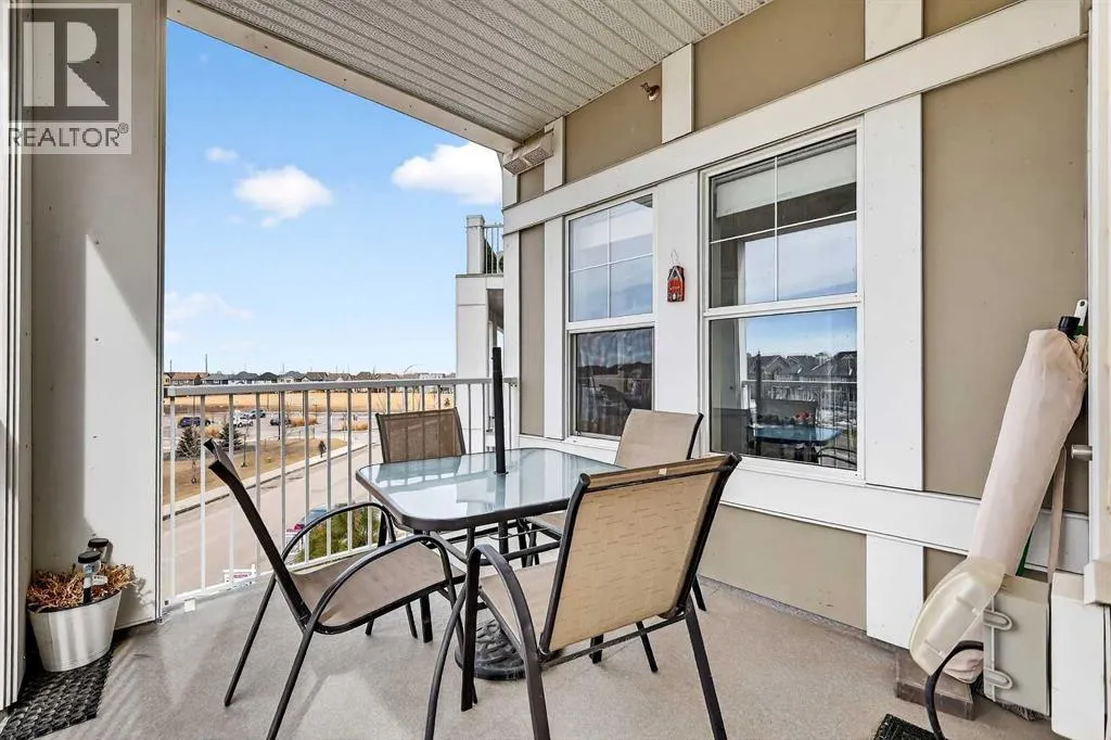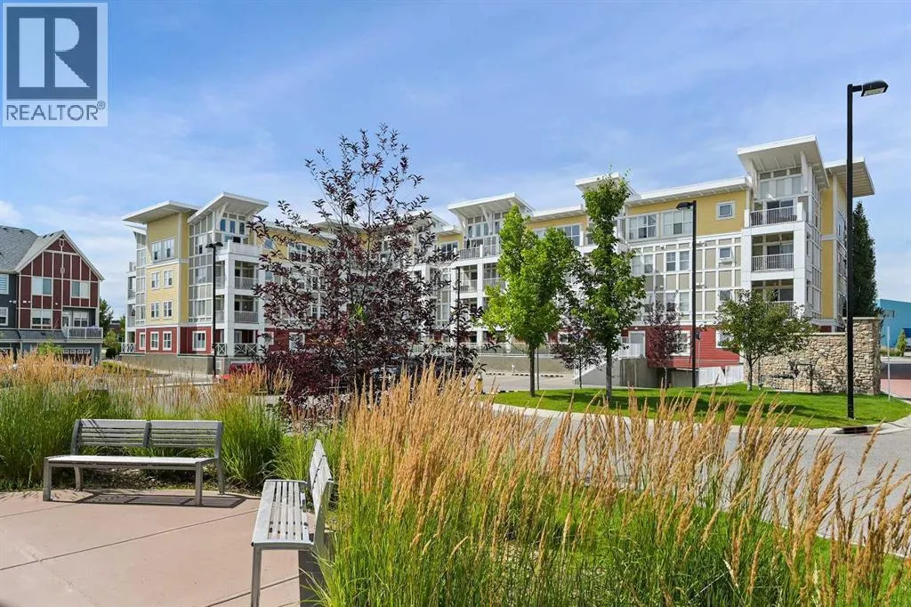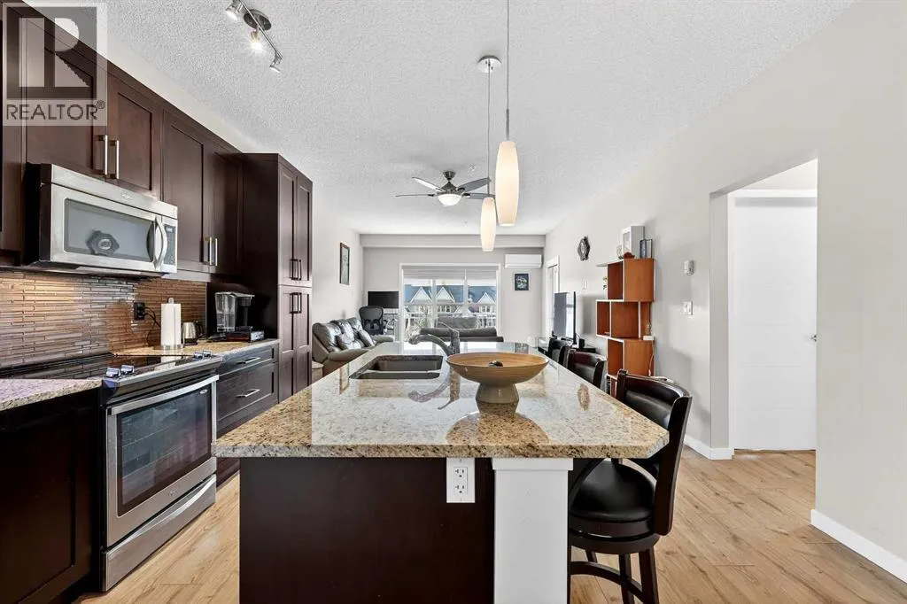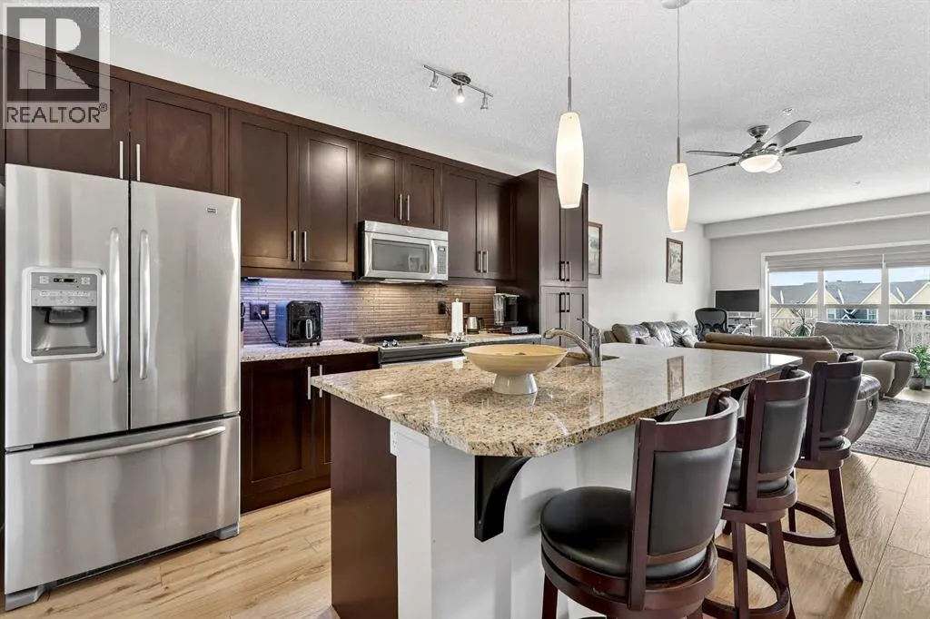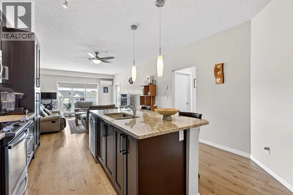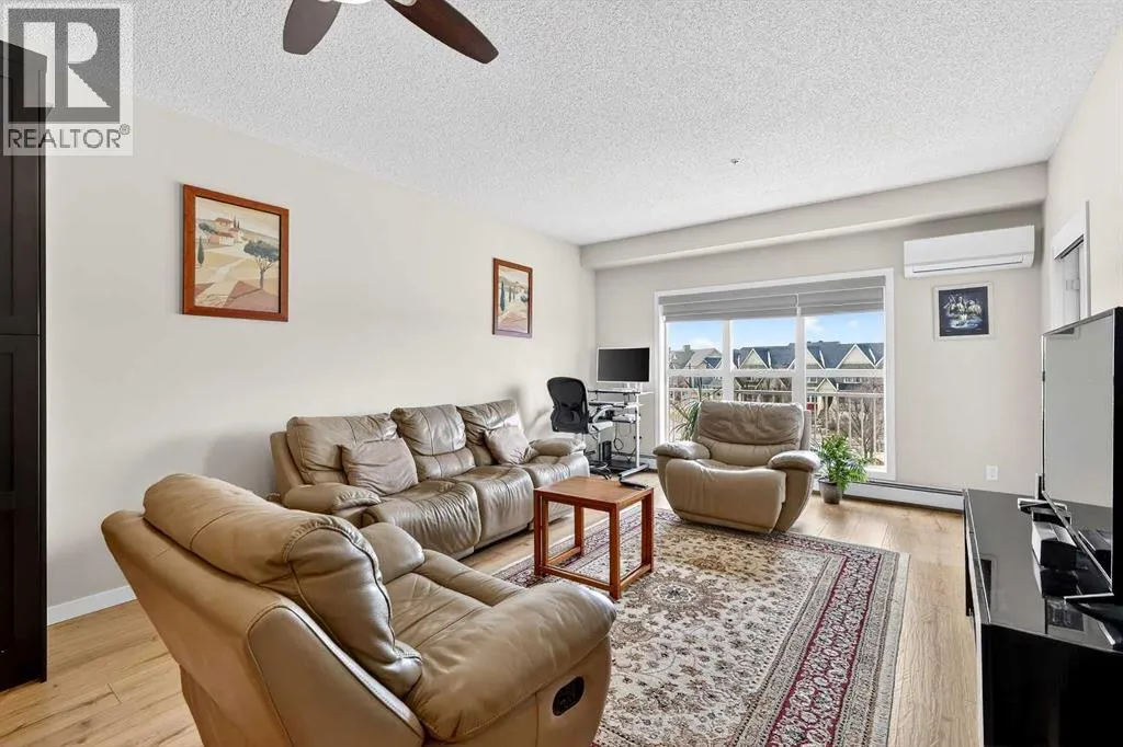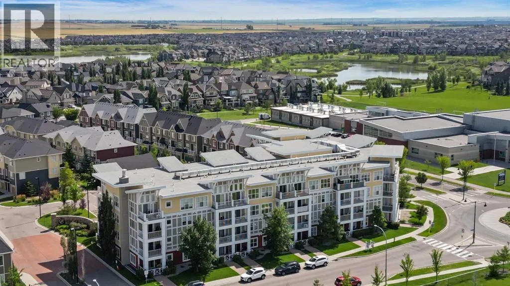 Welcome to Ebony in Mahoganyâwhere elevated condo living meets the beauty and lifestyle of Calgaryâs premier lake community. Perfectly positioned on the third floor with a coveted southwest exposure, this stunning and spacious apartment offers one of the largest floorplans in the complex, paired with an abundance of natural light and thoughtful design that sets it apart from the rest. From the moment you step inside, you are greeted by soaring ceilings just under 9 feet and oversized windows in both the living room and primary suiteâcreating a bright, open atmosphere that feels expansive and inviting. Bathed in warm evening sunlight, this home offers a truly special ambiance to be enjoyed throughout all four seasons. The kitchen is both stylish and functional, featuring rich dark cabinetry, elegant granite countertops, and a full stainless steel appliance package. A generous walk-in pantry provides exceptional storage and organization, while in-suite laundry adds everyday convenience. The kitchen flows seamlessly into the open-concept living and dining area, where warm-toned laminate flooring grounds the space and creates a cohesive, welcoming feel. The primary suite is a peaceful retreat, complete with a walk-through closet and a beautifully appointed 3-piece ensuite featuring granite countertops, timeless tile flooring, and an oversized walk-in shower with sleek glass doors. The second bedroom is equally impressive, offering a unique layout with a charming niche perfect for a reading nook, a Murphy bed for added versatility, and easy access to the 4-piece main bathroomâideal for guests or family. This home is loaded with additional features that elevate everyday living, including air conditioning, a spacious private deck with BBQ gas line, and the rare bonus of two tandem parking stalls. Residents of Ebony also enjoy access to an on-site fitness facility, playground, visitor parking, and the added peace of mind that comes with nearby traffic-calming school zones. The location is simply unbeatableâjust a few blocks from Mahoganyâs private lake and beach club, and directly across the street from two schools. Enjoy endless opportunities for outdoor living with nearby parks, pathways, and playgrounds, along with convenient access to shopping, dining, and major routes in and out of the community. This is more than a condoâitâs a lifestyle defined by light, space, and the vibrant energy of lake living. If youâve been searching for a home that offers exceptional design, incredible exposure, and everyday comfort in one of Calgaryâs most sought-after communities, this is the one. (id:27476)