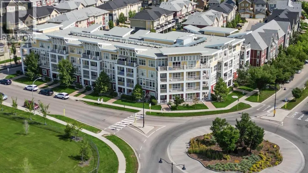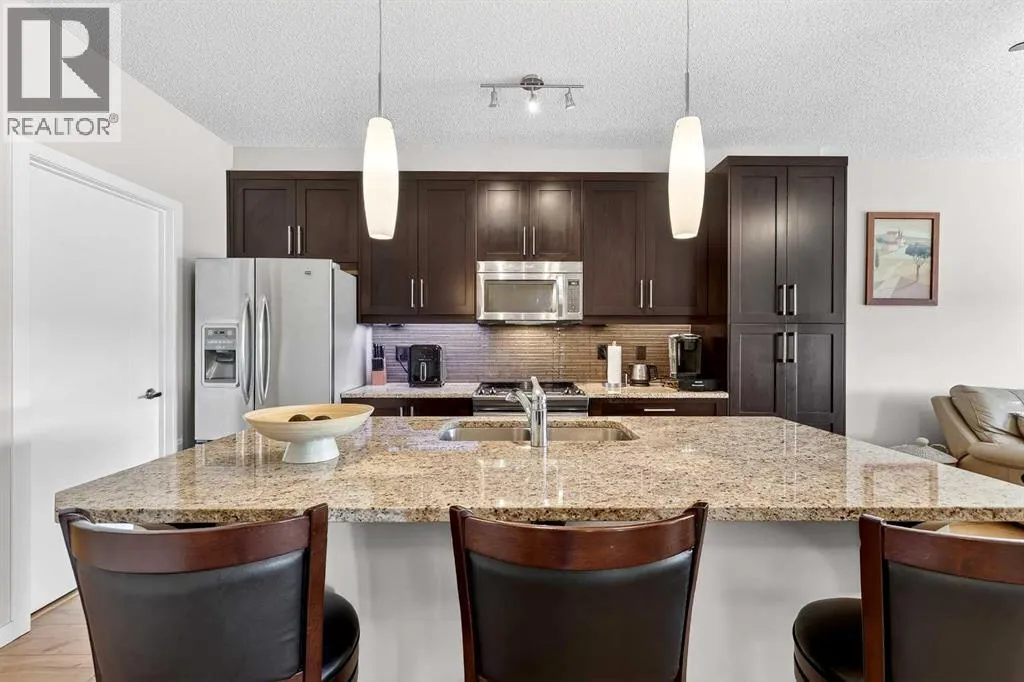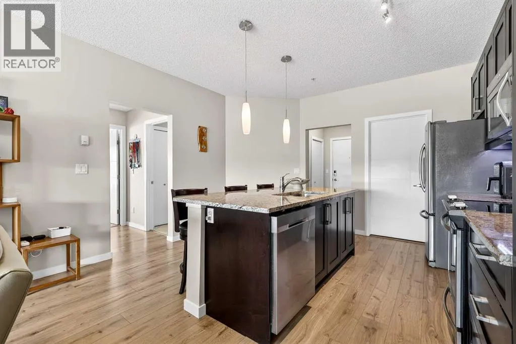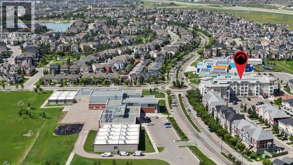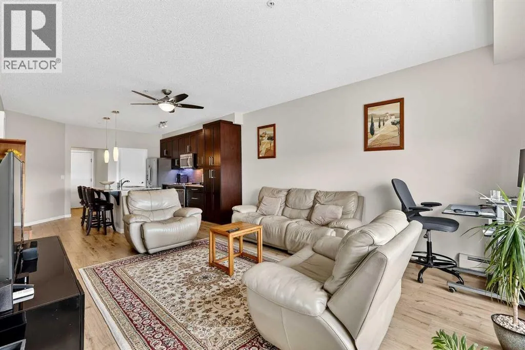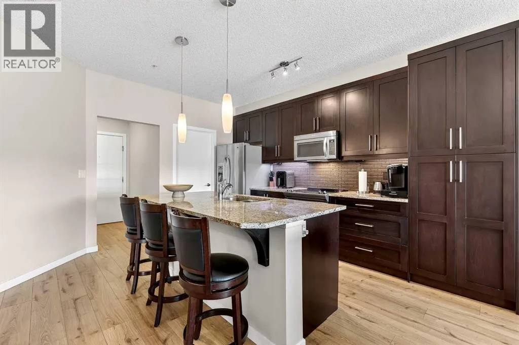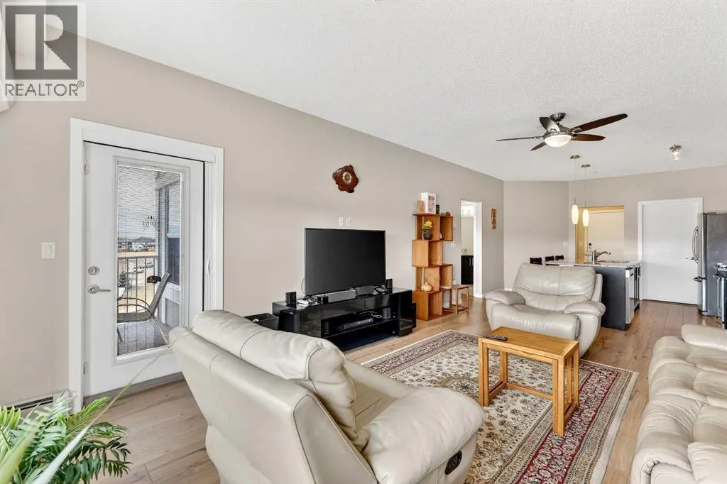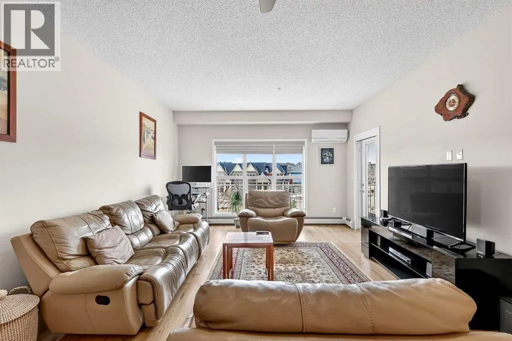 Welcome to Ebony in Mahoganyâwhere elevated condo living meets the beauty and lifestyle of Calgaryâs premier lake community. Perfectly positioned on the third floor with a coveted southwest exposure, this stunning and spacious apartment offers one of the largest floorplans in the complex, paired with an abundance of natural light and thoughtful design that sets it apart from the rest. From the moment you step inside, you are greeted by soaring ceilings just under 9 feet and oversized windows in both the living room and primary suiteâcreating a bright, open atmosphere that feels expansive and inviting. Bathed in warm evening sunlight, this home offers a truly special ambiance to be enjoyed throughout all four seasons. The kitchen is both stylish and functional, featuring rich dark cabinetry, elegant granite countertops, and a full stainless steel appliance package. A generous walk-in pantry provides exceptional storage and organization, while in-suite laundry adds everyday convenience. The kitchen flows seamlessly into the open-concept living and dining area, where warm-toned laminate flooring grounds the space and creates a cohesive, welcoming feel. The primary suite is a peaceful retreat, complete with a walk-through closet and a beautifully appointed 3-piece ensuite featuring granite countertops, timeless tile flooring, and an oversized walk-in shower with sleek glass doors. The second bedroom is equally impressive, offering a unique layout with a charming niche perfect for a reading nook, a Murphy bed for added versatility, and easy access to the 4-piece main bathroomâideal for guests or family. This home is loaded with additional features that elevate everyday living, including air conditioning, a spacious private deck with BBQ gas line, and the rare bonus of two tandem parking stalls. Residents of Ebony also enjoy access to an on-site fitness facility, playground, visitor parking, and the added peace of mind that comes with nearby traffic-calming school zones. The location is simply unbeatableâjust a few blocks from Mahoganyâs private lake and beach club, and directly across the street from two schools. Enjoy endless opportunities for outdoor living with nearby parks, pathways, and playgrounds, along with convenient access to shopping, dining, and major routes in and out of the community. This is more than a condoâitâs a lifestyle defined by light, space, and the vibrant energy of lake living. If youâve been searching for a home that offers exceptional design, incredible exposure, and everyday comfort in one of Calgaryâs most sought-after communities, this is the one. (id:27476)