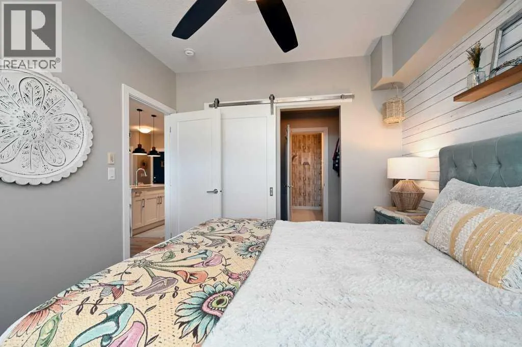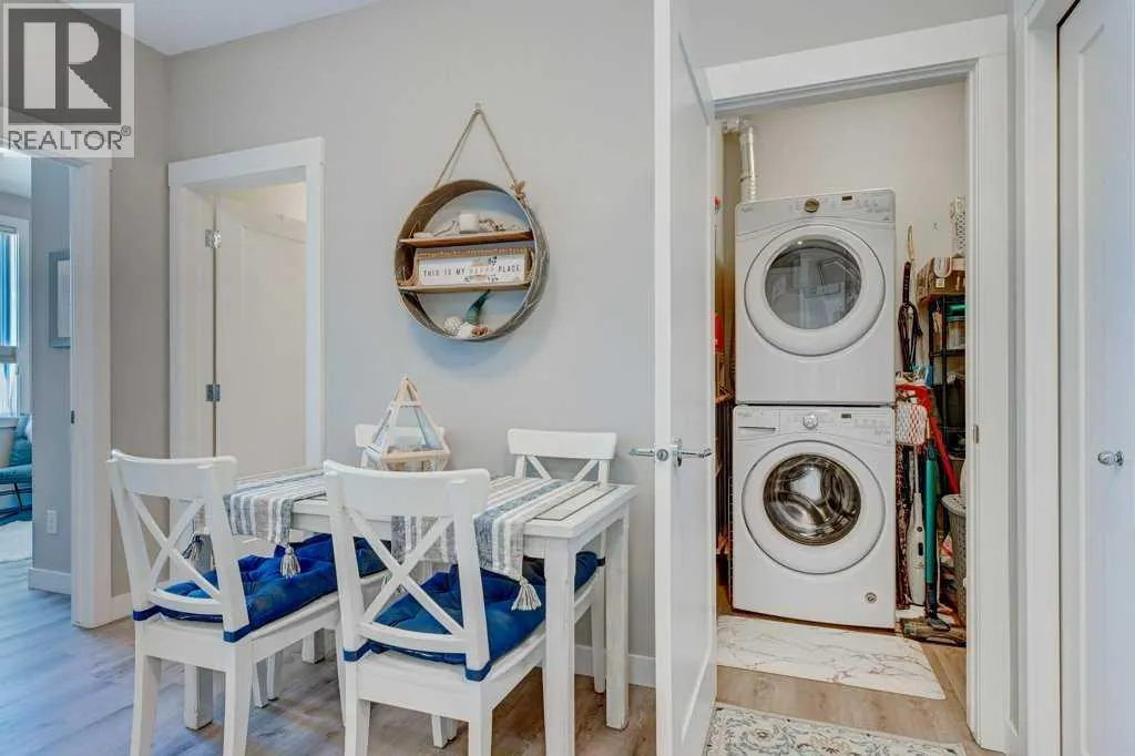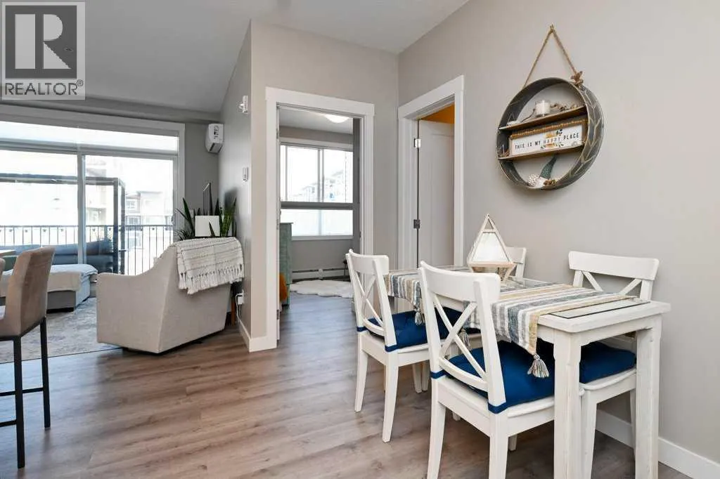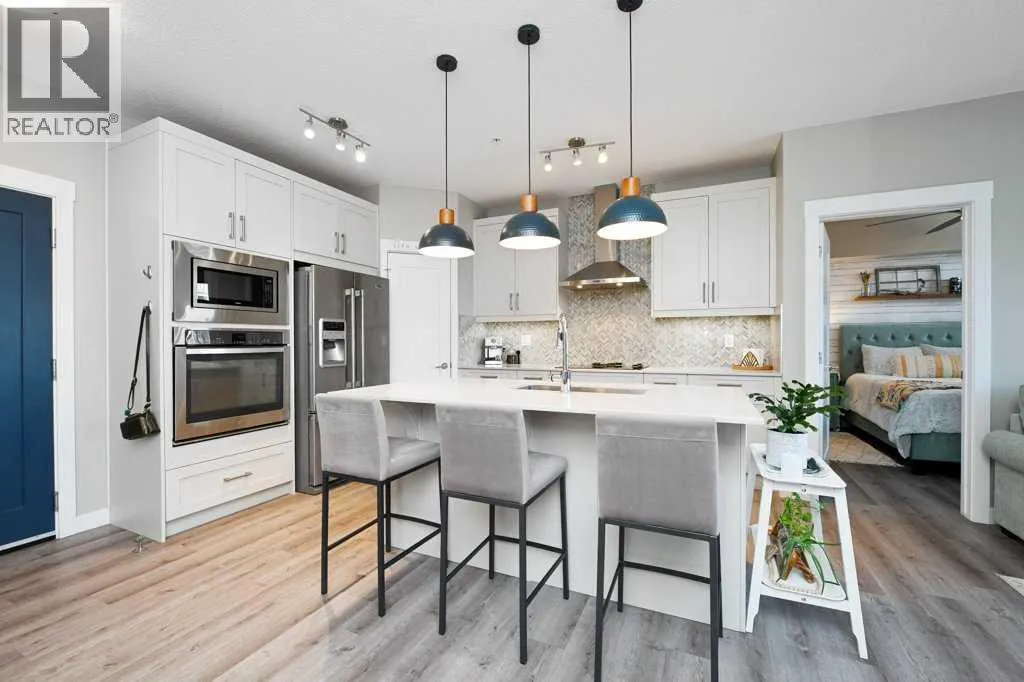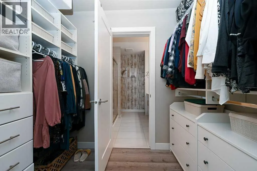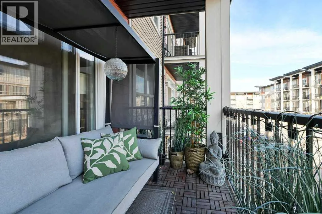 A well-appointed, warm and stylish 2-bedroom, 2-bathroom condo on the 2nd floor of the secure, well-managed Walgrove Place in Walden. Built by Cardel Lifestyles in 2018, this bright, quiet, air-conditioned unit offers comfortable, modern living. The open floor plan is set up with the bedrooms on opposite sides of the main living area, providing excellent privacy and functionality. The unit has been well maintained, with thoughtful design throughout. Upgraded features include air conditioning, luxury vinyl plank flooring throughout, a deluxe wall kitchen appliance package with chimney hood and raised upper cabinetry. The primary suite offers a walk-in closet with barn door and custom built-in white wood shelving and drawers. The 4-piece ensuite includes dual undermount sinks, a fully tiled shower with sliding glass doors, and ceramic tile flooring. Both bedrooms are equipped with custom cordless up/down blackout blinds. The spacious balcony includes a gas line for BBQ. There is plenty of natural light throughout. The heated underground titled parking stall includes a generous storage cage and is conveniently located near the exit door. Showhome condition and offers more than typical upgrades. Immediate possession possible. Shopping, restaurants, and walking paths are just across the street, with easy access to South Health Campus, Transit, Stoney Trail, and Deerfoot Trail. (id:27476)