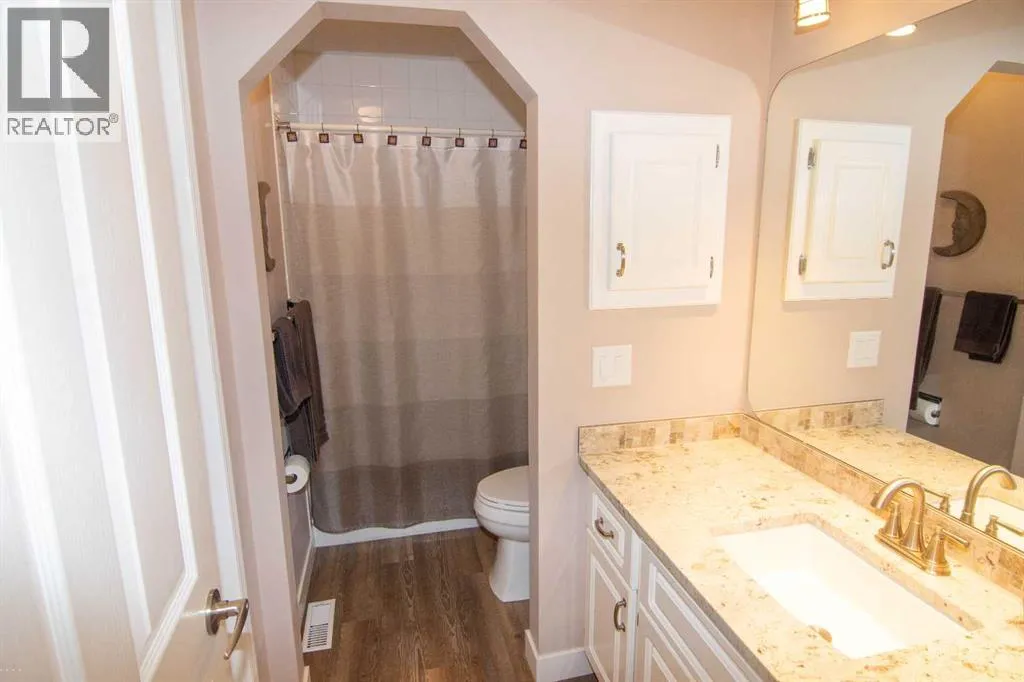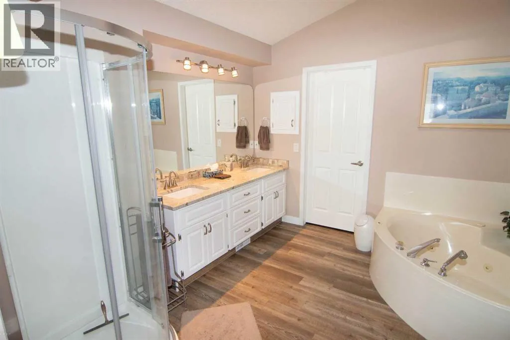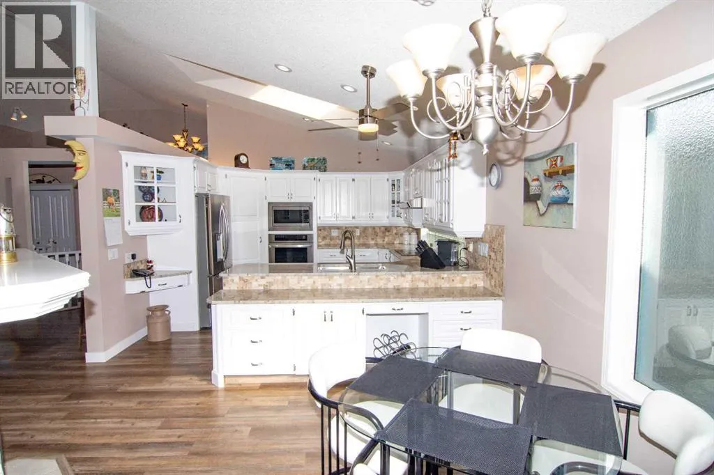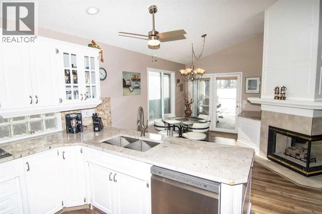 Welcome to this custom built, fully developed, walkout, bungalow that backs onto Valley Ridge Golf Course. This beautiful home features, large open front entry, large dining room, spacious living room with beautiful south facing views of the golf course, 3 sided fireplace. Fully renovated white kitchen with built in ovens, stainless appliances, corner pantry, lots of cabinets and great counter space. Kitchen eating area has access to wrap around deck. The main floor also boasts den/bedroom, laundry with access to heated 2 car garage, huge master bedroom with 6 pc. ensuite and walk in closet. The lower walk out level offers huge family room with large windows, fireplace, 2 additional bedrooms, 2 pc. bathroom and storage area, all with inslab heating. The yard is beautifully landscaped. Close to all pathways and playgrounds with quick access to the mountains and Banff. This home is a must view. 43 Valley Ridge Green NW. (id:27476)