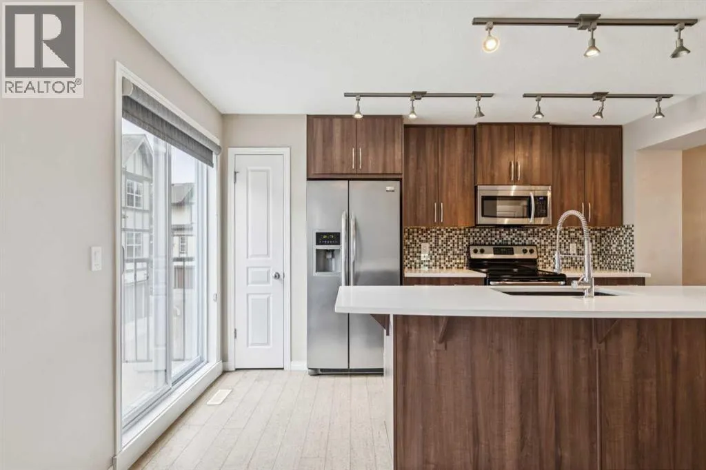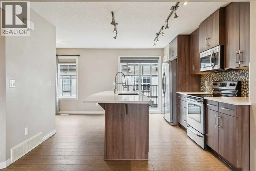 Welcome to Cranston! This three-bedroom townhouse with a double attached garage is the one you have been waiting for. As you enter this open concept floor plan, cork flooring will lead you through a good-sized living room, dining area, and into a beautiful kitchen that features a large island, quartz countertops, stainless steel appliances, plenty of cupboard and counter space, and a pantry area. Just off the kitchen is a breakfast nook, the main floor is finished off with a powder room. Upstairs, you have three bedrooms, the primary features a walk-in closet and a full ensuite. Down the hall are two additional good-sized bedrooms and another full washroom. The basement offers plenty of storage, access to the double garage, laundry and mech space. All of this is a great location, close to the community centre, shopping, restaurants, pubs, schools, and much more. Check out the 3D tour for a better look and call your favourite realtor to book a private viewing. A move youâll be glad you made! (id:27476)
