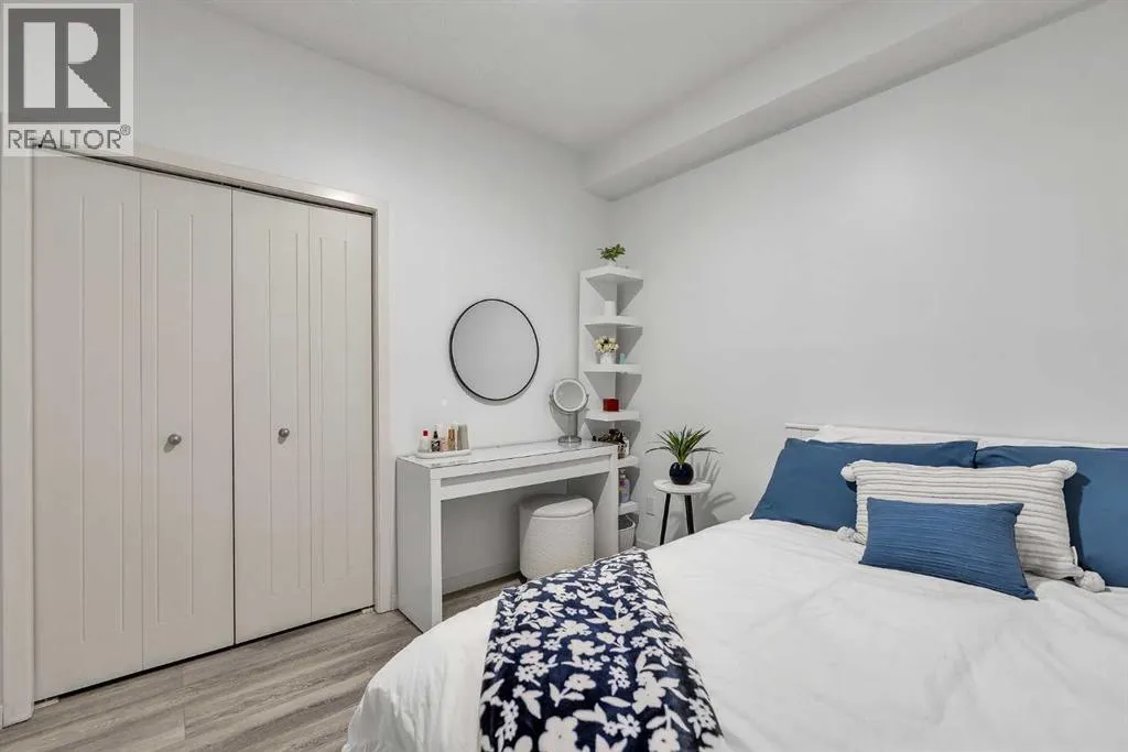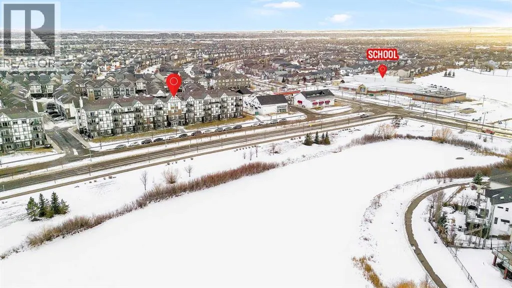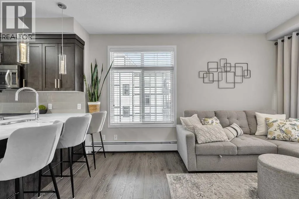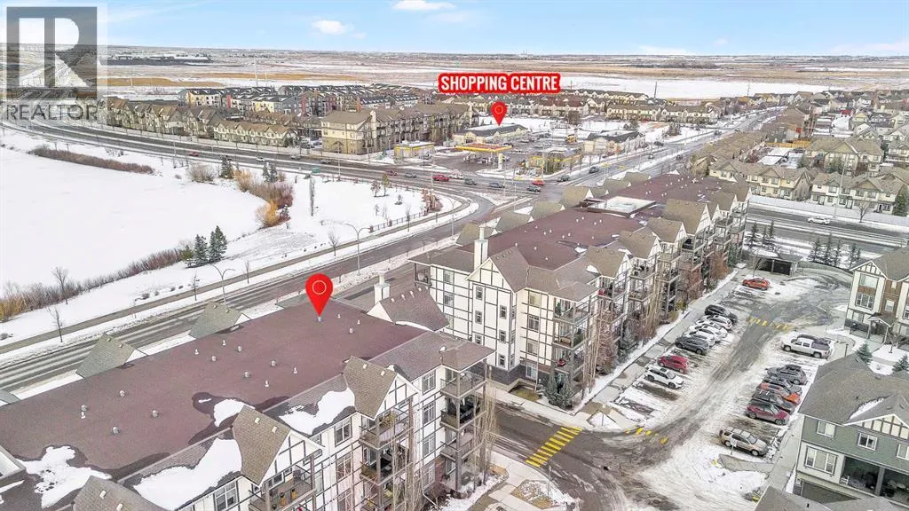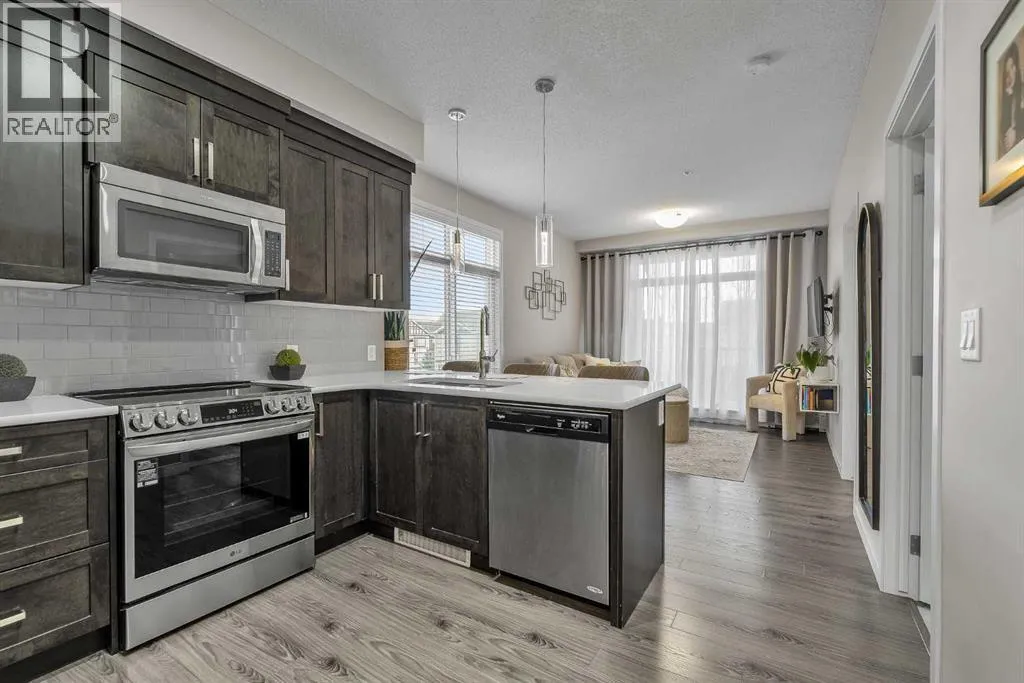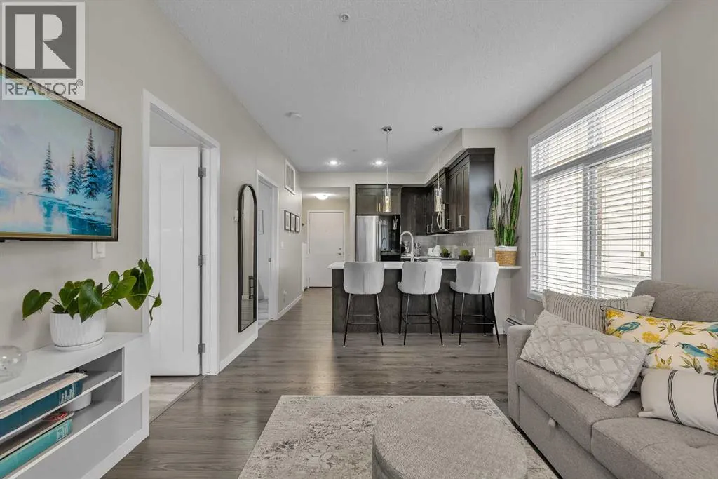 Welcome to this BRIGHT CORNER UNIT in the heart of New Brighton, offering fantastic value in a well established community. This inviting TWO BEDROOM CONDO features over 600 SQ FT OF LIVING SPACE, with 9FT CEILINGS and large windows that fill the home with natural light. The kitchen is beautifully finished with QUARTZ COUNTERTOPS, DARK CABINETRY, and NEWER STAINLESS STEEL APPLIANCES, including a HIGH END FRIDGE, NEWER STOVE, and a space saving over the range microwave. A peninsula provides extra prep space and a convenient eating bar, making it perfect for both everyday living and entertaining. The living area opens onto a SUNNY COVERED BALCONY WITH BBQ GAS LINE, ideal for relaxing or hosting in warmer months while enjoying a quiet outlook over the complex. Both bedrooms are SIMILAR IN SIZE, each with LAMINATE FLOORING and SPACIOUS CLOSETS, and are thoughtfully positioned for privacy. The FOUR PIECE BATHROOM continues the quartz finishes and includes a DEEP TUB AND SHOWER COMBO. Additional features include IN SUITE LAUNDRY, NO CARPET, LAMINATE AND TILE FLOORS THROUGHOUT, ASSIGNED SURFACE PARKING STALL 58, STORAGE LOCKER 9 LOCATED IN THE PARKADE, and access to a BICYCLE STORAGE ROOM. This WELL MANAGED COMPLEX WITH LOW CONDO FEES is ideally located close to PARKS, SCHOOLS, SHOPPING AT 130 AVE AND HIGH STREET, TRANSIT, and with quick access to DEERFOOT AND STONEY TRAIL. A perfect opportunity for FIRST TIME BUYERS, INVESTORS, or anyone looking for a bright, low maintenance home in a great community. Residents also enjoy exclusive access to the NEW BRIGHTON RESIDENTS ASSOCIATION, offering YEAR ROUND AMENITIES such as a SPLASH PARK, TENNIS COURTS, VOLLEYBALL, a HOCKEY RINK, FITNESS CLASSES, and a wide range of COMMUNITY EVENTS. This home SHOWS BEAUTIFULLY and is PET FRIENDLY WITH BOARD APPROVAL. BOOK YOUR PRIVATE SHOWING TODAY. (id:27476)