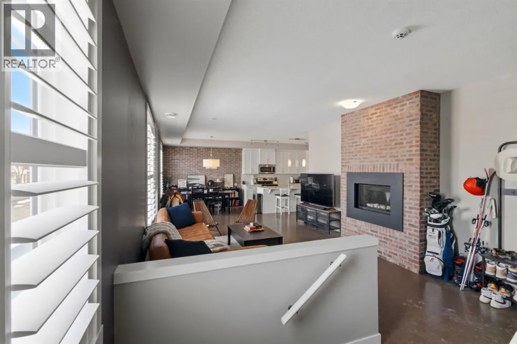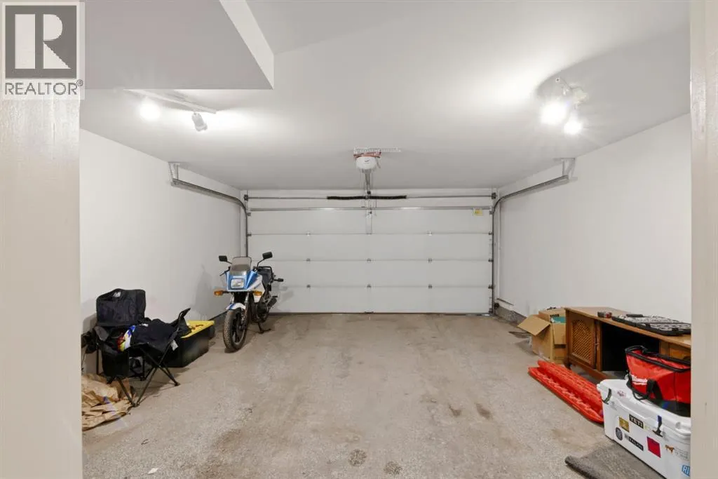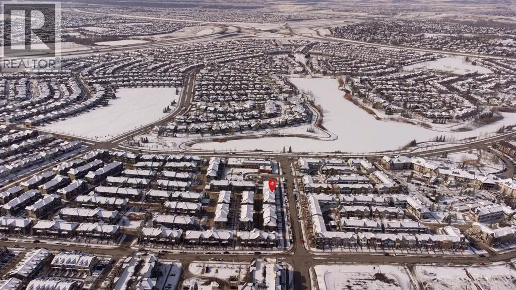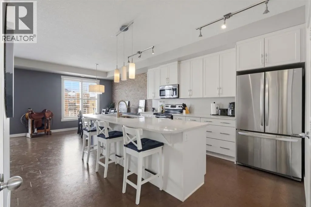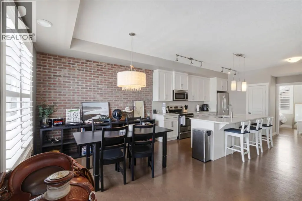 Refined Townhome Living in an Unbeatable Location, Offering the perfect balance of low maintenance convenience, modern design, and an exceptional southeast Calgary location, this beautifully appointed townhome delivers outstanding value without compromise.The thoughtfully designed kitchen serves as the true heart of the home, featuring crisp white cabinetry, stainless steel appliances, full height tile backsplash, quartz countertops, and a generous centre island, ideal for both everyday living and effortless entertaining. Cork flooring flows throughout the main level, seamlessly connecting the kitchen and dining area to the inviting great room, anchored by a classic brick surround gas fireplace. A 25 foot west facing deck extends the living space outdoors, offering sun drenched afternoons and warm summer evenings. Central air conditioning ensures year round comfort. Upstairs, the private primary retreat offers a walk-in closet and a well appointed four piece ensuite with quartz countertops, white stained wood cabinetry, and a clean one piece tub/shower surround. Two additional bedrooms provide flexibility for family, guests, or a dedicated home office, complemented by a second four piece bathroom and a conveniently located laundry room complete with built in storage and a laundry sink.The entry level basement has been finished with laminate flooring and track lighting, making it an ideal home office or versatile flex space, with additional built in storage throughout. Car enthusiasts will appreciate the double attached garage featuring epoxy flooring. The well managed condo corporation maintains notably low fees.Perfectly situated steps from the 2.5 km Inverness Pond pathway loop, with quick access to shopping, schools, Deerfoot Trail, and Stoney Trail, this is an address that truly has it all. (id:27476)