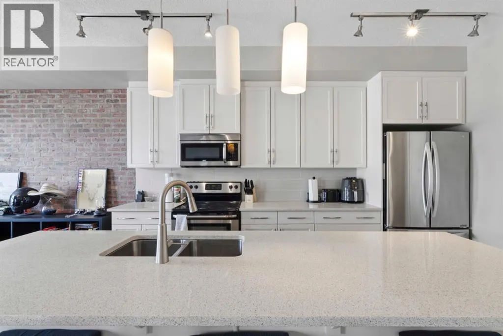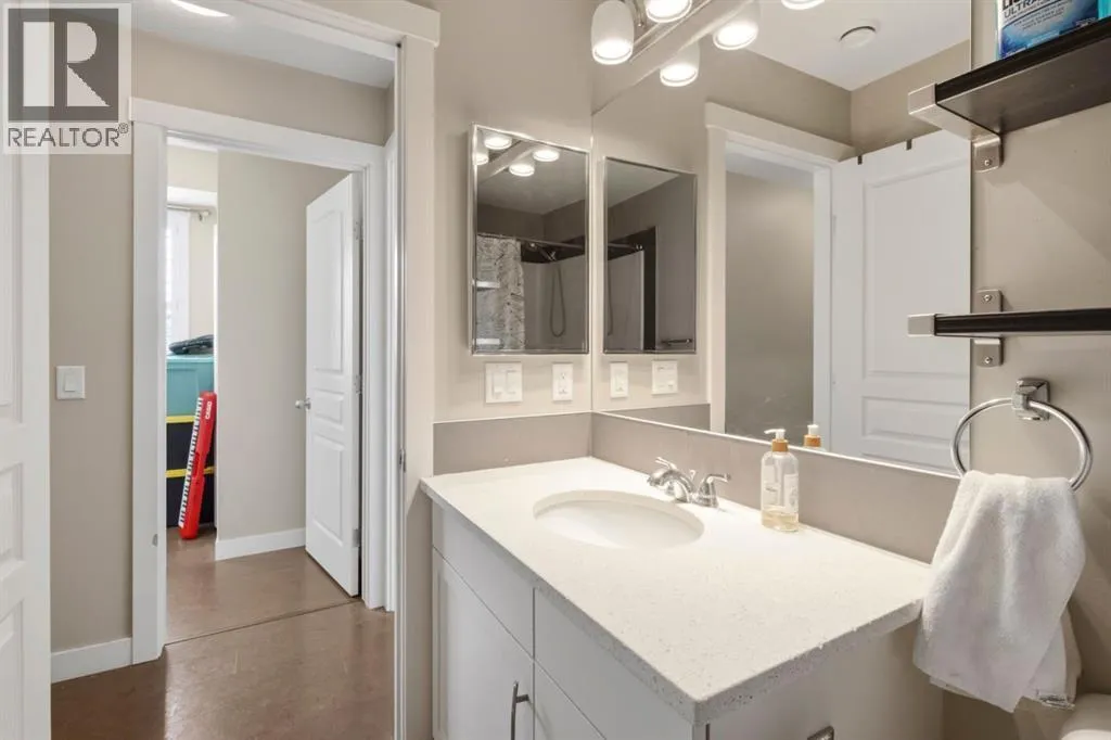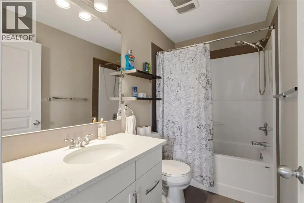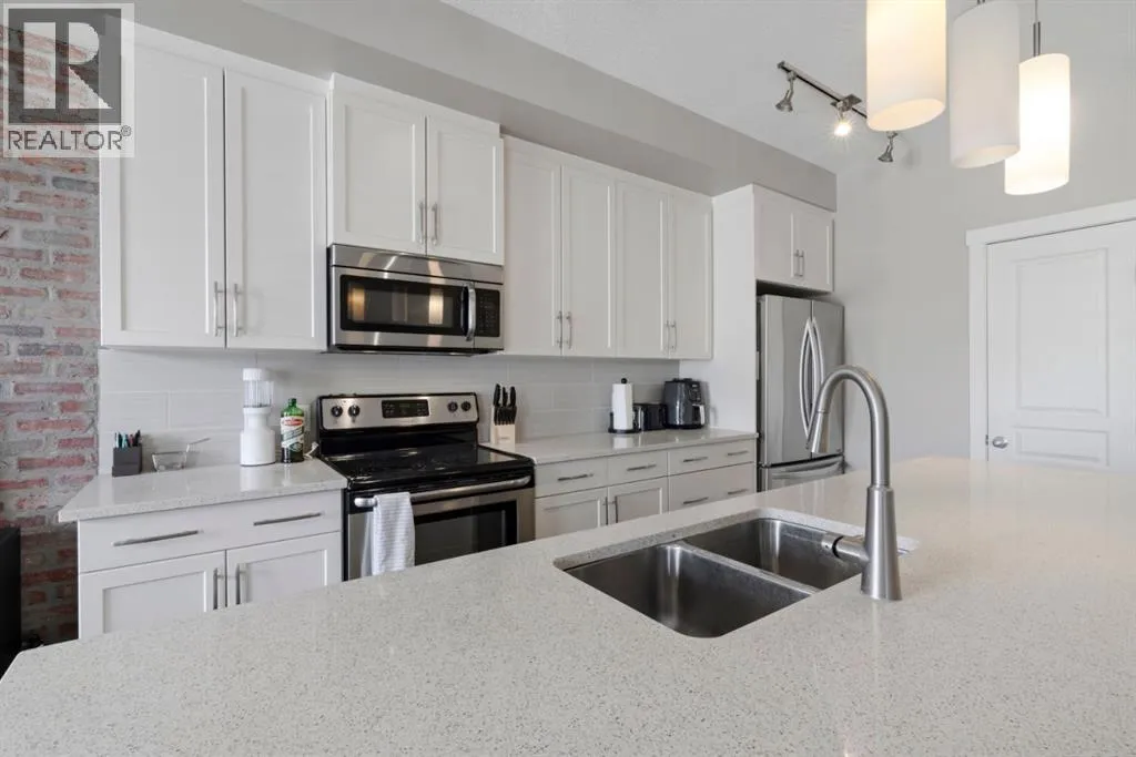 Refined Townhome Living in an Unbeatable Location, Offering the perfect balance of low maintenance convenience, modern design, and an exceptional southeast Calgary location, this beautifully appointed townhome delivers outstanding value without compromise.The thoughtfully designed kitchen serves as the true heart of the home, featuring crisp white cabinetry, stainless steel appliances, full height tile backsplash, quartz countertops, and a generous centre island, ideal for both everyday living and effortless entertaining. Cork flooring flows throughout the main level, seamlessly connecting the kitchen and dining area to the inviting great room, anchored by a classic brick surround gas fireplace. A 25 foot west facing deck extends the living space outdoors, offering sun drenched afternoons and warm summer evenings. Central air conditioning ensures year round comfort. Upstairs, the private primary retreat offers a walk-in closet and a well appointed four piece ensuite with quartz countertops, white stained wood cabinetry, and a clean one piece tub/shower surround. Two additional bedrooms provide flexibility for family, guests, or a dedicated home office, complemented by a second four piece bathroom and a conveniently located laundry room complete with built in storage and a laundry sink.The entry level basement has been finished with laminate flooring and track lighting, making it an ideal home office or versatile flex space, with additional built in storage throughout. Car enthusiasts will appreciate the double attached garage featuring epoxy flooring. The well managed condo corporation maintains notably low fees.Perfectly situated steps from the 2.5 km Inverness Pond pathway loop, with quick access to shopping, schools, Deerfoot Trail, and Stoney Trail, this is an address that truly has it all. (id:27476)