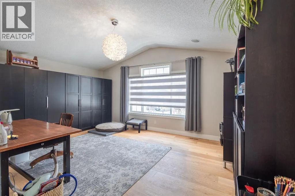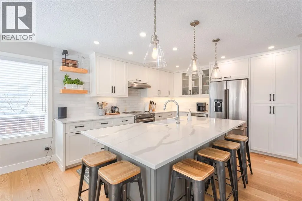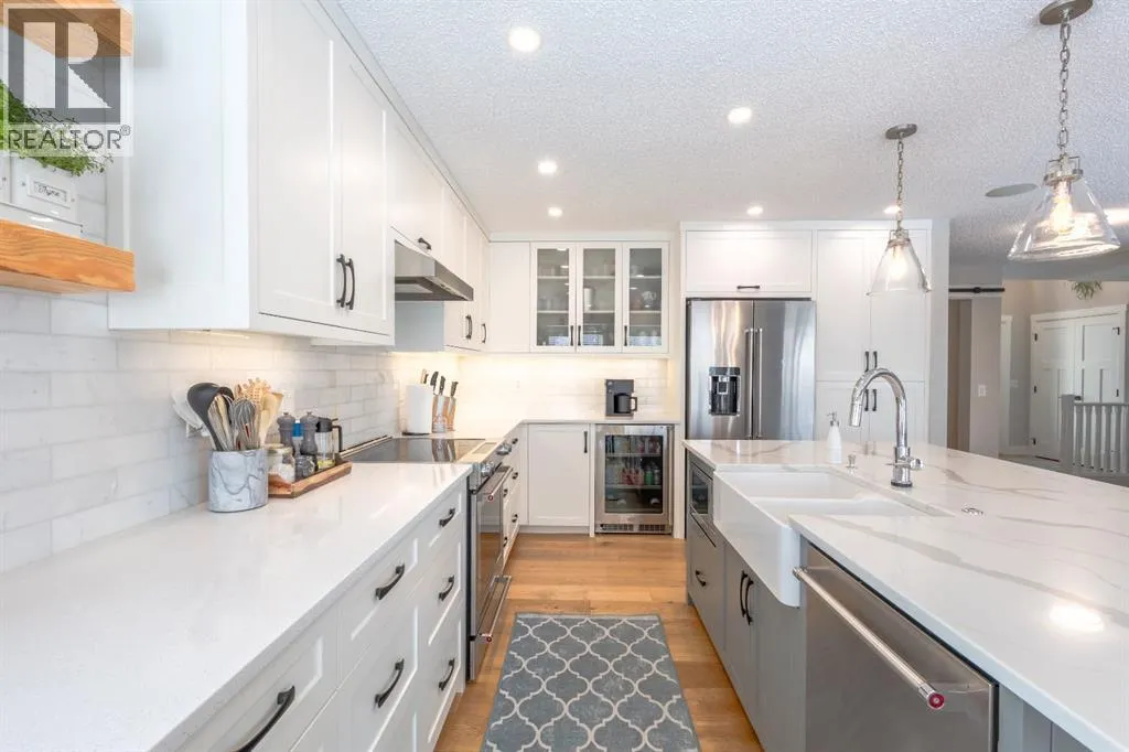 Welcome to this beautifully renovated 4 bed, 3.5 home that perfectly blends comfort, style, and functionality in the heart of West Springs. Situated directly across from a park and green space, youâll enjoy peaceful views and easy access to outdoor recreation, all while being just minutes from incredible amenities. Step inside to a spacious front entrance featuring a generously sized officeâideal for working from home or creating a quiet study space. Thoughtfully laid out, this home includes a convenient laundry area with custom built-ins, direct access to the double car garage, and a high efficiency furnace that was upgraded last year, making everyday living seamless and comfortable. The heart of the home is the stunning kitchen, complete with quartz countertops, a large island with breakfast bar seating, ceiling-height cabinetry, and sleek stainless steel appliances, including a bar fridge for added convenience. The adjacent eating nook is bright and inviting, offering direct access to the west-facing backyard and deckâperfect for indoor-outdoor living and entertaining. The living room is equally impressive, featuring a cozy fireplace with a stone surround and wooden mantle, complemented by a large window that fills the space with natural light. A 2pc powder room completes this main floor. Upstairs, youâll find a spacious bonus room with vaulted ceilings and built-in features, creating the perfect retreat for relaxing or gathering with family. The primary bedroom is a true sanctuary, boasting vaulted ceilings, a large window overlooking the backyard, walk-in closet and a 5-piece ensuite complete with a soaking tub, stand-alone shower, dual vanity and in-floor heating. Two additional well-sized bedrooms share a modern 4-piece bathroom, making this level ideal for families. The fully developed basement expands your living space even further, offering heated tile floors, a large family and recreation area, a wet bar with granite countertops, a 3-piece bathroom with a stand-alone shower, and an additional generously sized bedroomâperfect for guests or extended family. Outside, the west-facing backyard is designed for enjoyment and privacy, featuring a spacious deck with a privacy wall, a fully fenced yard, and garden boxes for those with a green thumb. This home offers the perfect combination of thoughtful design, beautiful finishes, and an unbeatable locationâan exceptional opportunity you wonât want to miss. (id:27476)