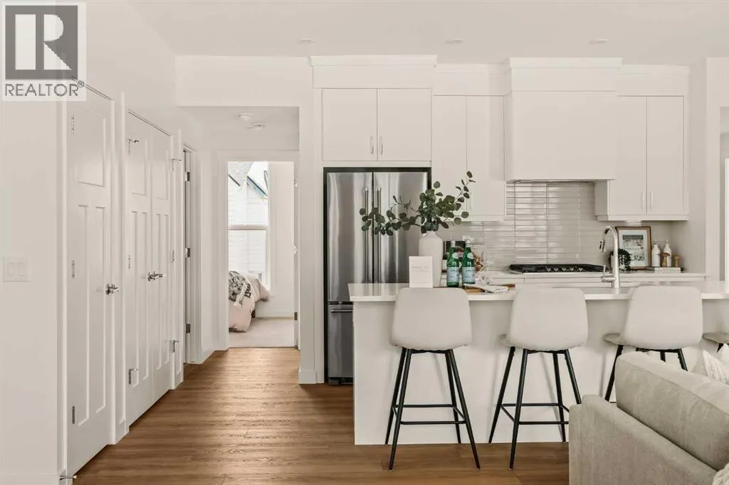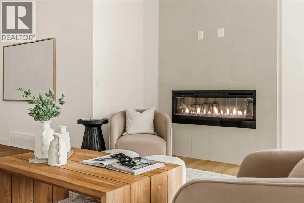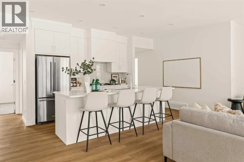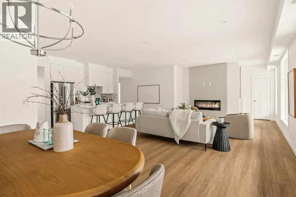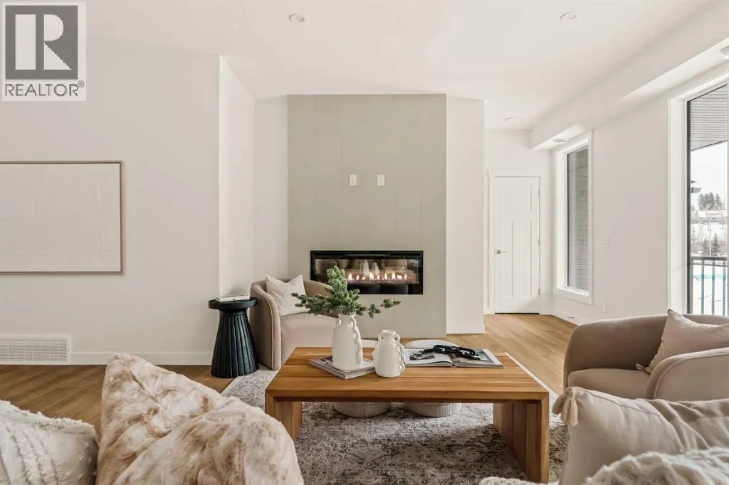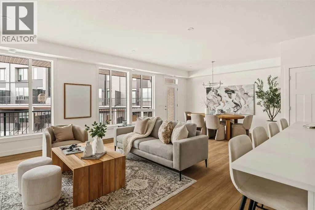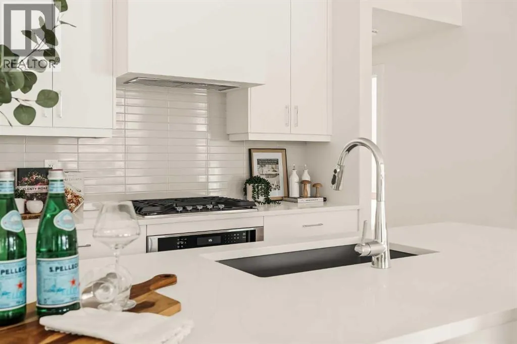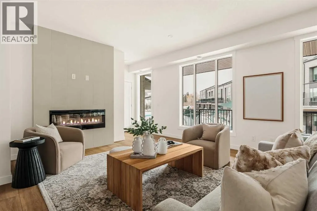 Offering bungalow-style living at its finest - the brand new Hyde at Crown Park presents a rare and refined take on single-level living. This is an exceptional opportunity to own one of the final brand-new bungalow-style townhomes in this highly sought-after inner-city community. Offering nearly 1,600 sq. ft. on a single level, this thoughtfully designed home features 3 bedrooms, 2 bathrooms, an oversized private double attached garage, and exceptional storage throughout - perfectly tailored for those looking to downsize without sacrificing the space, comfort, and functionality of a larger home. Set in the heart of Crown Park, this residence is ideally positioned with a sun-filled southwest-facing balcony overlooking the central park, just minutes from downtown Calgary. Itâs the perfect balance of lock-and-leave convenience and vibrant inner-city living. The main living space is designed for both everyday ease and effortless entertaining. A timeless white kitchen anchors the home, seamlessly connecting to the dining and living areas, while an expansive wall of southwest-facing windows floods the space with natural light. Elevated finishes include quartz countertops and a premium built-in appliance package featuring an integrated hood fan, a gas cooktop, and a built-in oven. The spacious living room centers around a striking floor-to-ceiling tiled fireplace and offers ample room for gathering, while the generous dining area comfortably accommodates a full-size table for hosting family and friends. Resilient, warm-toned vinyl plank flooring flows throughout the main living area, making it ideal for children and pets. Thoughtfully designed for privacy, the primary retreat is tucked away from the secondary bedrooms, separated by the laundry area. This serene space features a large walk-in closet and a spa-inspired ensuite with dual vanities and a walk-in shower with 10mm glass. Two additional bedrooms provide flexibility for guests, a home office, or media room, support ed by a well-appointed full bathroom. A dedicated laundry room with added cabinetry and folding space enhances everyday functionality. Outdoor living is equally impressive with an ~26â x 8â covered southwest-facing balcony, complete with a gas line, hose bib, and A/C rough-in - designed to maximize sunlight and usability throughout the seasons. The lower level offers access to the oversized double attached garage along with two substantial storage areas - a rare and valuable feature in bungalow-style living. Located within one of Calgaryâs most exciting new inner-city communities, this home offers a true low-maintenance, single-level lifestyle backed by full builder warranty and Alberta New Home Warranty. Opportunities like this are exceptionally rare - single-level townhomes with private double garages, in a location like this, simply donât come available often. (id:27476)