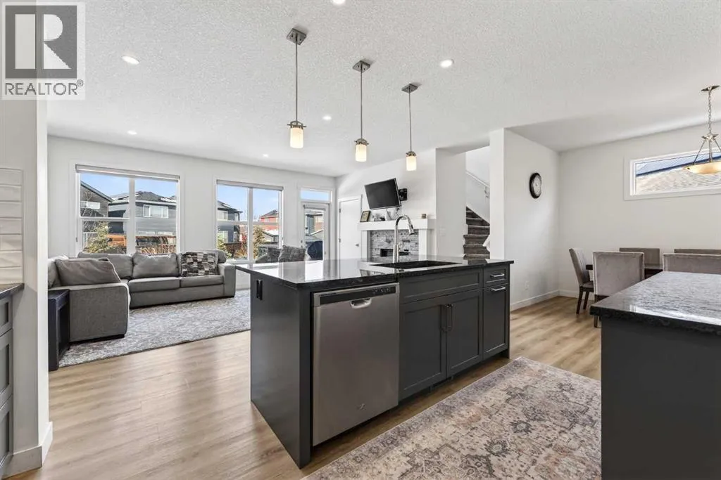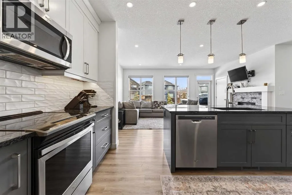 Welcome to Seton and to a home that truly stands out! This 2-storey home with a finished basement is situated on a rare pie lot with a massive, immaculate, stunning, high-end professionally landscaped backyardâoffering the kind of outdoor space that is getting harder and harder to find. From the underground sprinklers to the custom hardscaping and expansive lawn, this yard was designed to be enjoyed.Inside, the home offers a bright, modern layout with high ceilings, LVP flooring on the main floor, pot lights throughout with dimmers, and a warm gas fireplace anchoring the living room. The kitchen is built for everyday living and entertaining alike, featuring an abundance of drawers, excellent storage, and a spacious layout that opens seamlessly to the dining and living areas. A practical mudroom and oversized washer and dryer add even more everyday convenience.Upstairs, youâll find 4 bedrooms plus a central family room, making this an ideal layout for growing families. The primary suite is generously sized and includes a beautiful 5-piece ensuite, while one of the additional bedrooms also enjoys its own private 4-piece ensuite, a rare and highly functional feature. An additional full bathroom completes the upper level. In total, the home offers 3.5 bathrooms above grade.The legal basement suite adds incredible value and flexibility, complete with 2 bedrooms, a full bathroom, kitchen, rec room, pantry, and separate living space, perfect for multi-generational living, guests, or rental income potential.Other standout features include a 200-amp electrical panel, an oversized double attached garage, and a location in one of Calgaryâs most sought-after southeast communities, close to the South Health Campus, shopping, restaurants, schools, parks, and all the amenities Seton is known for.Immaculate, high-end outdoor living meets a rare pie lot and income potentialâthis is the one buyers wait for. (id:27476)