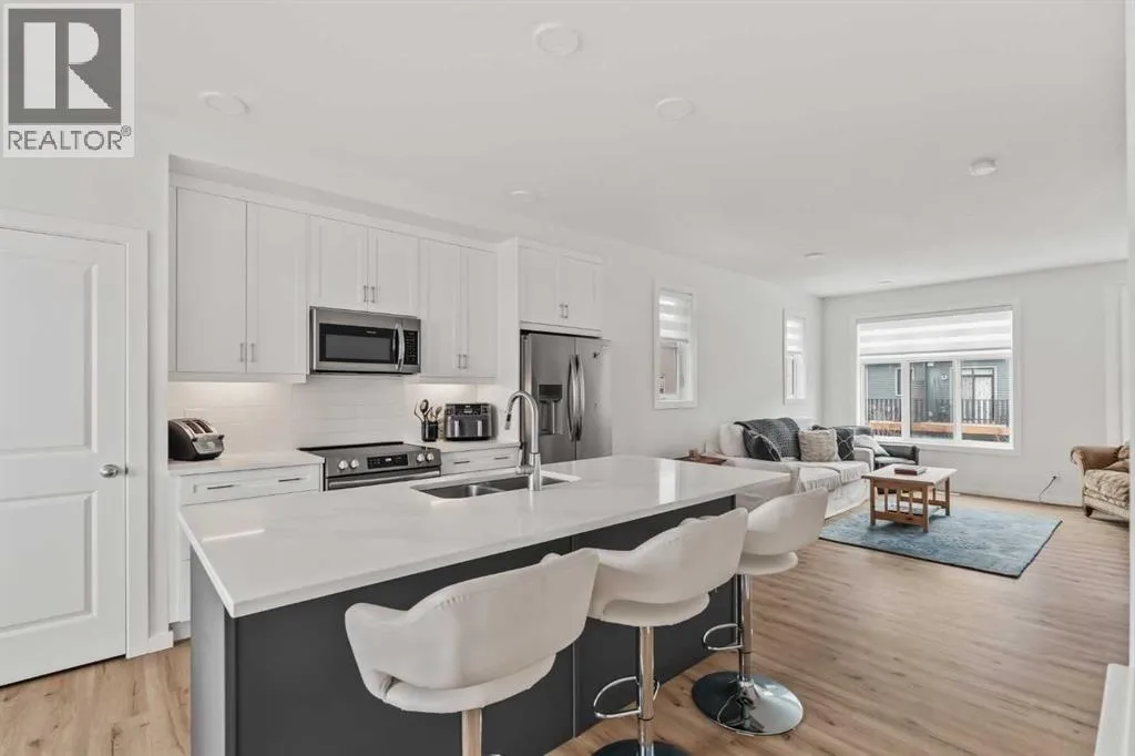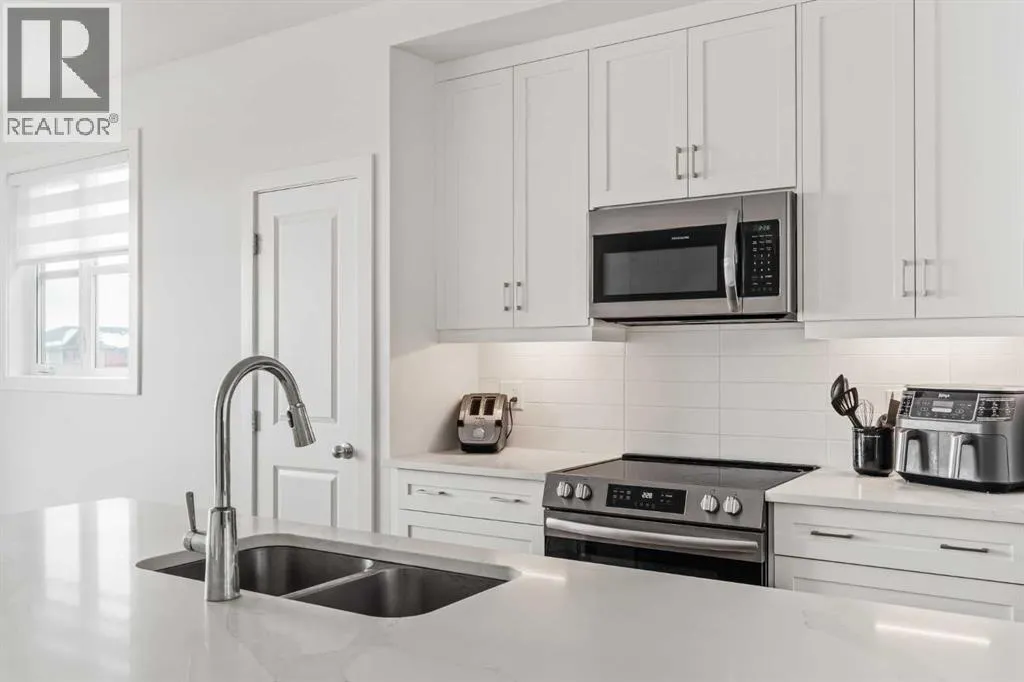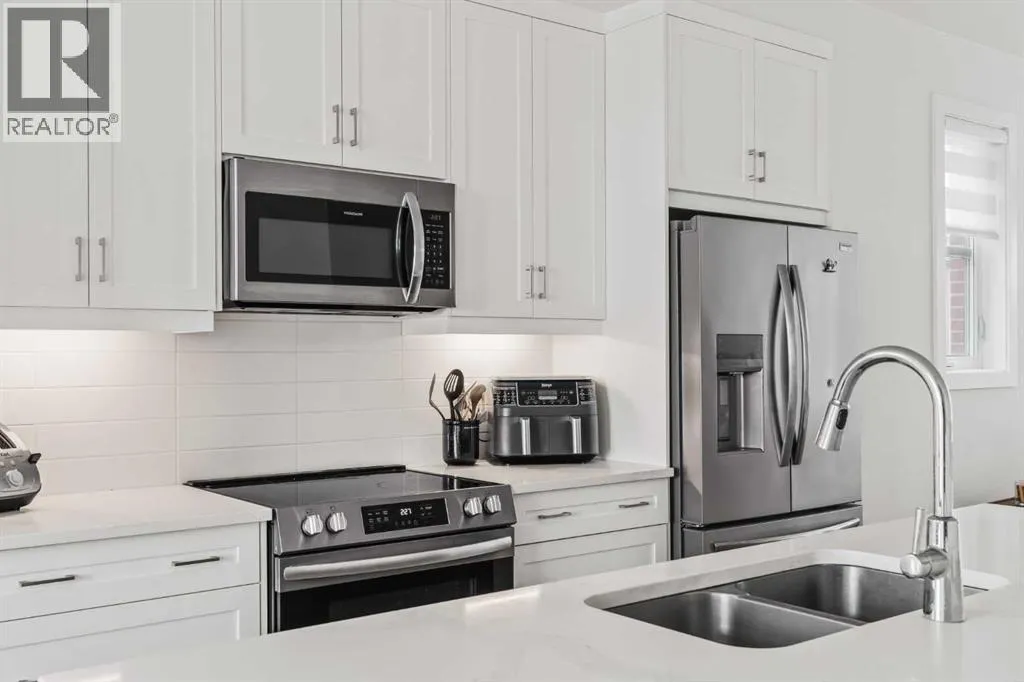 Welcome to this stunning end-unit, 3 Bed, 2.5 Bath townhome in Springbank Hill, where 1,460 sqft. of modern design meets everyday convenience. Imagine starting your morning with coffee on your sun-drenched south-facing balcony, overlooking a peaceful green space and stormwater pond. The open-concept main floor is perfect for hosting, with a spacious living and dining area separated by a sleek, center island with upgraded quartz countertops. The kitchen boasts upgraded stainless steel appliances (built-in microwave hood fan, French door fridge with water & ice dispenser) under-cabinet lighting, and stylish chrome finishes found throughout the home. Upstairs, the primary suite is complete with a walk-in closet and an upgraded 3-piece ensuite with oversized shower and grey stone countertop. Two additional bedrooms provide flexibilityâuse one as a cozy guest room and the other as a home office or nursery. A 4-piece bathroom and laundry complete this level. The double tandem garage offers space for two vehicles or a home gym/workshop, equipped with wiring for 220V/30A outlet for EV charging or power tools. Plus, an additional driveway parking spot means thereâs room for a third vehicle. Built in 2023 and well maintained, this home also features LVP flooring, A/C rough-in, and quick access to walking trails, nature, and top amenities such as Aspen Landing, Westhills Shopping Centre, Westside Recreation Centre, and the 69th Street LRT Station. Plus, itâs close to Calgaryâs top schools, including Griffith Woods School, Guardian Angel School, Ernest Manning High School, Rundle College, and Webber Academy. Picture yourself living hereâcontact me or your preferred REALTOR® to book your private showing today! (id:27476)