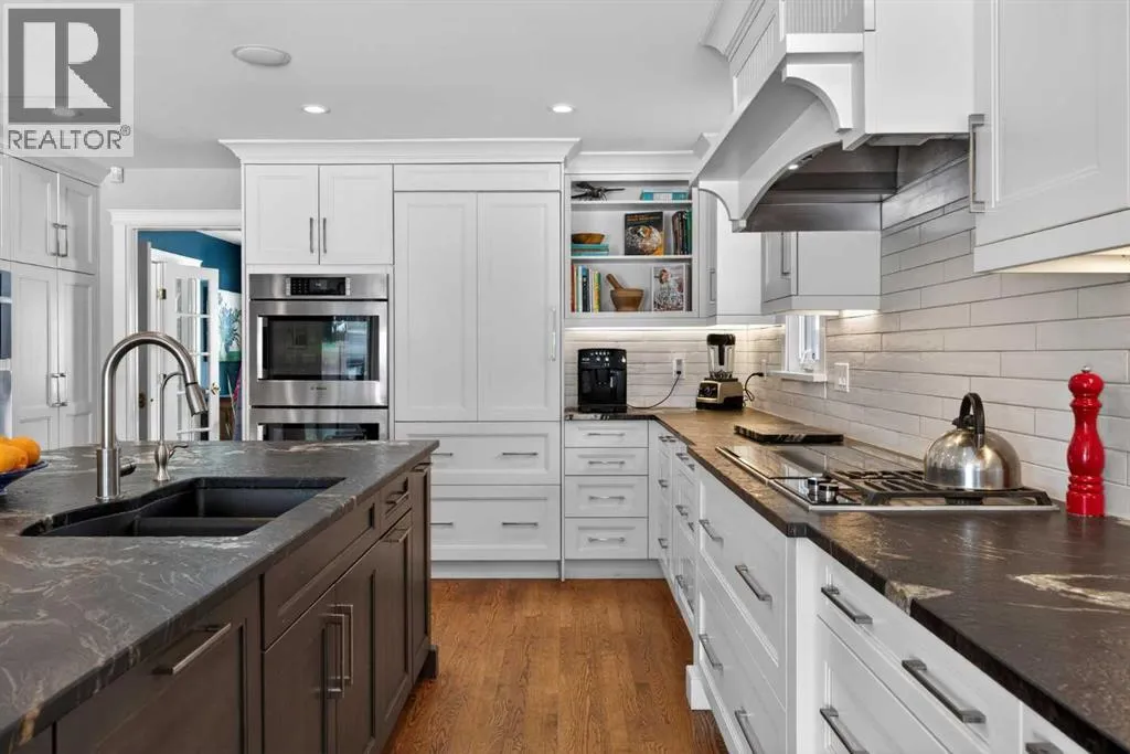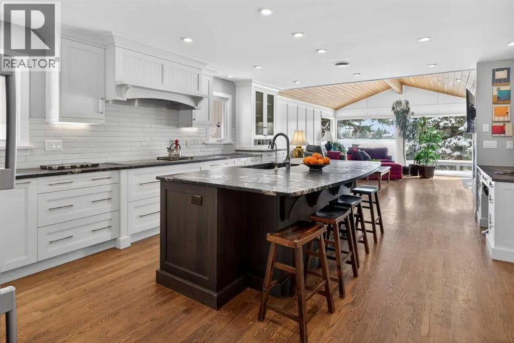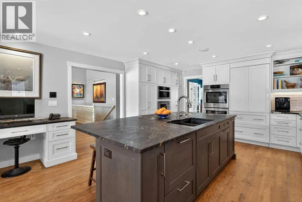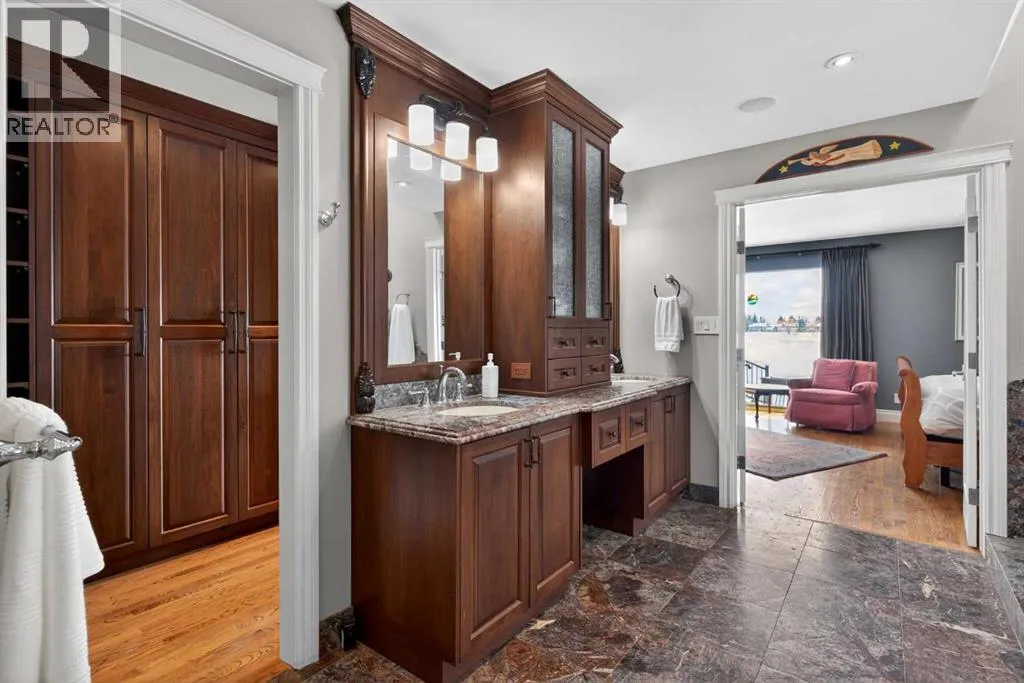 Welcome home! Step inside to a spacious entryway where youâre immediately greeted by heated Nova Scotia marble, soaring vaulted pine ceilings, and site-finished oak hardwood floors that lead you into the inviting and amazing living room with large picturesque windows that showcase beautiful views of the backyard and lake.The fully renovated kitchen is truly stunning and designed to impress. At its heart is a large central island, all counters are leather-finished granite countertops. Youâll find an abundance of gleaming white cabinetry with under-cabinet lighting and soft-close doors, along with high-end stainless steel appliances including three ovensâone being a steam ovenâan induction cooktop with a side gas hob, a hidden dishwasher and a Sub-Zero fridge. A built-in computer nook adds convenience, and the hardwood flooring continues seamlessly throughout the home.Adjacent to the kitchen, the formal dining room overlooks the front yard and includes a built-in buffet, while the sun room offers a cozy gas fireplace and easy access to the outdoorsâperfect for enjoying lake access or summer BBQs.The primary bedroom is an absolute retreat, offering ample space for a king-sized suite, private access to the lake, and another gas fireplace. The custom walk-in closet provides exceptional storage, and the luxurious seven-piece ensuite continues the heated marble flooring and features a jetted tub, dual sinks, steam shower, as well as a bidet and urinal.The main floor also includes two additional generously sized bedrooms and a unique study complete with a minibar and a hidden bookshelf door. A four-piece bathroom with a classic clawfoot tub completes this level.Downstairs, the finished lower level offers a spacious T-shaped recreation room with a wood-burning fireplace, a wine room with a Sub-Zero wine fridge, a fourth bedroom, a cold room, a three-piece bathroom, a workshop area, and plenty of storage.The standout feature of this home is the south-facing backya rd. Designed for both relaxation and recreation, it includes a large deck, hot tub, greenhouse, and plenty of green space for kids or pets. Your private dock lets you fully enjoy lake living year-roundâwhether itâs swimming, skating, fishing, or boating.Additional highlights include a triple attached garage, updated windows, solar panels to help reduce energy costs, durable concrete shingles, a built-in Nuvo speaker system throughout, air conditioning, an irrigation system, all in a location that is quiet, but has easy access to schools, and shopping, and much more.Donât miss your chanceâcall today and move in just in time to enjoy the lake all summer long! (id:27476)