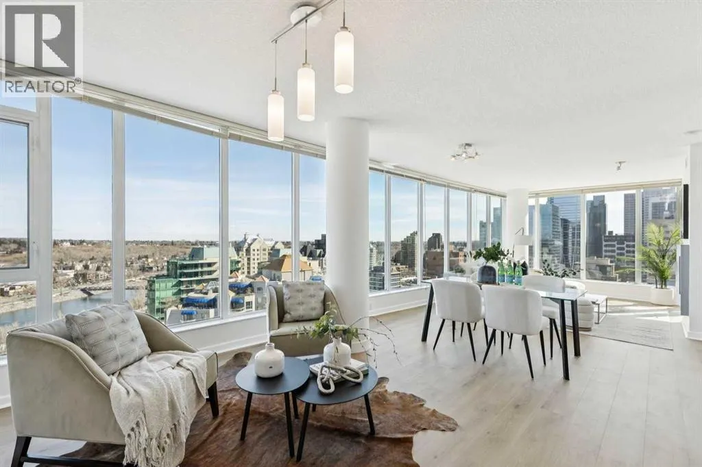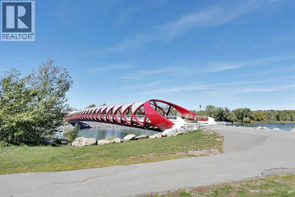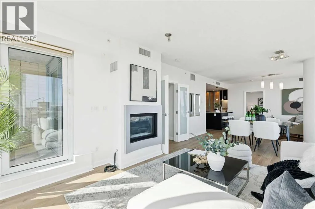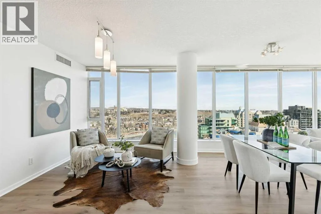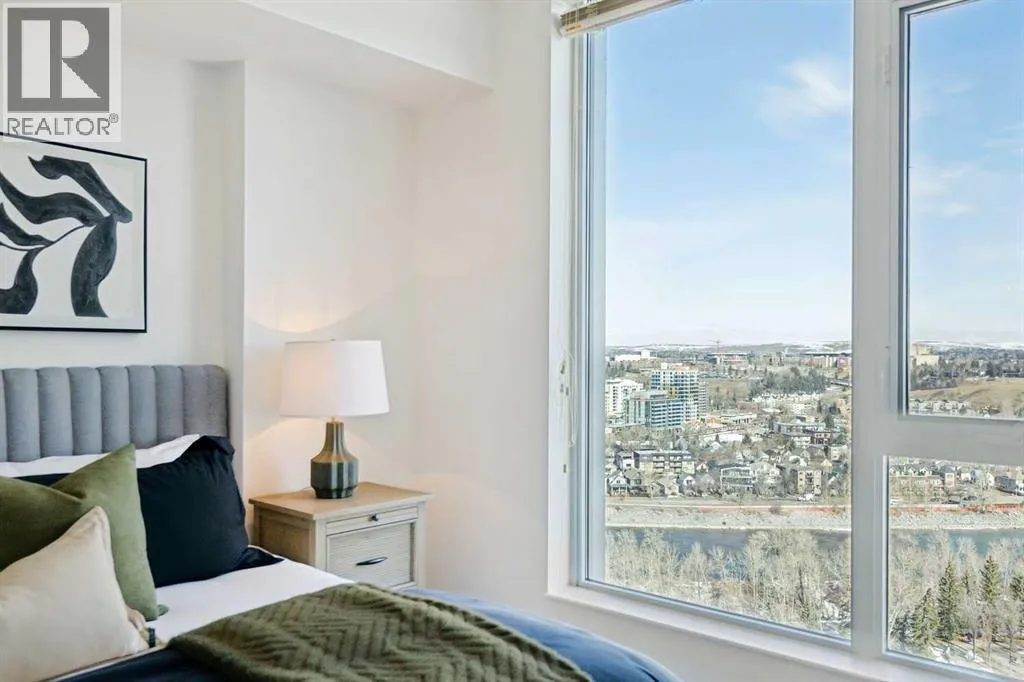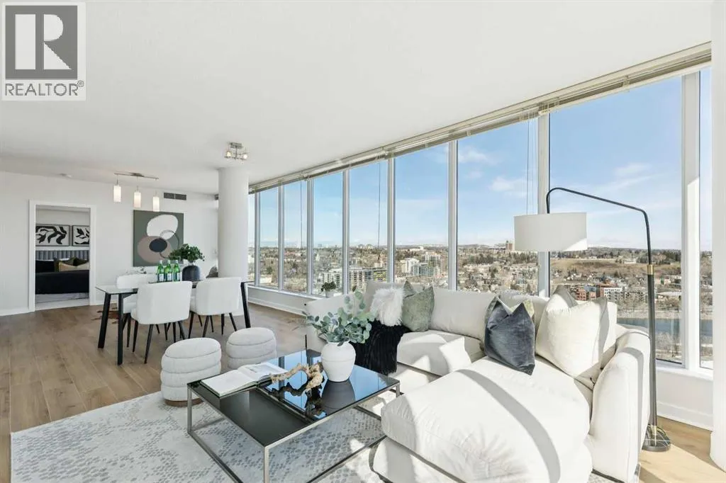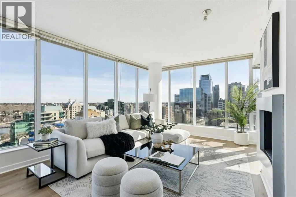 EXECUTIVE CORNER UNIT WITH PANORAMIC BOW RIVER VIEWS! Welcome to this stunning corner unit boasting UNOBSTRUCTED, breathtaking 180 degree views of the Bow River, Nosehill Park, and the majestic mountains through expansive floor-to-ceiling windows. This North & East facing unit offering over 1,000 sq. ft. of elegant living space, this sophisticated condo is sure to impress from the moment you step inside. The chefâs kitchen is thoughtfully designed with Granite countertops, warm wood cabinetry, stainless steel appliances & stylish tile backsplash. The spacious main living area features a cozy natural gas fireplace, a generous dining space, and a versatile flex area perfect for a home office or reading nook. The master bedroom offers brand new carpet and ample space to comfortably accommodate a king-sized bed plus additional furniture. The luxurious 5-piece ensuite bathroom includes a soaker tub, tiled walk-in shower, double vanity with granite countertops, and tile flooring. The second bedroom is equipped with a large Murphy bed (ideal for guests) and offers plenty of room for bedroom furnishings or additional office space. Step outside to a generous patio area perfect for outdoor dining and entertaining with a BBQ gas hookup & BBQ included. ADDITIONAL FEATURES INCLUDE: new carpet in the master bedroom and closet, NEWER luxury laminate floor throughout, fresh paint throughout, oversized titled parking stall, dedicated storage unit, central A/C, pet friendly policy, onsite fitness centre, and bike storage near your parking stall. The Solaire is a prestigious executive building offering premium amenities such as a fully equipped fitness centre, concierge services (including dry-cleaning coordination), lots of underground visitor parking, and secure bike storage within the parkade. Situated in an unbeatable location, you are steps away from top dining destinations like Buchananâs and Alforno, the Street Eatery downstairs has globally inspired street food (rated 4.5 stars on Google reviews), the scenic Bow River Pathway, Peace Park with rentable picnic spots, and vibrant community events including the Calgary Folk Festival and summer food trucks. Enjoy an easy 9-minute bike ride to East Village, 3 minutes to Kensington, and a 15-minute walk (or 6-minute bike) to Stephen Avenue Walk. This executive property is truly a showstopper, perfectly blending luxury, location, and lifestyle. (id:27476)