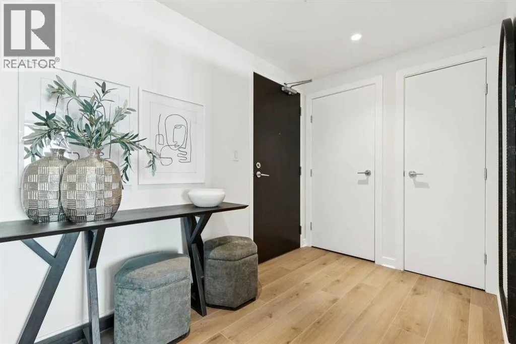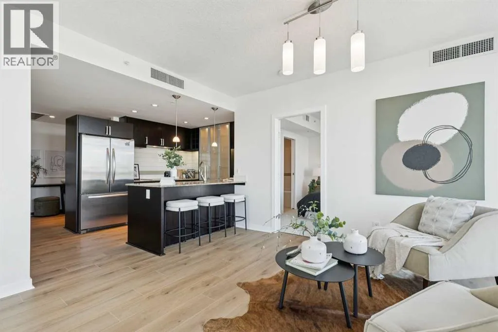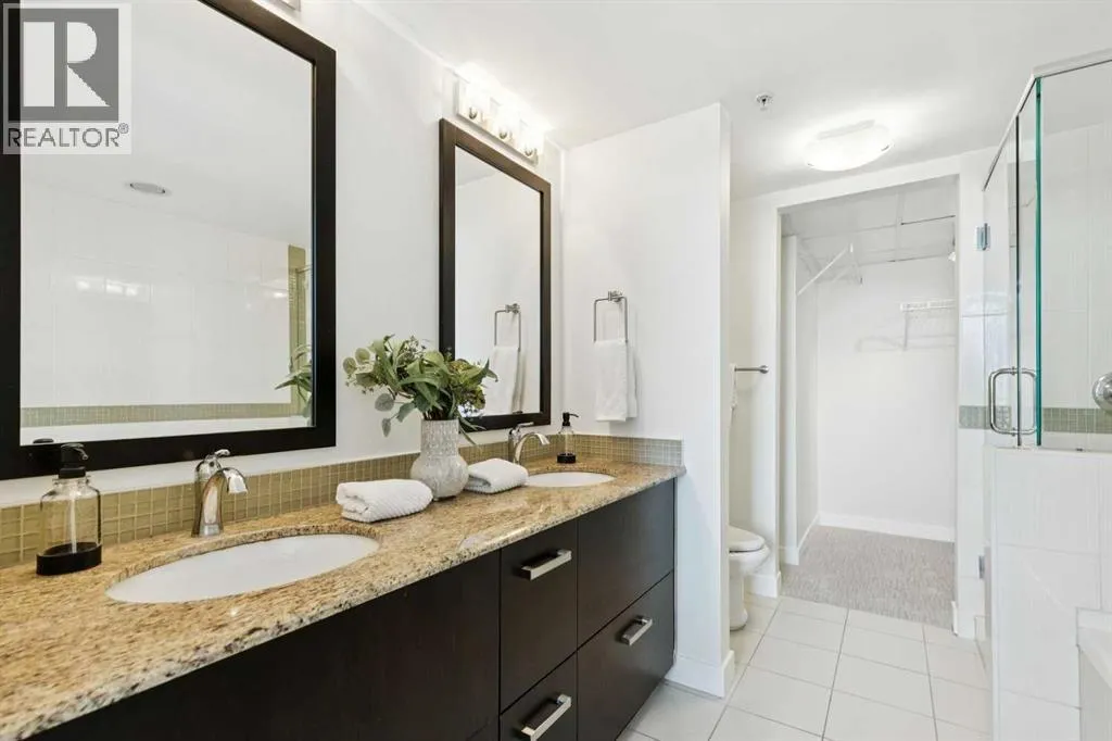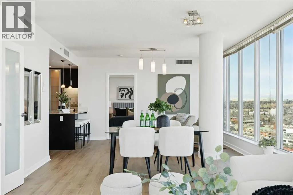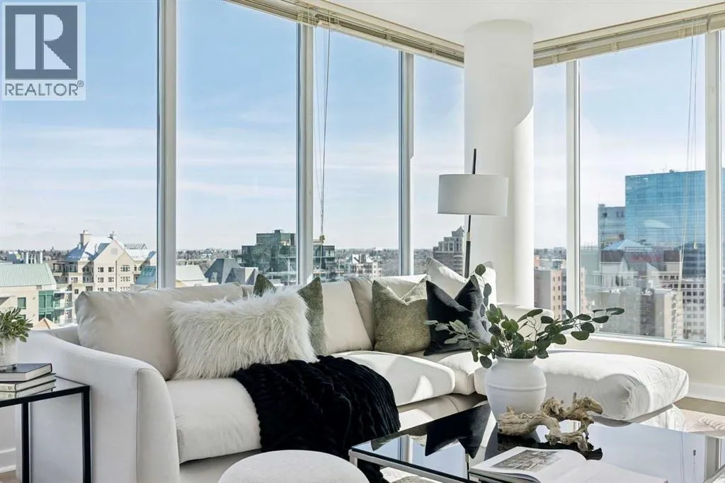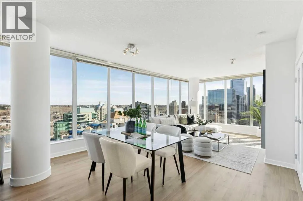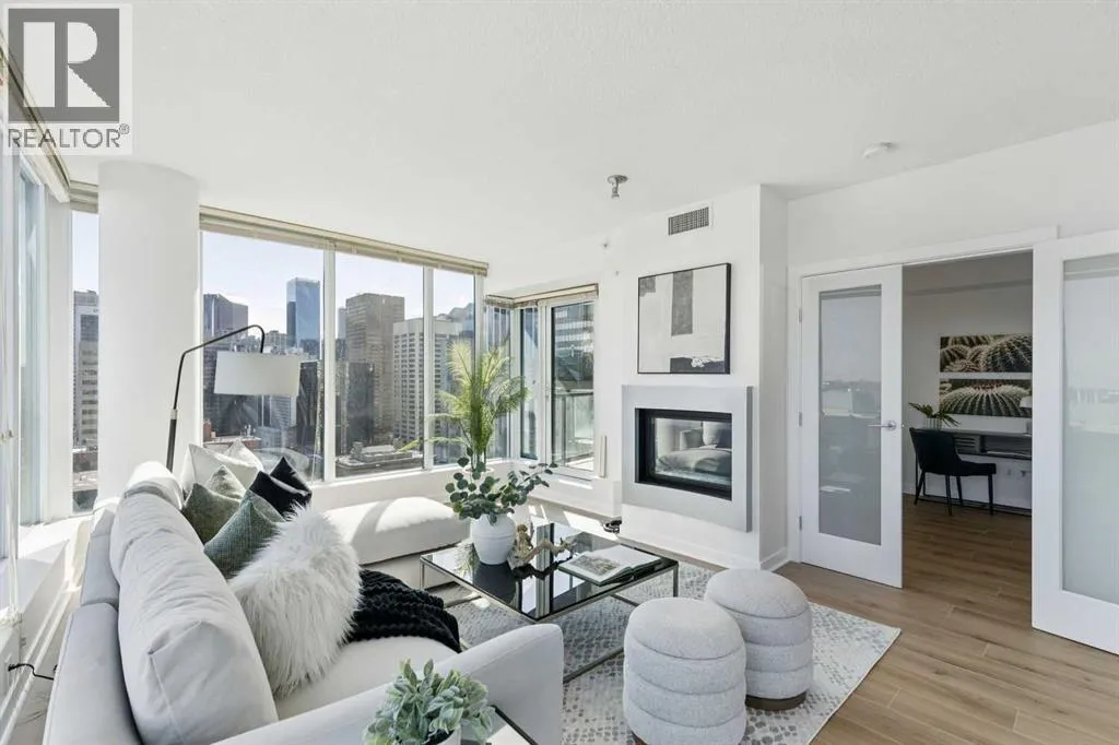 EXECUTIVE CORNER UNIT WITH PANORAMIC BOW RIVER VIEWS! Welcome to this stunning corner unit boasting UNOBSTRUCTED, breathtaking 180 degree views of the Bow River, Nosehill Park, and the majestic mountains through expansive floor-to-ceiling windows. This North & East facing unit offering over 1,000 sq. ft. of elegant living space, this sophisticated condo is sure to impress from the moment you step inside. The chefâs kitchen is thoughtfully designed with Granite countertops, warm wood cabinetry, stainless steel appliances & stylish tile backsplash. The spacious main living area features a cozy natural gas fireplace, a generous dining space, and a versatile flex area perfect for a home office or reading nook. The master bedroom offers brand new carpet and ample space to comfortably accommodate a king-sized bed plus additional furniture. The luxurious 5-piece ensuite bathroom includes a soaker tub, tiled walk-in shower, double vanity with granite countertops, and tile flooring. The second bedroom is equipped with a large Murphy bed (ideal for guests) and offers plenty of room for bedroom furnishings or additional office space. Step outside to a generous patio area perfect for outdoor dining and entertaining with a BBQ gas hookup & BBQ included. ADDITIONAL FEATURES INCLUDE: new carpet in the master bedroom and closet, NEWER luxury laminate floor throughout, fresh paint throughout, oversized titled parking stall, dedicated storage unit, central A/C, pet friendly policy, onsite fitness centre, and bike storage near your parking stall. The Solaire is a prestigious executive building offering premium amenities such as a fully equipped fitness centre, concierge services (including dry-cleaning coordination), lots of underground visitor parking, and secure bike storage within the parkade. Situated in an unbeatable location, you are steps away from top dining destinations like Buchananâs and Alforno, the Street Eatery downstairs has globally inspired street food (rated 4.5 stars on Google reviews), the scenic Bow River Pathway, Peace Park with rentable picnic spots, and vibrant community events including the Calgary Folk Festival and summer food trucks. Enjoy an easy 9-minute bike ride to East Village, 3 minutes to Kensington, and a 15-minute walk (or 6-minute bike) to Stephen Avenue Walk. This executive property is truly a showstopper, perfectly blending luxury, location, and lifestyle. (id:27476)