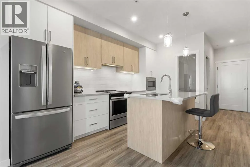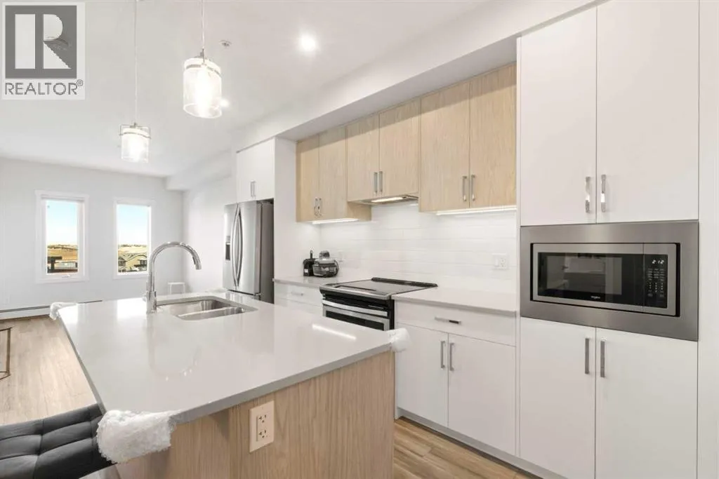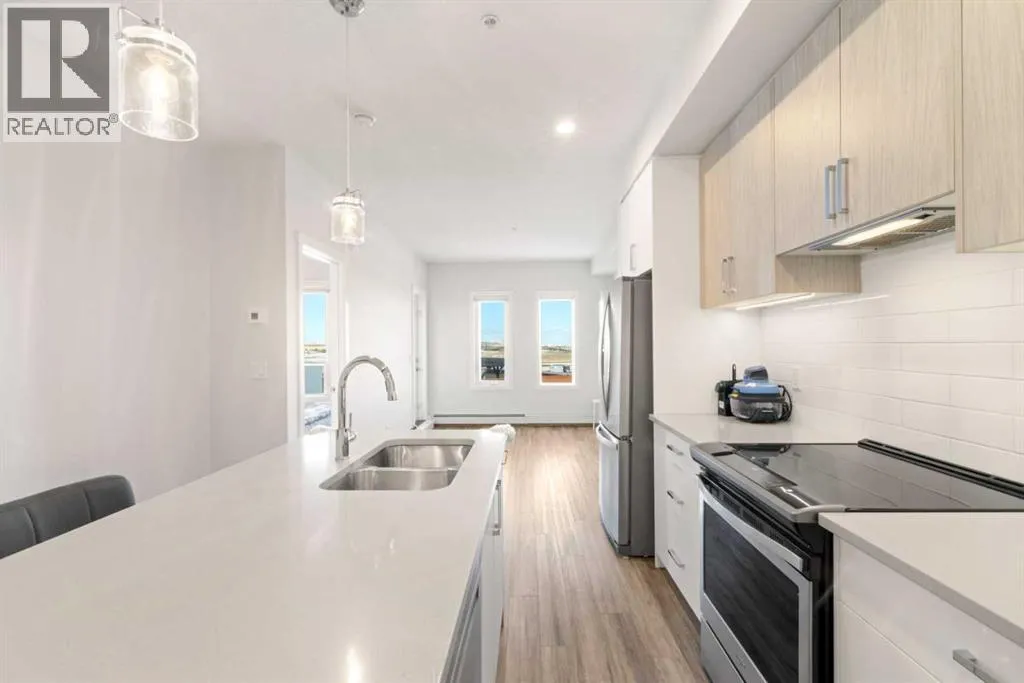 Step into a space that instantly feels like home in the vibrant community of Sage Hill Quarter. This beautifully maintained second floor condo offers a perfect balance of style, comfort and everyday functionality, all in one of northwest Calgaryâs most convenient locations. From the moment you walk in, you are welcomed by a bright, open layout with durable vinyl plank flooring flowing seamlessly throughout, creating a clean and modern feel. The kitchen is a standout feature with its eye catching two toned cabinetry, stainless steel appliances, ample storage and a central island that is perfect for casual dining or entertaining, all finished with sleek quartz countertops that carry through to the bathroom as well. The living room is filled with natural light and opens onto your private balcony complete with a gas line, ideal for summer BBQs and relaxing evenings. The primary bedroom is spacious and thoughtfully designed, featuring a large walk through closet that leads directly to a well appointed four piece bathroom. Adding even more versatility to the layout is a separate flex room that works perfectly as a home office, guest space or hobby room. A dedicated laundry room adds extra convenience along with additional in suite storage. This home is truly move in ready and offers the ease of low maintenance living with the added benefits of a titled underground parking stall and a titled storage locker. Located in the heart of Sage Hill Quarter, you are just steps from everyday essentials including groceries, pharmacy, restaurants, fitness studios and more, making it easy to enjoy a walkable lifestyle. Surrounded by pathways, parks and green space, and with quick access to Stoney Trail, Shaganappi Trail and nearby shopping destinations like Beacon Hill, this is a location that truly connects you to everything you need. (id:27476)