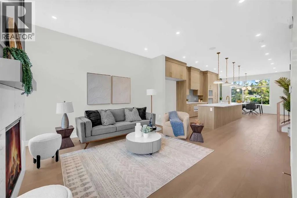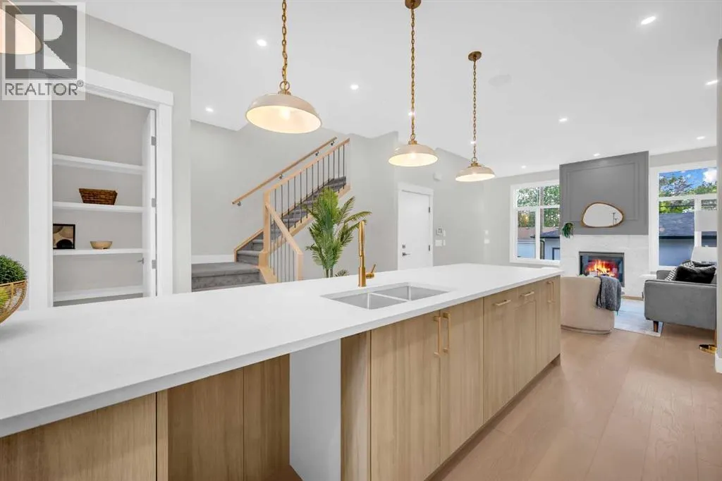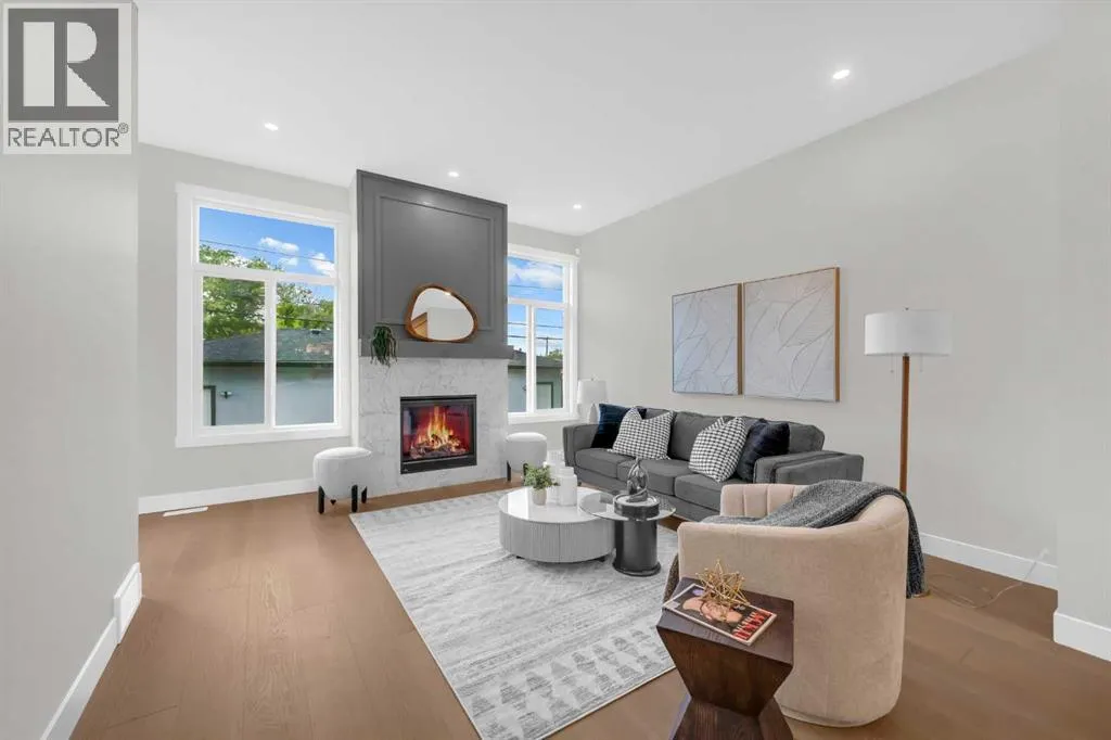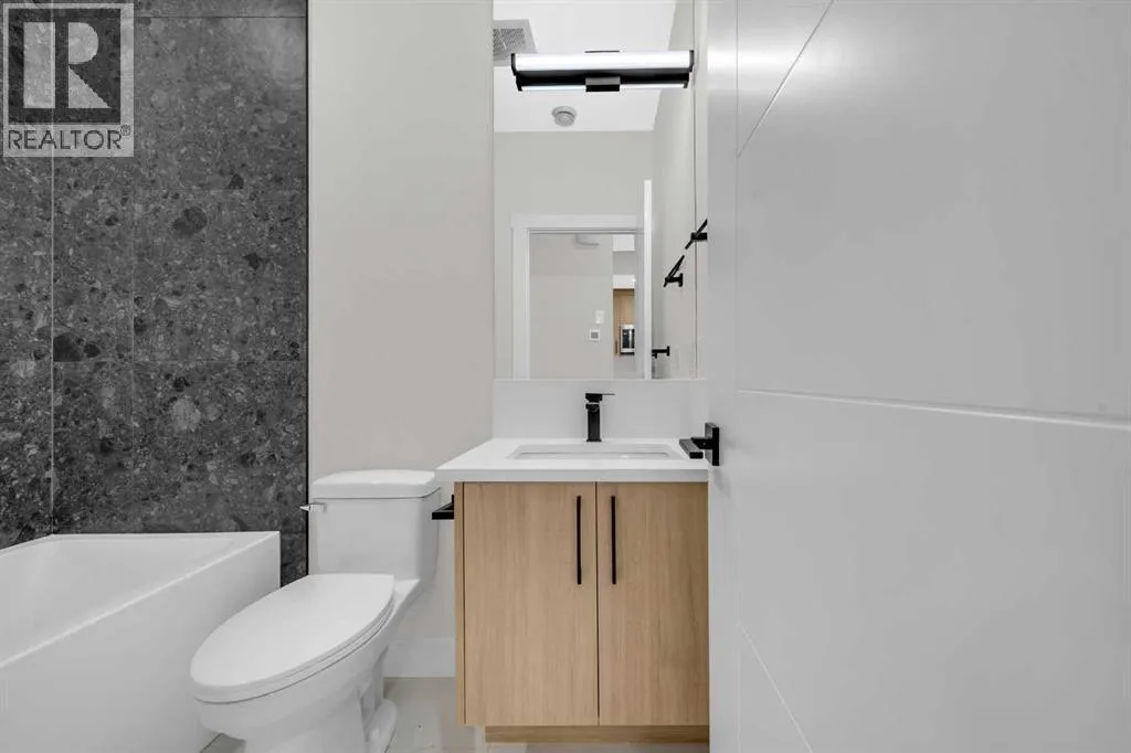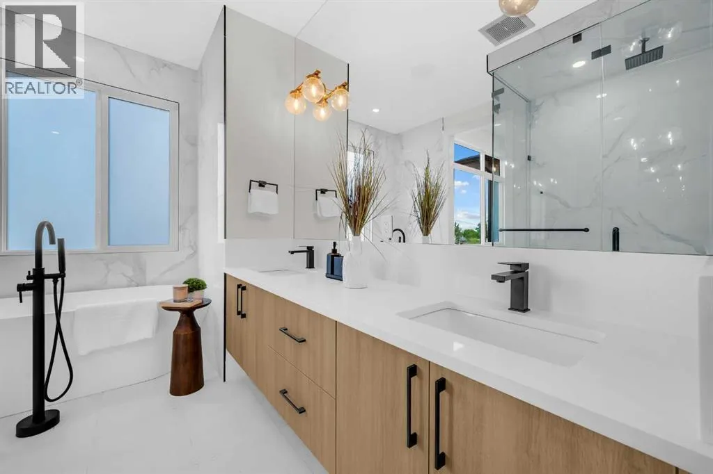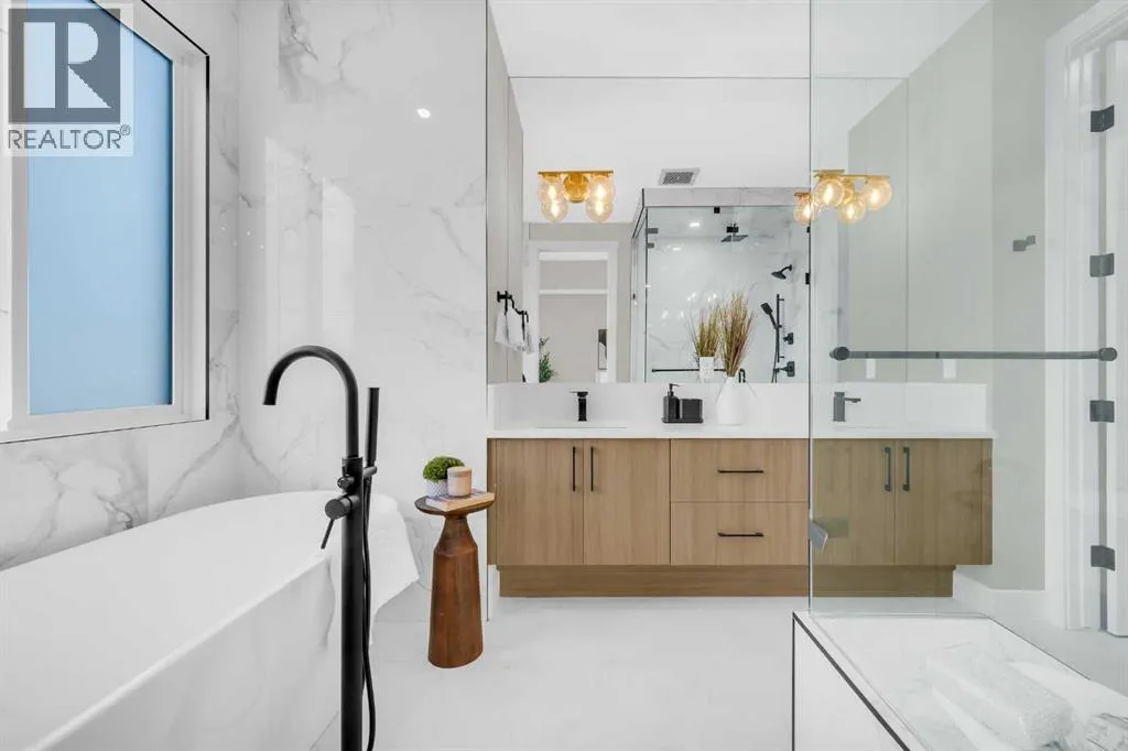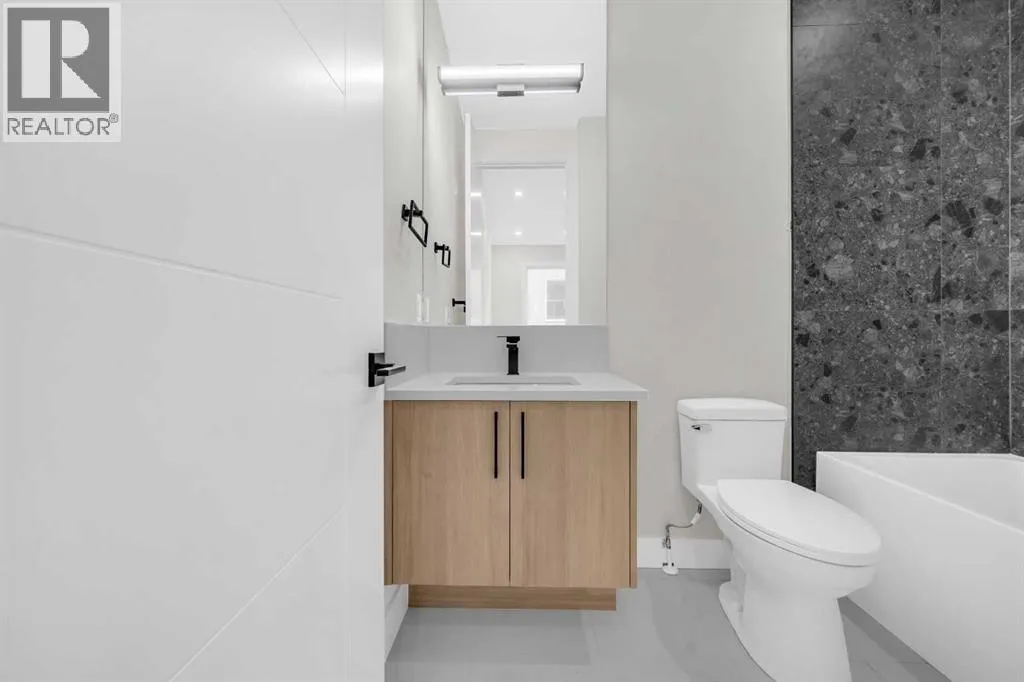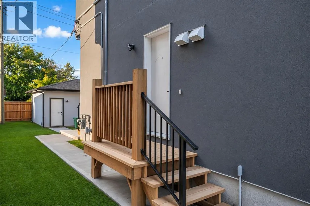 Calling all Investors! Looking for a brand new SXS Duplex with legal basement suites? This 8114 unit can be sold together with attached 8112 to provide an excellent cash flowing opportunity with the convenience of having all construction materials and components still under New Home Warranty. Both 8114 and 8112 are rented on long term leases with tenants who would prefer to stay. This unit rents monthly at $3100 for the upper suite + 70% utlitles and $1250 + 30% utilities for the lower suite. Amazing home boasting elevated design and incredible functionality, featuring a legal 2-bedroom basement suite and a sunny south exposed front with expansive valley views from the upper floor. Every detail was thoughtfully selected, from the wide-plank modern floors to the curated lighting and premium finishes throughout. Step inside to a bright, open-concept main floor with 10' ceilings, oversized windows and neutral tones that create an airy, inviting vibe. The large, well-lit dining room is perfect for bigger families and/or hosting guests and shows off a vibrant and colourful feature wall, which flows seamlessly into a designer kitchen featuring modern warm toned cabinetry, paired with beautifully coloured glass backsplash, quartz countertops, matte black hardware, a huge walk-in pantry with built-in shelving, and a perfect-sized center island with bar seating with more natural wood tones, bringing everything together beautifully. The upgraded stainless steel appliance package includes an oversized sub zero fridge with french doors, a gas cooktop with stylish hood fan, and a thoughtfully placed wall oven and microwave. The rear living room is wide and spacious featuring additional large windows plus a cozy gas fireplace with stone surround and custom mantle, and which leads you out to the large backyard, which features an oversized concrete pad, perfect for end of the day BBQ's and lounging. An enclosed mudroom with a large closet area and a sleek powder room that comes wit h a raised matte black sink complete the mainfloor. Upstairs contains the three large bedrooms, all with trayed ceilings, including the primary bedroom which is a true retreat that features a large walk-in closet with several custom built-ins plus a hotel like ensuite. Enjoy heated tile flooring, dual sinks, quartz countertops, matching tile surrounds, plus a free standing soaker tub and an oversized glass shower with rain shower head and roughed-in for steam. The upper laundry room comes with a sink, quartz countertops, additional wood toned cabinetry, and is situated beside the stylish full bathroom which features a tiled tub/shower combo. Downstairs features the thoughtfully designed legal 2 bedroom suite and features 9' ceilings, luxury vinyl plank flooring, wonderfully warm toned cabinetry, stainless steel appliances and lots of pot lighting. A full bathroom with elegant tile is also featured plus a dedicated laundry room, separate side entrance and storage, making this perfect for rental income. (id:27476)