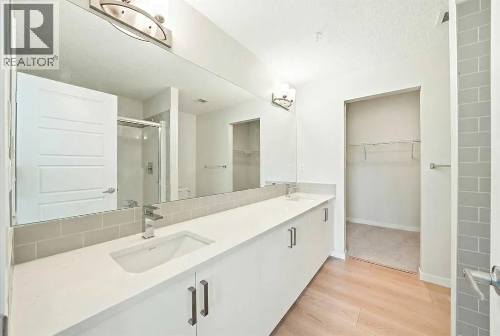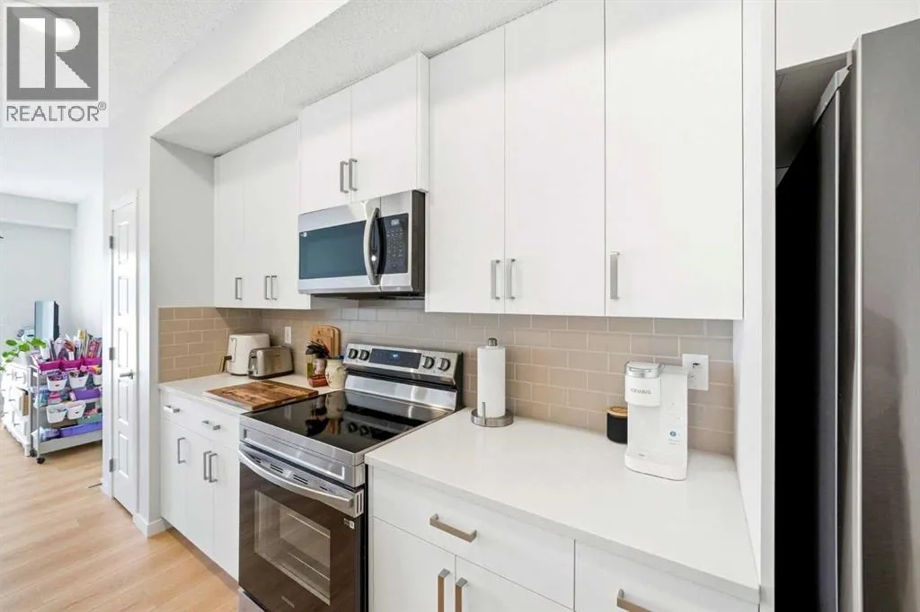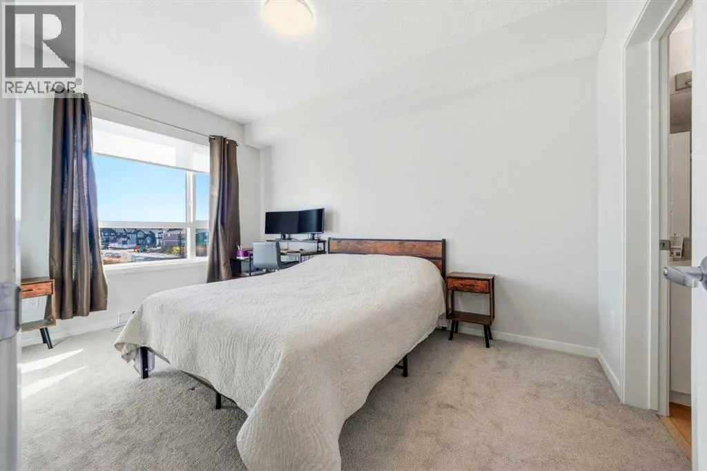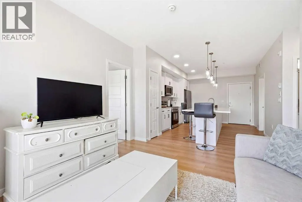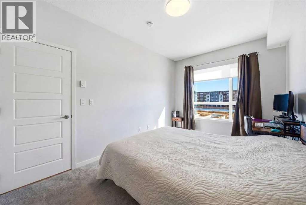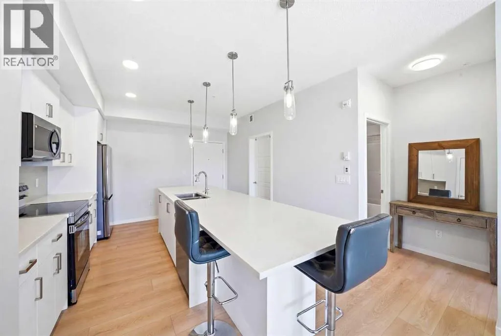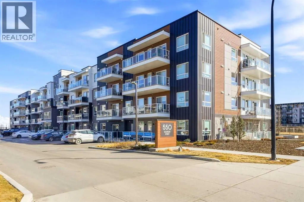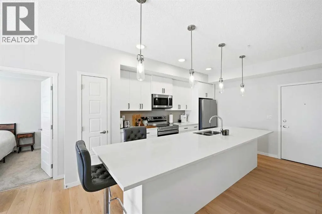 Experience elevated living in this stunning 2-bedroom, 2-bathroom apartment, where modern design meets everyday comfort. Perfectly positioned with south facing exposure, this home is filled with natural light, creating a warm and inviting ambiance throughout.The heart of the home is a beautifully designed open-concept kitchen featuring sleek quartz countertops, premium stainless steel appliances, and an expansive island with an integrated sink, ideal for entertaining, casual dining, or gathering with family and friends. Designer pendant lighting and clean, contemporary cabinetry add a refined touch to the space. The spacious primary bedroom offers a peaceful retreat with plush carpeting, generous windows, and direct access to a private ensuite. A well appointed second bedroom provides flexibility for guests, a home office, or growing families. Enjoy the convenience of a walk-in closet and an oversized laundry room with ample additional storage, perfect for keeping everything organized and out of sight. Additional features include secure underground parking, modern finishes throughout, and a thoughtfully designed layout that maximizes both style and functionality. Located in the vibrant and rapidly expanding community of Belmont, this home offers a walkable lifestyle surrounded by parks, playgrounds, and beautiful green spaces just steps from your door. Enjoy the convenience of nearby shops, restaurants, and everyday essentials, with even more on the horizon. (id:27476)