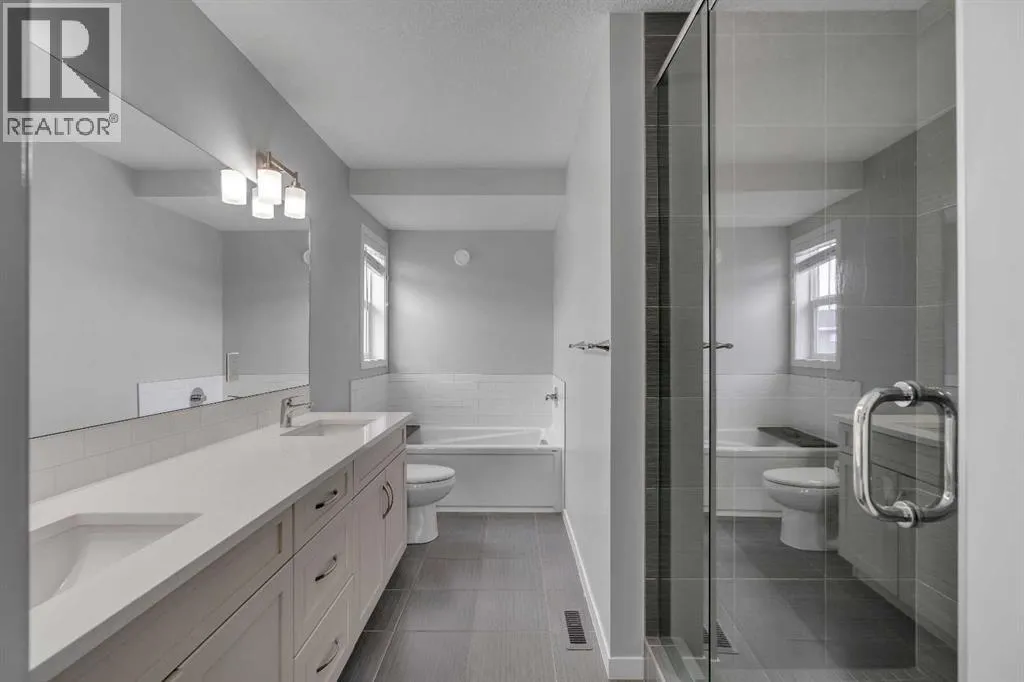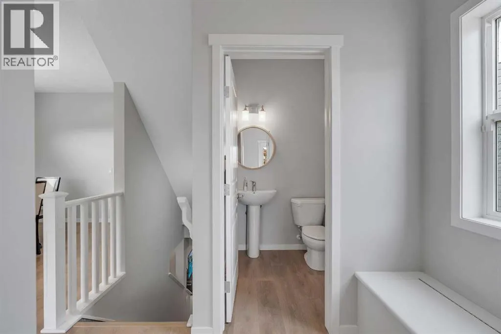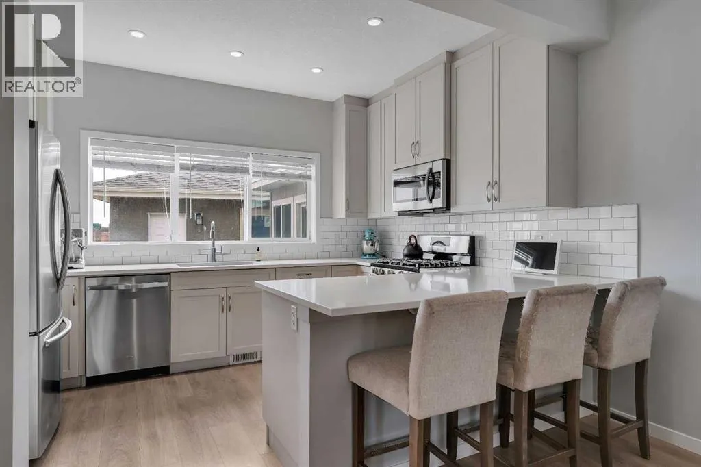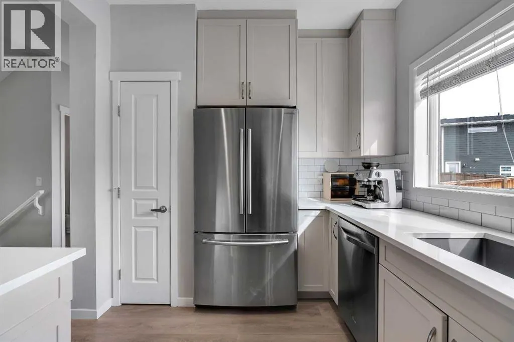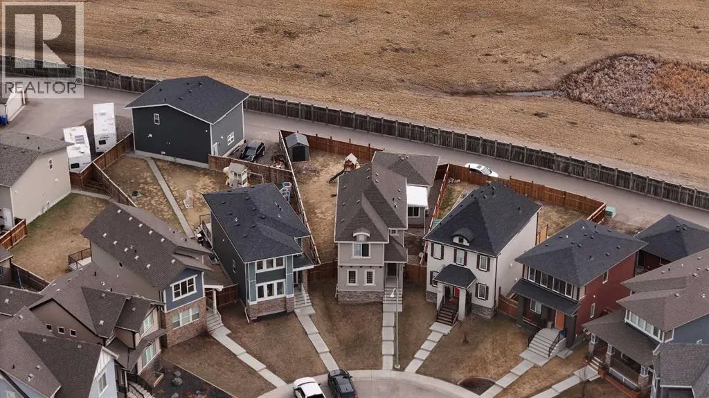 Welcome to Marquis Court! This air-conditioned, fully developed home offers over 2,200 sq. ft. of developed living space, plus a separate backyard office. The main floor features 9-ft ceilings, luxury vinyl plank flooring, and an upgraded kitchen with pot lighting, extended cabinetry, quartz countertops, white subway tile backsplash, stainless steel appliances including a gas range, a pantry, and a peninsula island with seating. The kitchen opens to a spacious dining area with an added window for extra natural light. The family room is bright and inviting, and an additional flex space provides room for a home office or whatever suits your needs. A functional mudroom with a storage bench and closet, along with a powder room, completes the main level. Upstairs, youâll find a spacious primary bedroom with a walk-in closet and a well-appointed ensuite featuring an oversized tiled shower, double sinks, quartz countertops, and a soaker tub. There are two additional bedroomsâone with a walk-in closet and one with a closet organizerâalong with the main bathroom and a convenient upper-floor laundry room with extra cabinetry and a hanging bar. The builder-developed basement includes a large rec room, bedroom, full bathroom, and plenty of additional storage. A standout feature is the separate backyard office, complete with electricity, heat, and air conditioningâan ideal work-from-home setup. The oversized backyard offers a large deck, double garage, and plenty of space to enjoy. Located just steps from the wetlands in the award-winning lake community of Mahogany, youâll enjoy year-round amenities including beaches, skating, paddleboarding, walking paths, and parks, along with nearby schools, shopping, restaurants, and all essential services just minutes away. This home offers tremendous value! (id:27476)