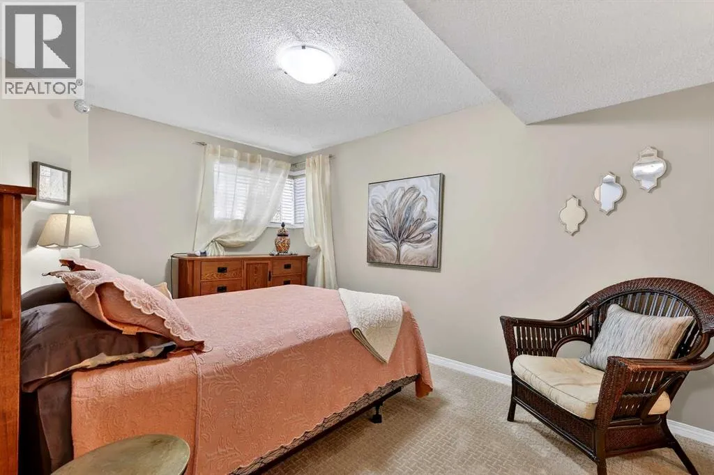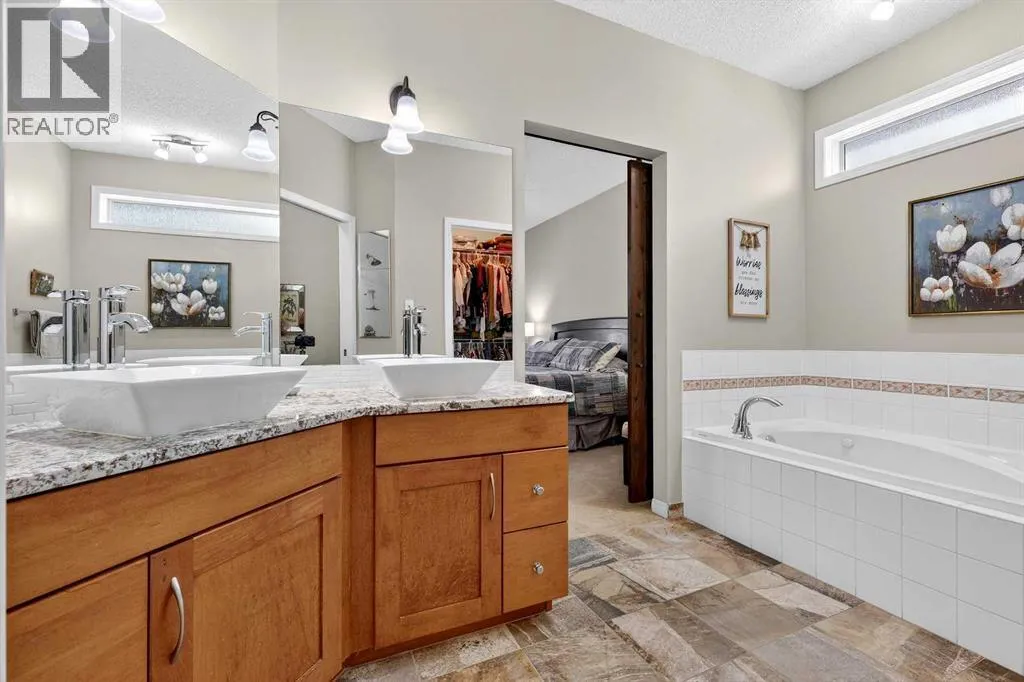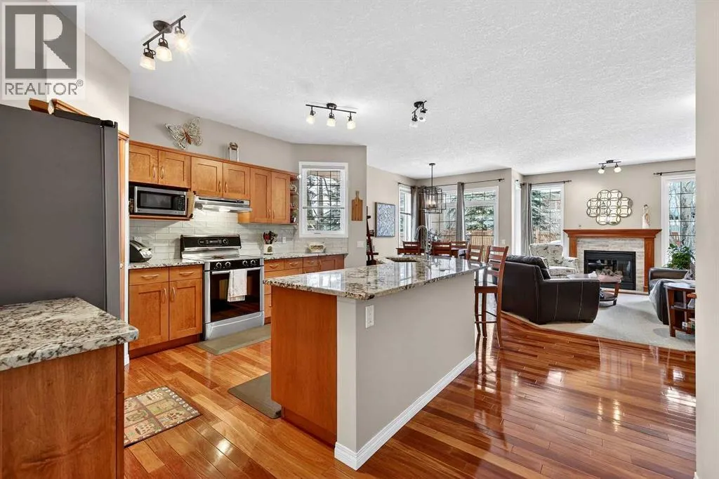 Step inside and the first thing you notice is the light. Brazilian cherry hardwood catches the sun through oversized windows, 9-foot ceilings lift the main floor, and the open-concept kitchen-and-living run pulls you straight through to an elevated deck and a back garden the sellers have spent two decades building. Welcome to 51 Cranleigh Gardens â a 4-bedroom, 2.5-bath bungalow with just under 2,900 sq ft of developed living space, set on a 6,675 sq ft pie lot a half-block from the Cranston ridge pathway and the trails down to the Bow River and Fish Creek.The kitchen was fully renovated in 2020 â new granite, new backsplash, Bosch appliances, a massive working island, and a corner pantry that actually holds a family's groceries. The adjacent eating area opens into a living room anchored by a gas fireplace and walks out to the deck; two steps down puts you on a custom stone patio surrounded by perennial gardens, a productive apple tree, and a vegetable plot already in play. The pie shape leaves real room for a future RV pad and a sizeable shed at the back.The primary suite sits on the main floor â big enough for a king, quiet, with a walk-in closet and a 2020-renovated 5-piece ensuite (dual vanity, jetted tub). A second main-floor bedroom works as a home office or den. Laundry, a 2-piece powder room, and the entry from the attached double garage (new door, 2025) all sit off a tiled landing.Downstairs adds another 1,266 sq ft: a large rec room with a new floor-to-ceiling marble fireplace (2024) and a wet bar, a sunny third bedroom, and a fourth room with closet and window that functions as a full bedroom or flex space. The Jack-and-Jill 4-piece bath between them holds the home's quiet showpiece â a custom Finnish cedar wet sauna, the kind you actually use on a Calgary winter night.Built by Baywest Homes in 2002. Roof 2020. Stucco maintained annually. Full repaint, 2025. Cranston Ridge pathway, the Bow River, schools, and the Cranston and Seton amenities are all w ithin walking or short driving distance â mountain views from the ridge are a five-minute walk from the front door. (id:27476)