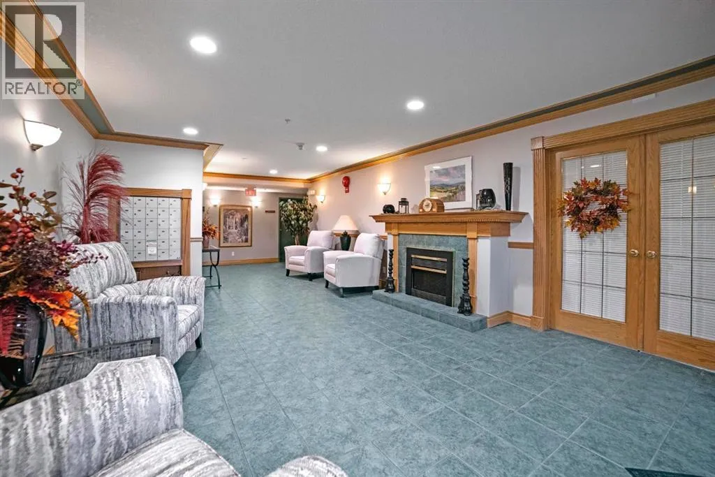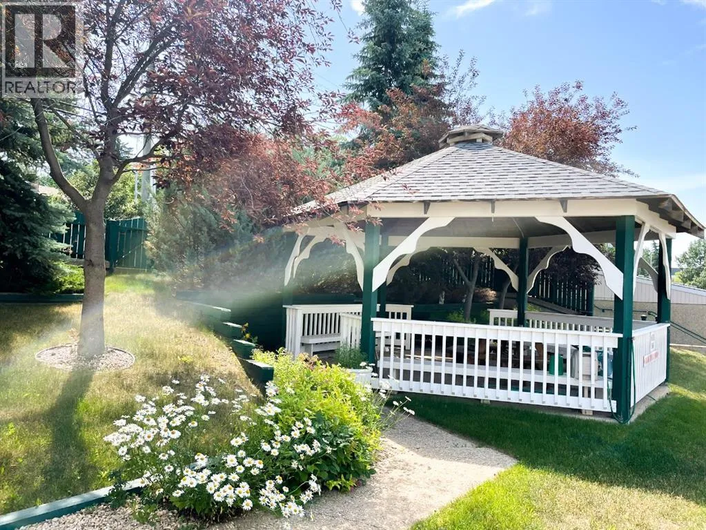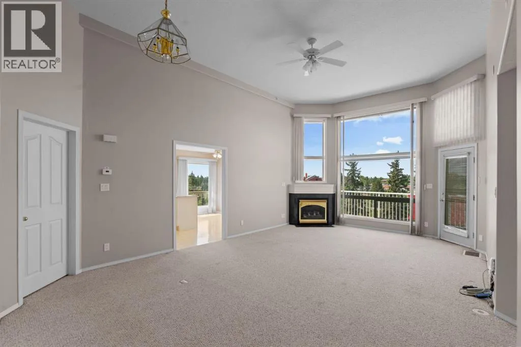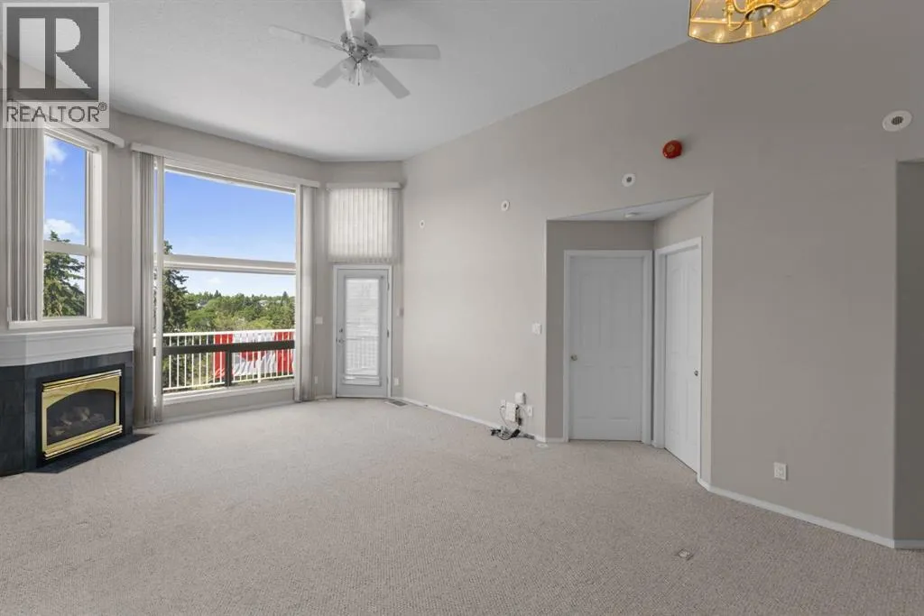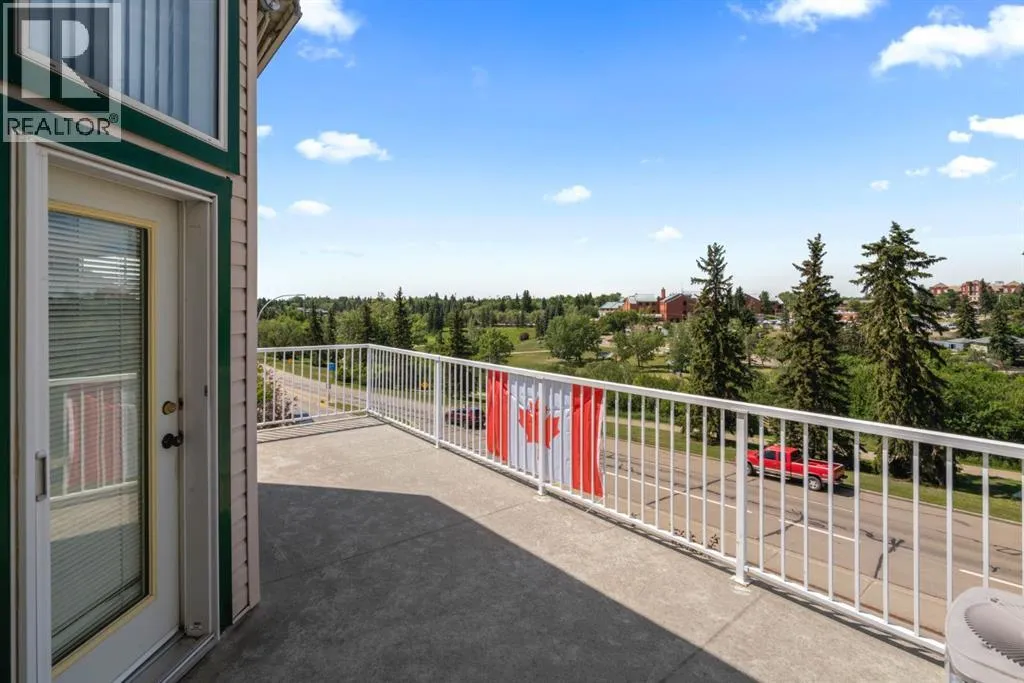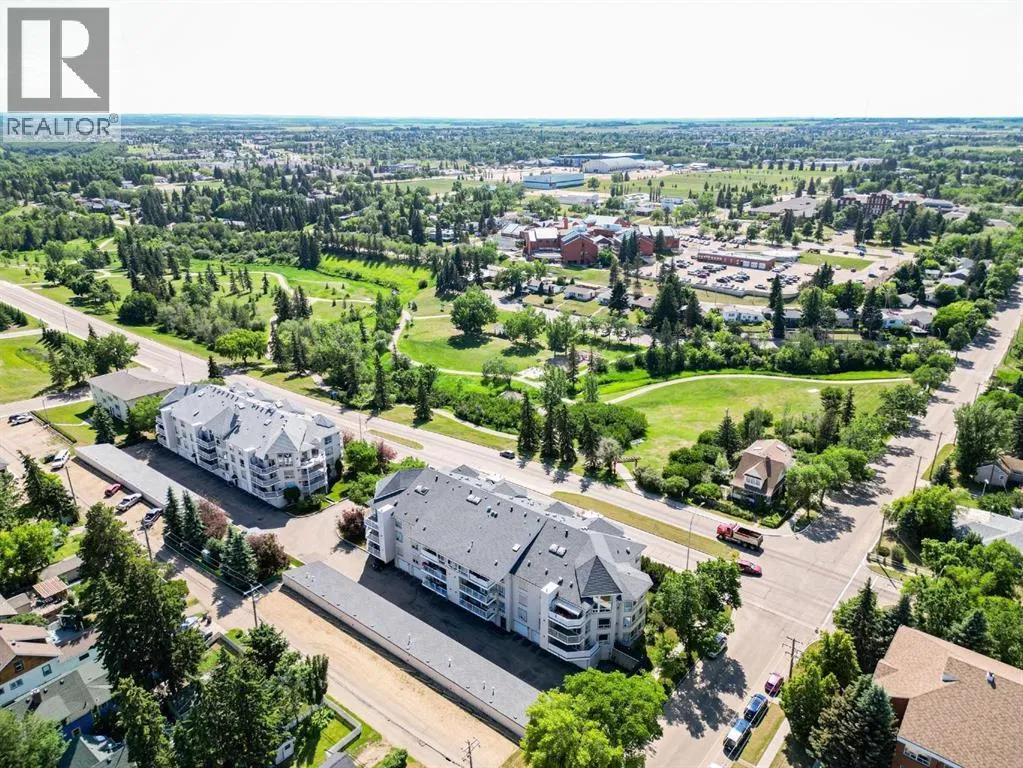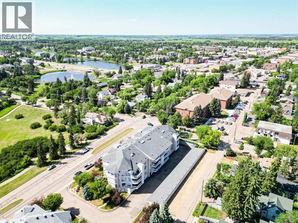 Welcome to this stunning top floor penthouse condo unit in Park Place North! Perfectly situated just steps from Main Street shopping, grocery stores, and restaurants. Enjoy panoramic views of beautiful Jubilee Park- best in town! This bright and spacious 2 bedroom, 2 bathroom condo features 20 foot ceilings, cozy gas fireplace, and central air conditioning for year-round comfort. This home includes in-suite laundry, abundance of storage, and large west facing deck with convenient awning for those sunny days. This unit also has a heated detached single garage with room for storage. This sought after building even has a party room and various organized activities which make this place more than a home- it's a community. (id:27476)