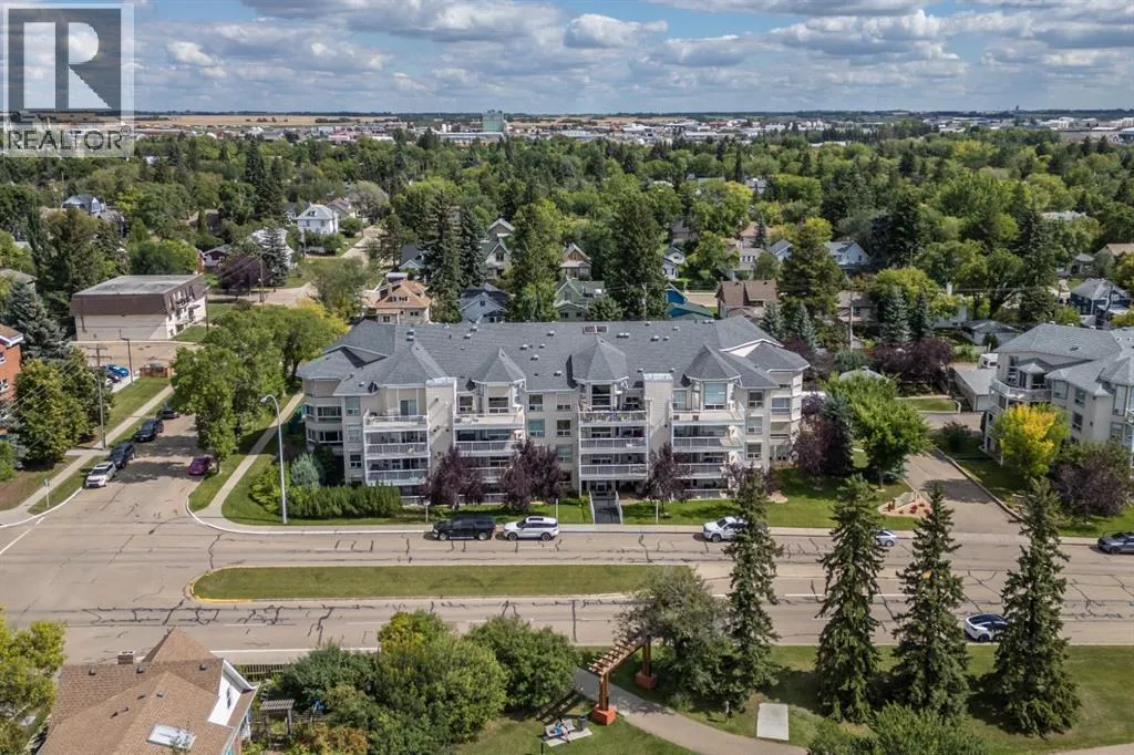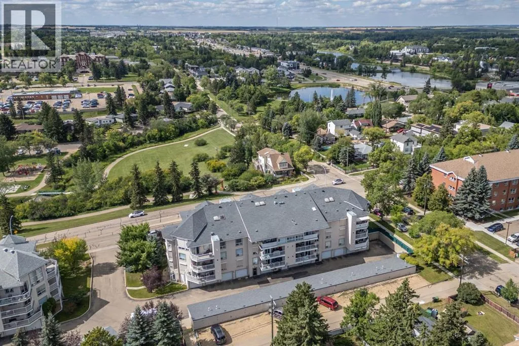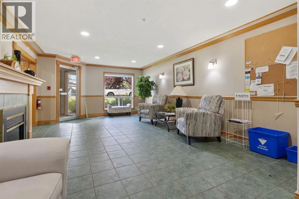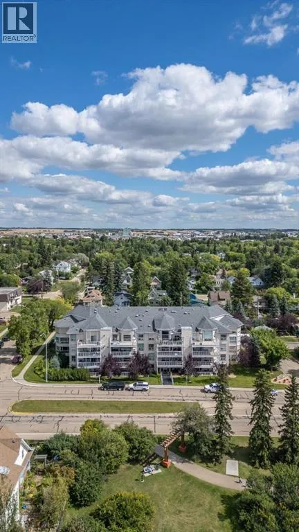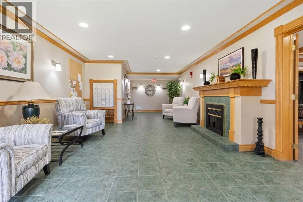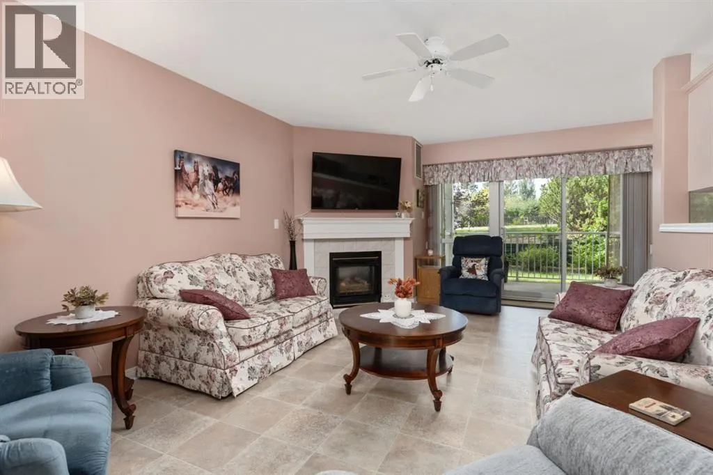 Welcome to this bright and inviting 2-bedroom, 2-bathroom main floor end unit condo, ideally located just across from scenic parks and miles of walking trails, and only steps away from the vibrant heart of downtown Camrose.This unit feels more like a private retreat than a condo, thanks to its lush, garden-like setting. Step through sliding deck doors from the cozy living room-complete with a gas fireplace and classic mantle-onto your covered, private deck. Surrounded by mature shrubs, trees, and an optional privacy screen, this outdoor space feels like your very own secret garden.The kitchen is well laid out with plenty of cabinets and counter space, perfect for baking, cooking, and entertaining. The open dining area offers flexible space whether you're hosting a dinner party or enjoying a quiet evening at home.Down the hall, you'll find a spacious primary bedroom with a large window, walk-in closet, and its own 3-piece ensuite. The second bedroom, perfect for guests or a home office, features corner windows with views of greenery, offering a calm, peaceful ambiance. A full 4-piece main bathroom and in-suite laundry with additional storage complete the interior.An added bonus: this unit is just steps from the titled attached garage, making it incredibly convenient and accessible.The building is professionally managed and features a strong, welcoming community. Take part in social events like music nights, coffee mornings, dinners, and games in the party room, or enjoy the quiet privacy of your own space. The choice is yours.Whether you're downsizing, looking for a peaceful home base, or a low-maintenance lifestyle close to everything, this condo offers a rare blend of comfort, nature, community, and convenience. (id:27476)