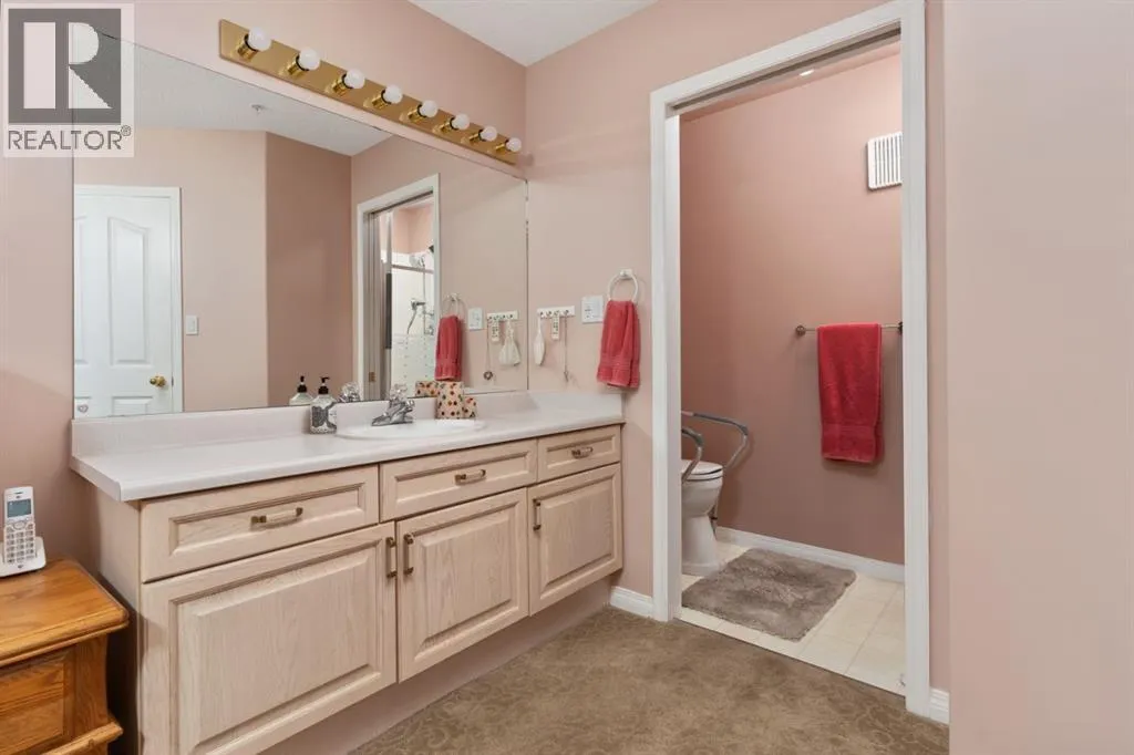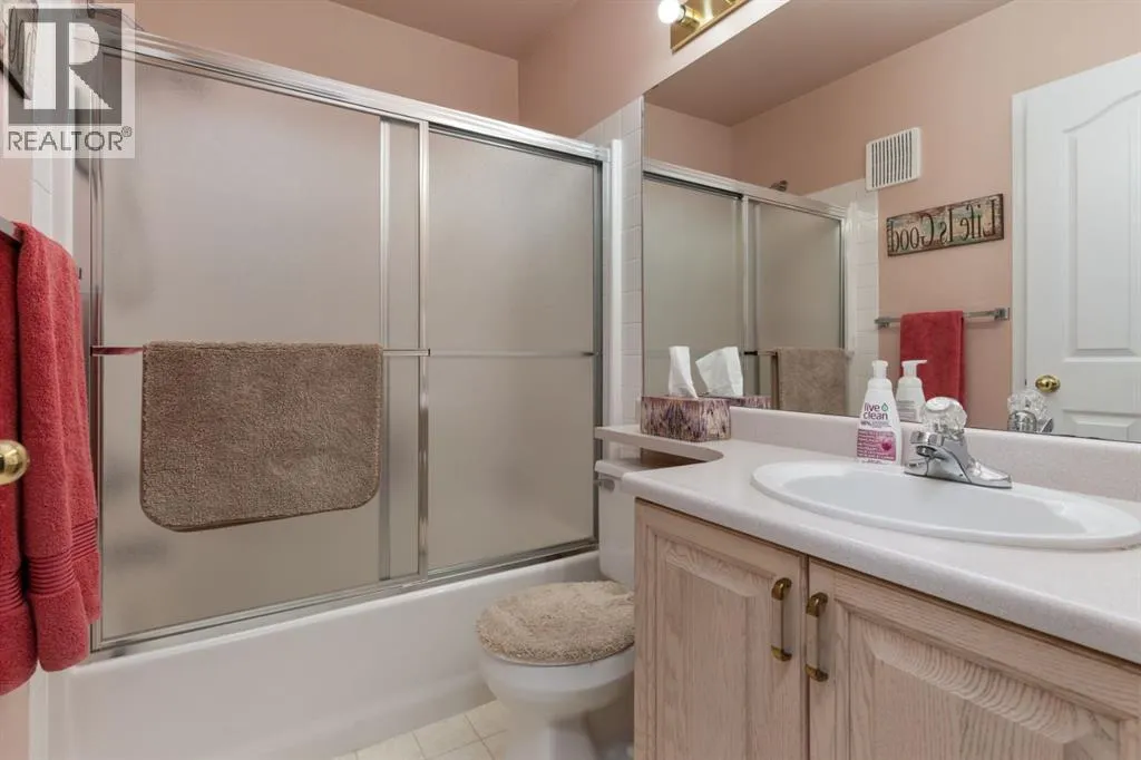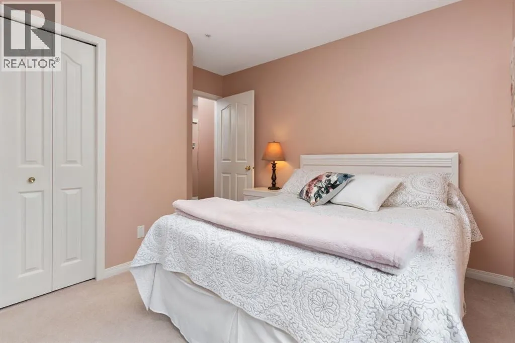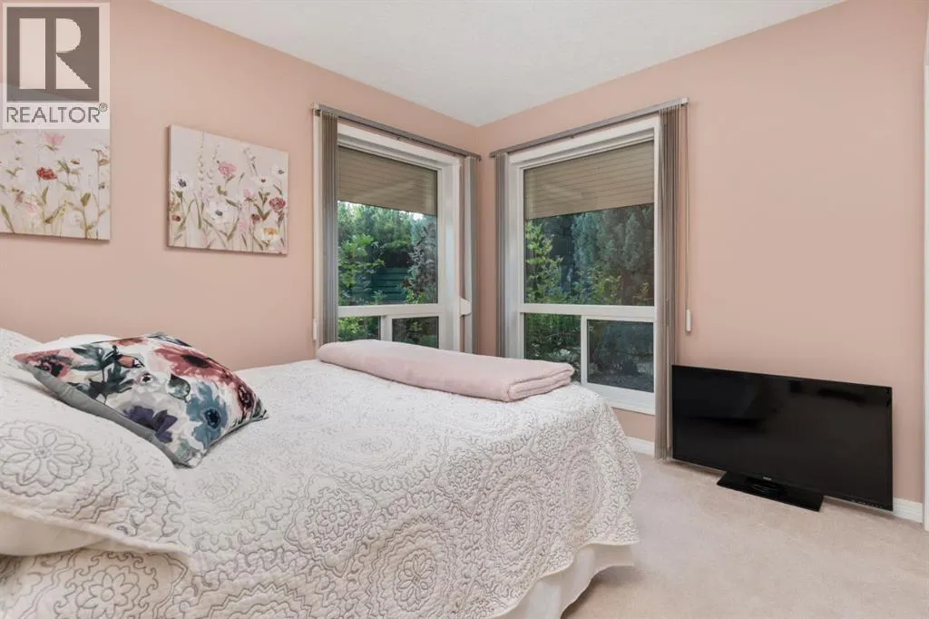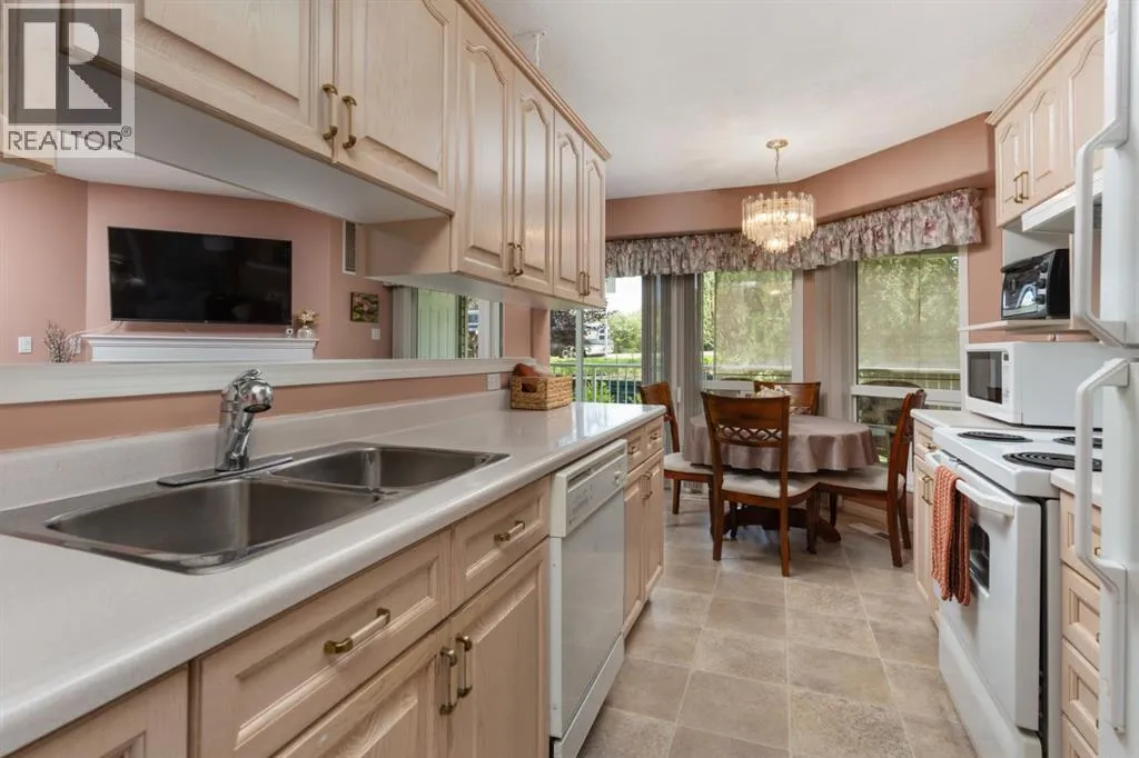 Welcome to this bright and inviting 2-bedroom, 2-bathroom main floor end unit condo, ideally located just across from scenic parks and miles of walking trails, and only steps away from the vibrant heart of downtown Camrose.This unit feels more like a private retreat than a condo, thanks to its lush, garden-like setting. Step through sliding deck doors from the cozy living room-complete with a gas fireplace and classic mantle-onto your covered, private deck. Surrounded by mature shrubs, trees, and an optional privacy screen, this outdoor space feels like your very own secret garden.The kitchen is well laid out with plenty of cabinets and counter space, perfect for baking, cooking, and entertaining. The open dining area offers flexible space whether you're hosting a dinner party or enjoying a quiet evening at home.Down the hall, you'll find a spacious primary bedroom with a large window, walk-in closet, and its own 3-piece ensuite. The second bedroom, perfect for guests or a home office, features corner windows with views of greenery, offering a calm, peaceful ambiance. A full 4-piece main bathroom and in-suite laundry with additional storage complete the interior.An added bonus: this unit is just steps from the titled attached garage, making it incredibly convenient and accessible.The building is professionally managed and features a strong, welcoming community. Take part in social events like music nights, coffee mornings, dinners, and games in the party room, or enjoy the quiet privacy of your own space. The choice is yours.Whether you're downsizing, looking for a peaceful home base, or a low-maintenance lifestyle close to everything, this condo offers a rare blend of comfort, nature, community, and convenience. (id:27476)