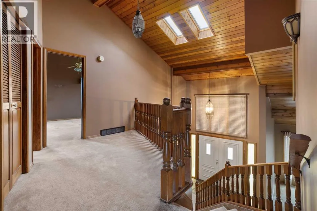 Discover a rare opportunity to own this well cared for and in solid original condition home nestled in an exclusive cul-de-sac in the highly sought-after Duggan Park neighbourhood. Perfectly positioned backing onto picturesque Duggan Pond, this property offers serene water views, abundant wildlife, and the privacy of a beautifully treed yard.From the moment you step through the impressive double front doors, youâre greeted by a soaring foyer and a striking open staircase that sets the tone for the rest of the home. The main floor is designed for both elegant entertaining and comfortable family living. Enjoy a spacious sunken living room and formal dining area, accented by a luxurious three-way gas fireplace and rich parquet hardwood flooring.The kitchen is a chefâs delight, featuring solid oak cabinetry, granite countertops, and newer appliances. A casual dining area overlooks a cozy nook with custom built-in cabinetry and bookcasesâperfect for morning coffee or family gatherings. The main floor also includes a rare and inviting library or office space complete with a wood-burning fireplace, a two-piece powder room, and a spacious laundry room with extensive cabinetry and access to the deck and attached double garage.Up the semi-spiral staircase, youâll find a bright and open landing, four generous bedrooms, and a large main bathroom. The primary suite is a true retreat, featuring a walk-through closet, private three-piece ensuite, and a tranquil sunroom where you can unwind and take in the views.The finished basement offers even more living space, including a large recreation area with a bar, a full bathroom with a luxury shower, and multiple storage rooms. Walk out basement to truly enjoy your backyard oasis. The home also features A/C, a garage floor drain, RV parking, a shed and more! Adding to the homeâs charm, the front yard showcases a unique hand-carved willow tree sculpture by well-known artist Kelly Daviesâa distinctive piece of art that beautifully complements the propertyâs natural setting.Blending timeless design with a one-of-a-kind setting, this exceptional home provides everything your family could needâand more. Enjoy peaceful living among friendly neighbours in a quiet, established community, all while surrounded by nature and stunning pond views. (id:27476)