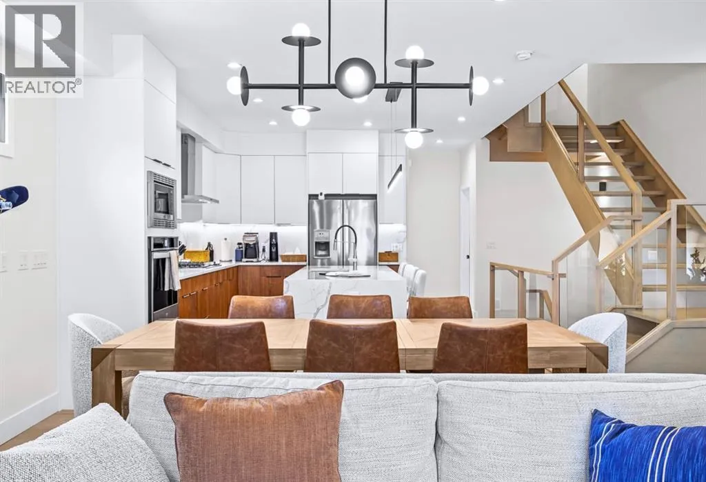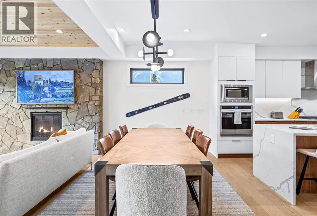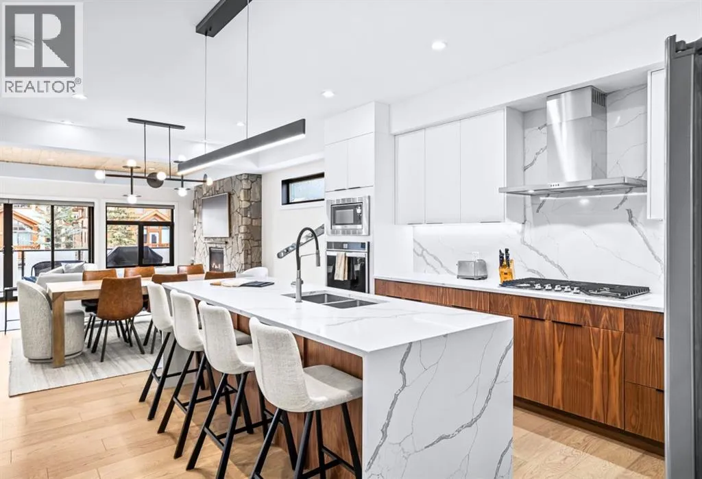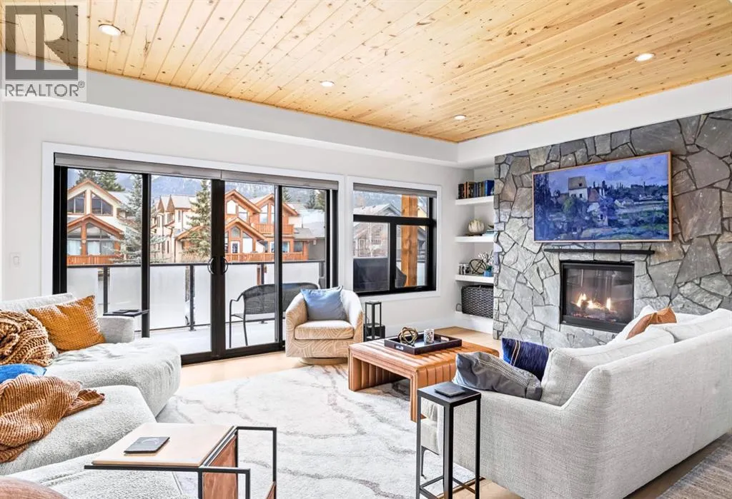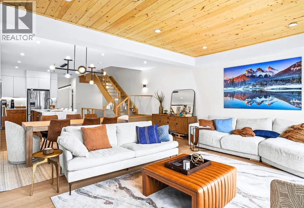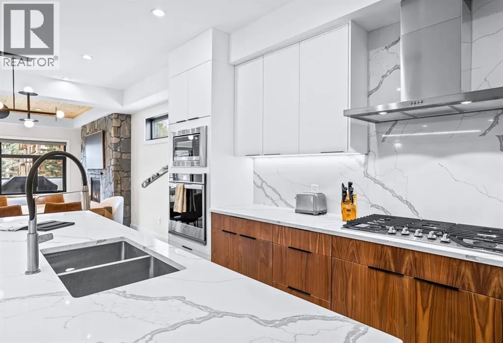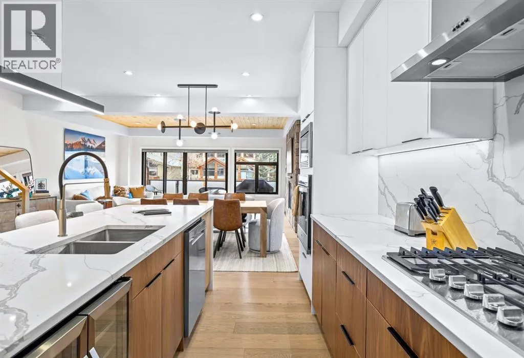 Welcome to this stunning like-new townhome, nestled in the heart of downtown Canmore, surrounded by the majestic Canadian Rocky Mountains. Offering the perfect blend of luxury and location, this exquisite home comes fully furnished, and boasts breathtaking mountain views from every room, creating a sense of serenity and connection with nature.Step inside to discover an open, airy layout with vaulted ceilings and a tall tongue-and-groove ceiling in the living room, amplifying the spaceâs grandeur. The room is anchored by a massive stone fireplace, providing both a striking focal point and warmth, making it perfect for cozy nights spent admiring the snow-capped peaks outside.The chef-inspired kitchen is an absolute showstopper, featuring quartz waterfall countertops and a matching quartz backsplash, offering a modern aesthetic and durability. The sleek hardwood floors flow throughout the home, exuding timeless elegance, while the open wood staircase adds a touch of rustic charm.With four spacious bedrooms and four luxurious bathrooms, this home is designed for comfort and convenience. Three of the bedrooms feature their own ensuites, ensuring privacy and luxury for each resident or guest. Whether you're waking up to a mountain sunrise or unwinding with a sunset over the peaks, you'll enjoy views from every room.Step outside onto the south-facing deckâperfect for morning coffees, evening cocktails, or simply soaking in the surrounding beauty of the mountains. The double-car garage offers ample space for your vehicles and gear, making this townhome as practical as it is beautiful.Located in one of Canmoreâs most desirable and convenient neighborhoods, this home is just a stoneâs throw away from the best shopping, dining, and entertainment. Outdoor enthusiasts will appreciate the proximity to trails, parks, and the stunning Bow River, ideal for walks, hikes, and adventures in every season.This exceptional townhome is more than just a place to liveâit's a l ifestyle, offering the ultimate balance of comfort, style, and outdoor adventure in the heart of the Canadian Rockies. (id:27476)