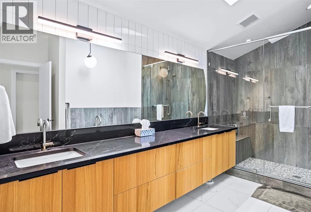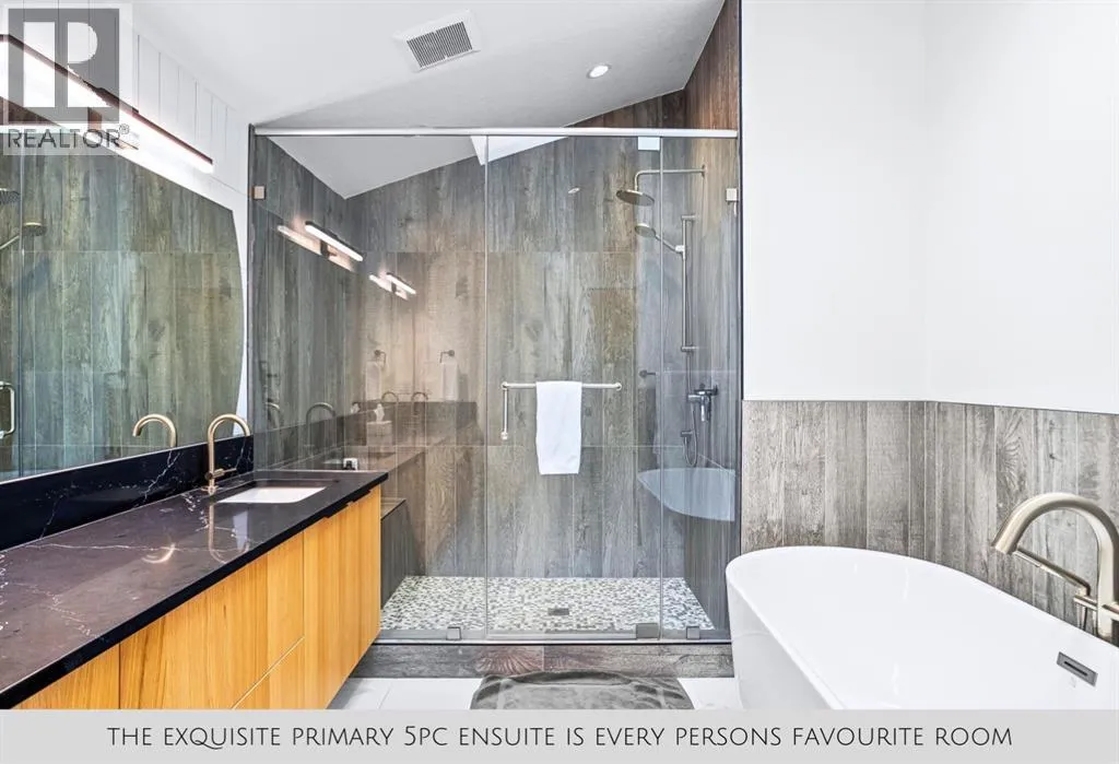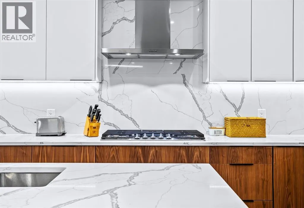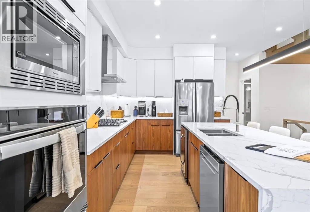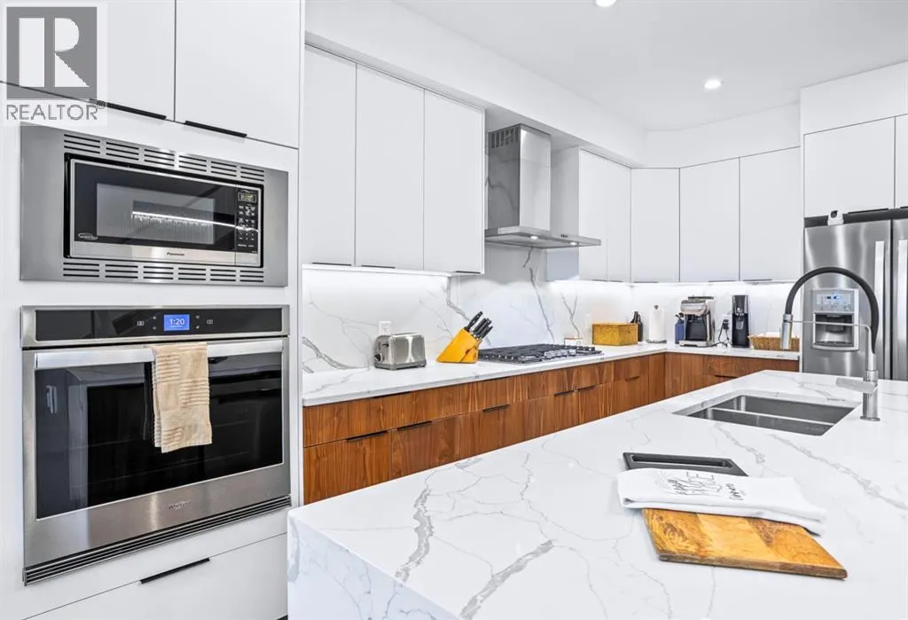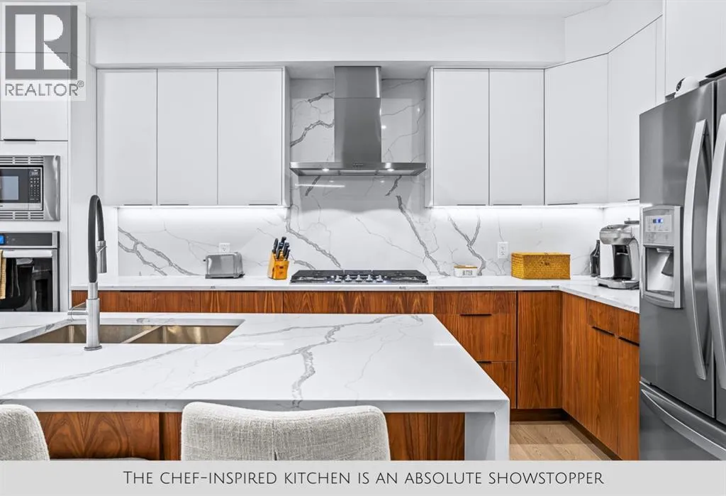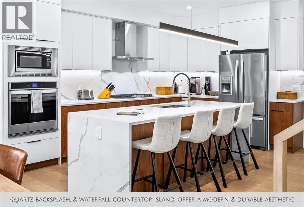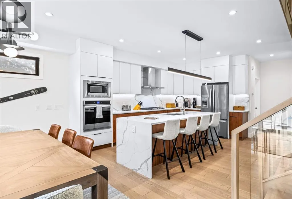 Welcome to this stunning like-new townhome, nestled in the heart of downtown Canmore, surrounded by the majestic Canadian Rocky Mountains. Offering the perfect blend of luxury and location, this exquisite home comes fully furnished, and boasts breathtaking mountain views from every room, creating a sense of serenity and connection with nature.Step inside to discover an open, airy layout with vaulted ceilings and a tall tongue-and-groove ceiling in the living room, amplifying the spaceâs grandeur. The room is anchored by a massive stone fireplace, providing both a striking focal point and warmth, making it perfect for cozy nights spent admiring the snow-capped peaks outside.The chef-inspired kitchen is an absolute showstopper, featuring quartz waterfall countertops and a matching quartz backsplash, offering a modern aesthetic and durability. The sleek hardwood floors flow throughout the home, exuding timeless elegance, while the open wood staircase adds a touch of rustic charm.With four spacious bedrooms and four luxurious bathrooms, this home is designed for comfort and convenience. Three of the bedrooms feature their own ensuites, ensuring privacy and luxury for each resident or guest. Whether you're waking up to a mountain sunrise or unwinding with a sunset over the peaks, you'll enjoy views from every room.Step outside onto the south-facing deckâperfect for morning coffees, evening cocktails, or simply soaking in the surrounding beauty of the mountains. The double-car garage offers ample space for your vehicles and gear, making this townhome as practical as it is beautiful.Located in one of Canmoreâs most desirable and convenient neighborhoods, this home is just a stoneâs throw away from the best shopping, dining, and entertainment. Outdoor enthusiasts will appreciate the proximity to trails, parks, and the stunning Bow River, ideal for walks, hikes, and adventures in every season.This exceptional townhome is more than just a place to liveâit's a l ifestyle, offering the ultimate balance of comfort, style, and outdoor adventure in the heart of the Canadian Rockies. (id:27476)