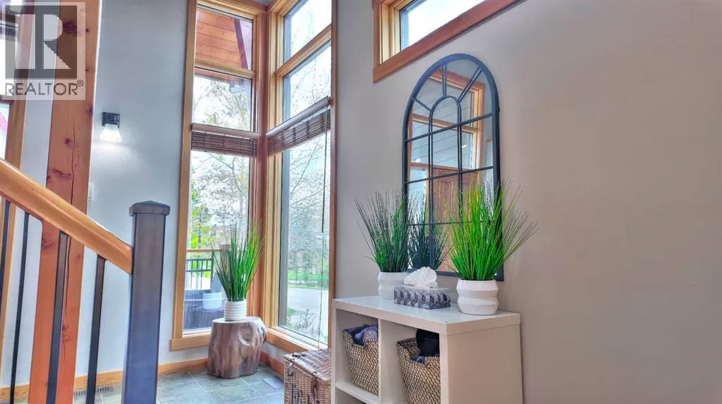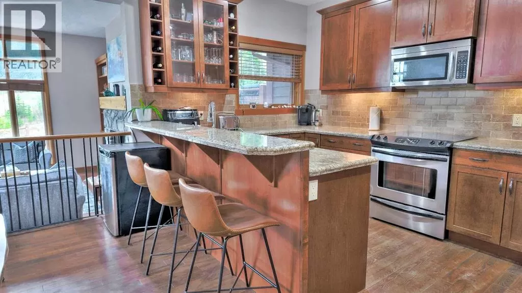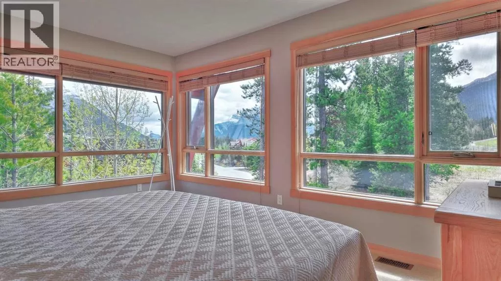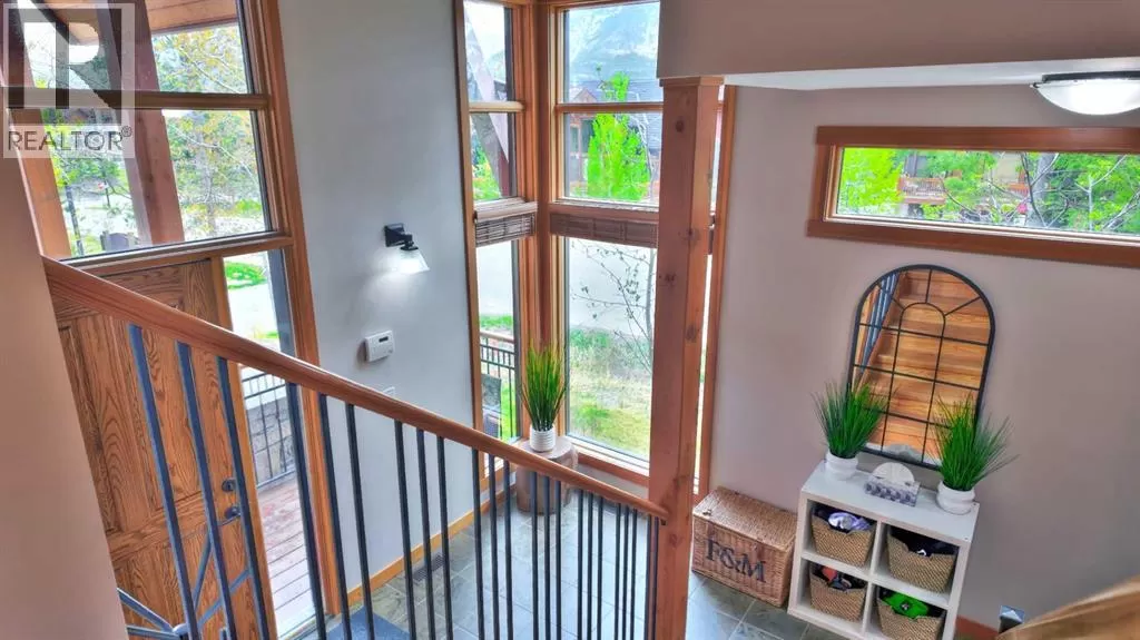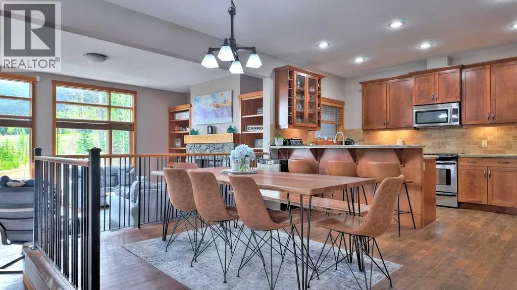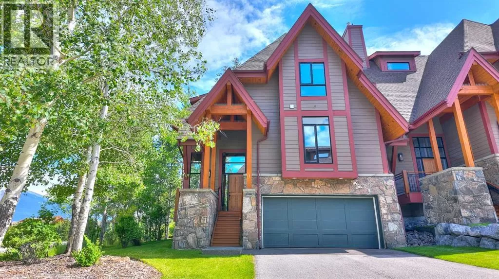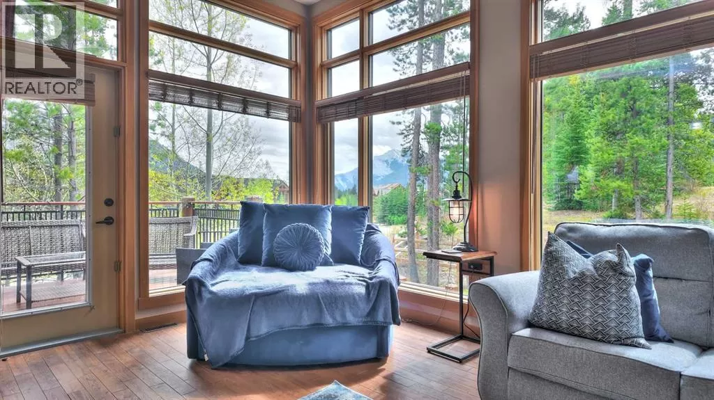 Quick Possession now possible! Welcome to this exceptional multi-level townhome located in a quiet, forest-lined pocket of Canmore, just minutes from Stewart Creek Golf Course. This large 3 bed + den townhouse (This property is upgradable to 4 bedrooms via a different window hinge for the den) totals 2816sqft and is perfectly positioned for both privacy and views, this beautifully maintained home blends warm mountain charm with thoughtful modern upgradesâoffering the ideal base for full-time living or a weekend escape.Step inside to an inviting and highly practical open-concept main floor where rich hardwood flooring and massive windows set the tone. Natural light pours into the living space, where a striking stone-clad natural gas fireplace serves as a cozy focal point for evenings with family or friends. The dining area comfortably fits a large table and opens onto a well-equipped kitchen with granite countertops, stainless steel appliances, and ample cabinetry for storage.Three generous bedrooms plus a separate large den offer comfort and privacy, complemented by three and a half well-appointed bathrooms. The large windows continue throughout, capturing views of surrounding trees and mountain peaks. The lower-level walkout is an ideal flex spaceâperfect as a media room, guest quarters, or a quiet home office retreat.Enjoy outdoor living with both a sun-soaked balcony off the main level and a private, treed patio from the lower level. Bonus features include central A/C for summer comfort, and a spacious double garage (plus 2 more on driveway) complete with built-in storage cabinets and a handy storage nook for gear or a work bench.With easy access to trails, Nordic Centre, and downtown Canmore, this home delivers the mountain lifestyle youâve been waiting forâquiet, scenic, and stylish home. (id:27476)